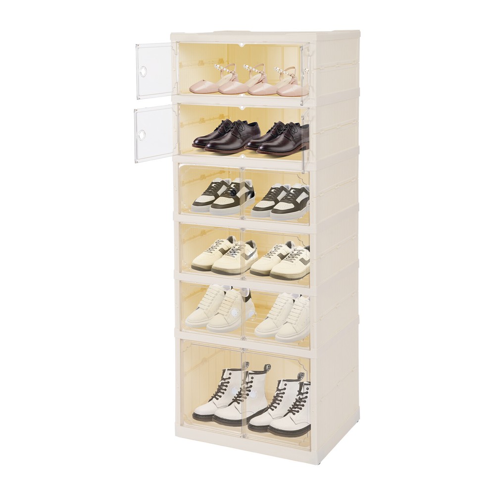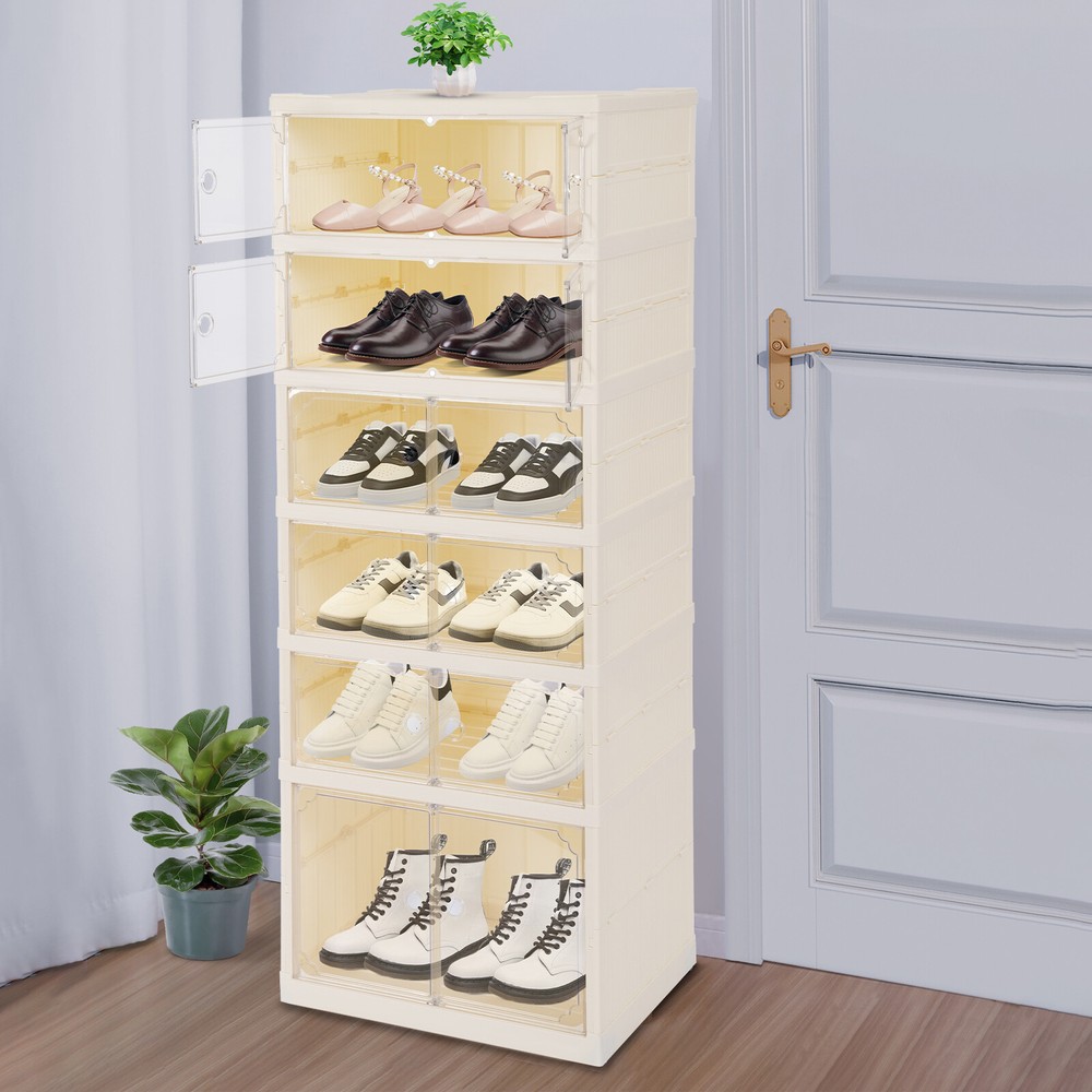 6 Tiers-12 Pairs Shoe Box Foldable Shoe Rack Shoe Storage Organizer with Doors Description In our daily lives, a neat and organized space can make us feel relaxed and happy. The feeling of coming home starts from entering the door and changing shoes. Choose the foldable shoe rack that you like to store your shoes. With its large capacity and elegant appearance, this item makes you feel warm, giving you a sense of pleasure and comfort from the moment you walk in the door. Key Features Last and Durable: It is made of high-quality PP+PET+ABS, which makes this item non-toxic , environmentally friendly , and sturdy, so it can provide good performance for a long time. Storage Assistant: With 6 tiers and wide compartments, there is plenty of space above and below to store shoes or other items in an organized manner, and the platform on top can hold potted plants, lamps, alarm clocks, etc. for a more tidy and warm environment. Thoughtful Design: The double-opening magnetic door makes it easy to access and place your shoes, the clear design allows you to display your shoes well while facilitating positioning for quick access , and the ventilation holes on the back ensure air circulation and prevent moisture from entering your shoes. Excellent Load Capacity: The rectangular construction and high-quality materials ensure that it can hold up to 220lbs, allowing you to place your belongings with confidence. Easy to Clean: The smooth surface and simple structure allow you to easily remove dust an d residues w ith a wet towel. Ready to Go: The product is already assembled, once you receive it, just lay it flat and unfold the skeleton, then pull the panels apart and snap them on to use it, it's very time-saving and convenient! Space-saving: With its compact footprint (17.32*13.58 inches) you can fit it nicely against a wall, and the collapsible design makes it easy to store or take it with you when not in use. Protective Package: To prevent the product from being damaged and bumped during transportation, we packed it with foam to protect your products to the maximum extent possible. Details Practical Wheels: The wheels on the bottom make it easy for you to move the product. Top Panel Depressions: They provide anti-slip protection and also allow you to place umbrellas with confidence. Round Hole: Each door comes with a round hole for you to open and close the cabinet door. Protective Pads: They can prevent the product from scratching your walls or floors and prevent the sharp points of the product from accidentally injuring your family members. Application It is suitable for office, hallway, attic, garage, bedroom, living room, closet or study to store and display your sneakers, flats, high heels and so on. They are also suitable for storing and sorting underwear, socks, scarves, ties, gloves, puzzle sets, stuffed animals, jigsaw puzzles, toy cars, towels, toilet paper, skin care products, cosmetics, files, books or other office supplies such as pens, glue or snacks. Specification Material: PP+PET+ABS Color: Cream White and Yellow Style: Modern Shape: Rectangular Mounting Type: Floor Standing Storage Capacity: 12 Pair of Shoes Number of Tiers: 6 Load Capacity: Within 100kg/220lbs Bottom Tier Height: 30cm/11.8in Height of Each Remaining Tier : 18cm/7.08in Product Size: 44*34.5*118cm/17.32*13.58*46.46in Product Size(Folded): 44*34.5*20cm/17.32*13.58*7.87in Package Size: 45.5*21*37cm/17.91*8.27*14.57in Gross Weight: 6.2kg/13.67lbs Net Weight: 5.4kg/11.9lbs Package Included 1* Foldable Shoe Rack All Accessories for Installation Notes Please note that this product does not include shoes, etc. Please allow the slight color difference caused by the shooting light and 1-3cm error due to manual measurement, and make sure you do not mind before ordering. Payment Delivery details Terms of sales About us Contact us Payment We accept ebay payment 。 Fees such as import duties, taxes are not included in the item price or shipping costs. These charges are the buyer's responsibility. Delivery details Shipping: 2-9 working days to: USA Terms of sales We maintain high standards of excellence and strive for hundred percent customer satisfaction. Feedback is very important to us. We hope that you contact us immediately before you give neutral or negative feedback, so that we can address your concerns. It is impossible to address issues if we do not know about them! About us Your satis faction is our ultimate goal. We work hard to earn your trust and future business. Our certified technicians have tested each item before shipping. The unit comes with 1 year limited warranty on all manufacturing defects. a) If you receive a defective item, you may return it or ask for a discount. Please contact us within 14 days after you receive the package. b) What you returned must be intact and in its original packaging as re? u. Customer is responsible for shipping costs of the returned item. c) We will cover the cost of shipping back t with the shipping rate indicated in the registration page. We will send you a new unit or refund the full payment you paid. Thank you. Contact us Business Hour Business Hour: Monday To Friday: 8:30 AM to 5:00 PM (Beijing China time) Due to time zones, our reply to your questions may not be immediately. But within above working time, we will reply your email within 24 hours. If it's non-workdays, please kindly be patient and wait till Monday. Please contact us with ebay message. Please feel free to contact us if you have any questions. Monday To Friday: 8:30 AM to 5:00 PM (Beijing China time) Due to time zones, our reply to your questions may not be immediately. But within above working time, we will reply your email within 24 hours. If it's non-workdays, please kindly be patient and wait till Monday. Please contact us with ebay message. Please feel free to contact us if you have any questions.