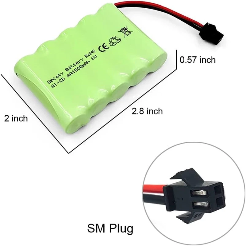 This battery pack is suitable for various applications and can be used with most hobby equipment, such as rc monster truck, electrical tools, electrical toys. This battery pack made of 5 cells high-capacity Ni-Cd AA batteries with perfect performance and long service life. It can be used as a good replacement for damaged or old batteries. Battery pack size: 71 x 51 x 14.5 mm / 2.8 x 2 x 0.57 inch, and built-in SM 2p plug. Please use a special charger to charge the battery, the charging time is about 4-6 hours. Please make sure your device battery is the same size and plug as the picture shows before you buy it. Package contents: 2 pcs 6v 1500mAh nicd rechargeable AA battery pack. Package Contents: 2 x 6v nicd battery pack Cautions: 1. Please turn off the device when low battery to avoid deep discharge. 2. Disconnect the battery with the device when not in use. 3. Never use or charge the battery that has ballooned or swelled, leaks, overheat or anything else abnormal occurs. 4. Never disassemble, puncture, shock or crash the battery, never put the battery into fire. 5. Put the battery at a safe place where infants or kids can not reach. 6. Never overcharge the battery, improper use, such as short circuit or overcharge might cause fire.