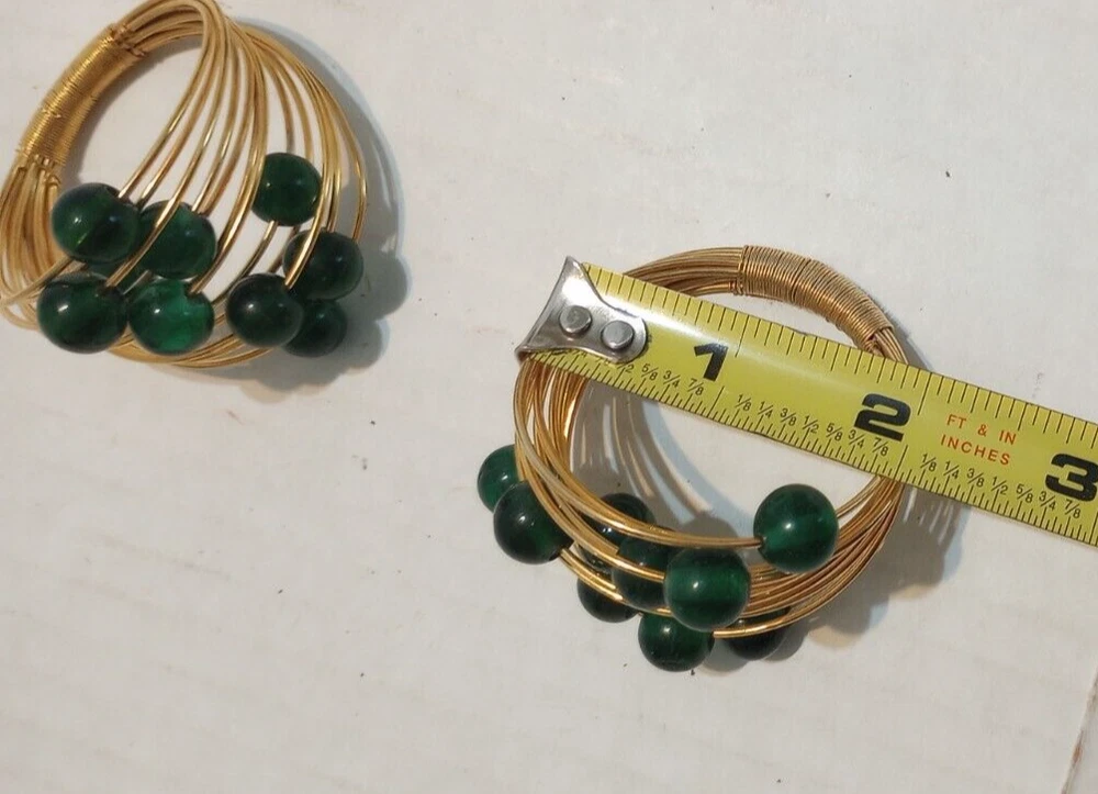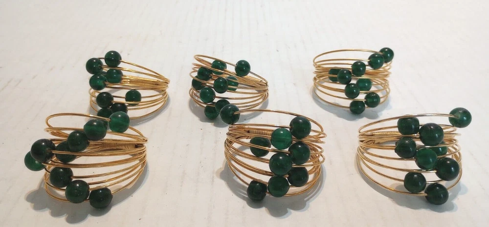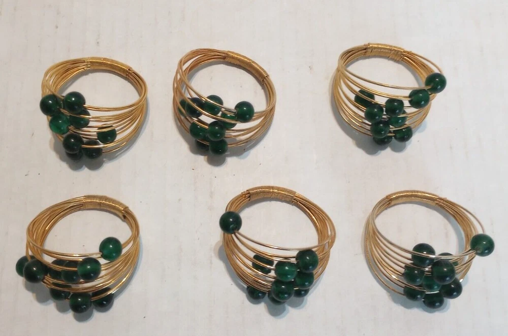 6-Vintage Multi Brass Wire and Green Acrylic Beads Napkin Rings