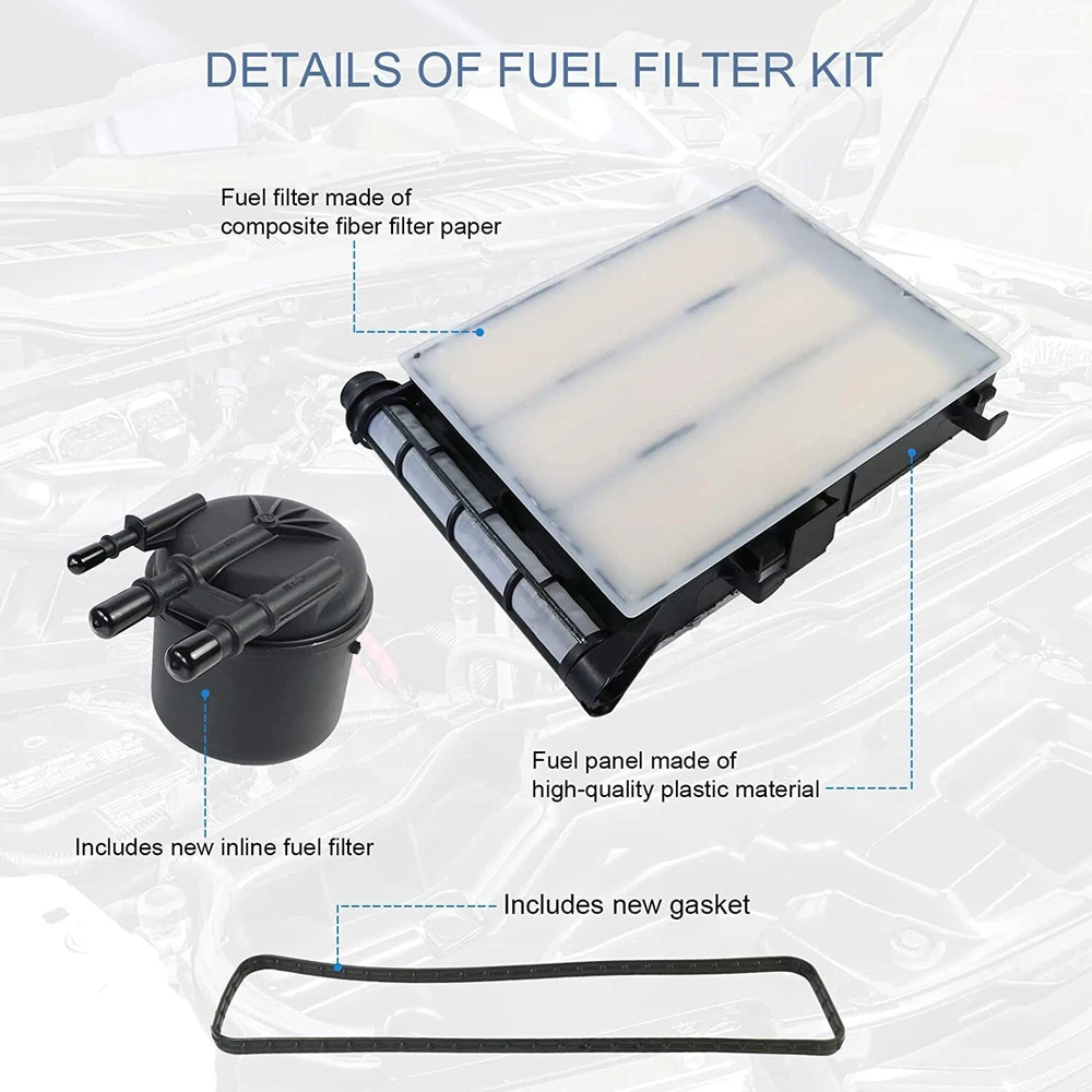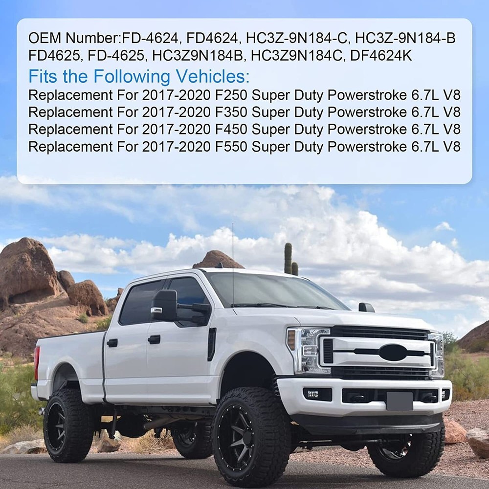 6X Fuel/Water Filter Kit For 6.7L Ford Powerstroke 2017-20 FD4625 HC3Z-9N184-C Item Description FUEL FILTER KIT - If you have problems like engine hard to start, poor engine performance, noisy fuel pump, or check engine light comes on. It's time to make a replace a new Fuel Filter, Our item meets the optimal fuel flow requirements of modern diesel engines, ensuring that the system is free of contaminants and water. With 98% water separation efficiency, can effectively filter impurities COMPATIBLE WITH FOLLOWING VEHICLES - 6.7 Powerstroke fuel filter element kit fit for 2017-2020 Ford V8 Diesel,including 2017-2020 Ford F-250 Super Duty ,2017-2020 Ford F-350 Super Duty, , please check the fitment in the product description below. REPLACE PART NUMBERS - HC3Z-9N184-B, HC3Z-9N184-C, FD-4624, FD-4625, HC3Z9N184B, HC3Z9N184C, FD4624, FD4625, commonly found on 6.7L Powerstroke V8 Diesel Ford models, including 17- 20 Ford F250 Super Duty & F350 Super Duty, Please check the part numbers whether it suits your vehicle before purchasing. OEM DESIGN & DIRECT FIT - Quality materials & advanced technology used, meets or exceeds OEM standards. Even though this is not a genuine Ford fuel filter, but it works even better and lasts longer. Save yourself times and money by replacing fuel filter on your Ford 6.7L Powerstroke yourself. BUY WITH CONFIDENCE - all products have been 100% tested before delivery, If you have any problem with our tailgate lock latch actuator for Ford F150 F250 F350, feel free to contact us, we will sort things out together. When to Change My Diesel Fuel Filter? Diesel fuel filters don’t usually last as long as gas filters. For most Diesel trucks, it is recommended that you replace your fuel filter every 10,000-25,000 miles depending on how you drive. If you don’t change your fuel filter when recommended to, there is a very high chance the filter will become clogged with debris. Which means it can no longer filter all the fuel. Thus can result in your vehicle not getting clean fuel into the engine and will damage the vehicle’s engine and injectors over time. Choose MNJWS Fuel Filter Element Kit for your beloved 6.7 Powerstroke engine, helps prevent stalling, poor starting and potential engine failure. High-grade filter medium Can effectively filter out harmful particles, moisture and impurities in gasoline. Unique Quality Crafted from high quality material to provide long operating life and excellent performance. OEM design OEM design helps ensure a solid, positive connection. End-Of-Line Testing Has undergone a rigorous test to ensure high quality and reliability. Installation Tips 1.Put a Oil drum under the fuel filter housing. 2.USE a socket wrench to leak some fuel. 3.Unscrew the cap with the old filter 4.Drain the residual water and oil from the old filter. 5.Remove the old filter from the filter. 6.Clean the fuel filter housing cap. 7.Change the provided O-rings,and change the filter. 8.Screw the combination of the new filter and cap onto the housing with the wrench. 9.Reset the fuel filter indicator,press and hold the “select” button until you get a beep,cycle the key,then done. Fitment For 6.7 Powerstroke Diesel Engine For 2017-2020 Ford F-250 Super Duty For 2017-2020 Ford F-250 Super Duty Please Double-Check that this is compatible with your vehicle. Replace Part # Ford HC3Z-9N184-B Ford HC3Z-9N184-C FD-4625 FD-4624 FD4625AA Package Included 6 Set of Fuel Filter Element Kit As pictures show FAQ: I purchased by mistake, how do I cancel the order? Please contact us ASAP. If the item has not been shipped out we can cancel the order for you. If the item was shipped out you can refuse the package and wait for the item to return to us. I received your item but it does not fit or is defective Please contact us so we can assist you on the matter. Buy with confidence Our quality is based on meeting the requirements of the manufacturer and improvement them in design problems manufacture. NOTE: (1)It would be highly appreciated if you might contact us first once you have any problems concerning the items. And you can expect all the issues would be resolved ASAP! (2)Please let us know before you send us the neutral/negative feedback that wont help to finish the issues. And I will definitely try my best to provide the best solutions which would meet our satisfactory! (3)According to the distance of the receipt address items would be sent from CA or NJ