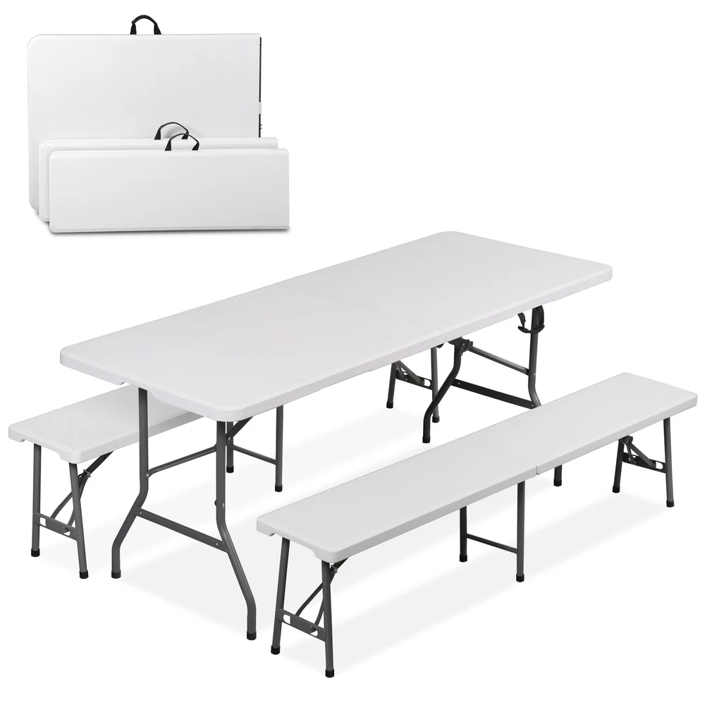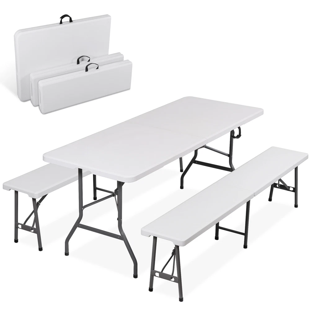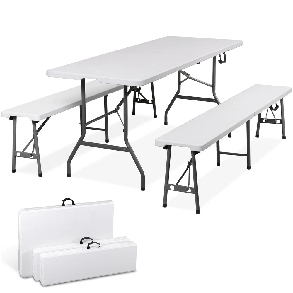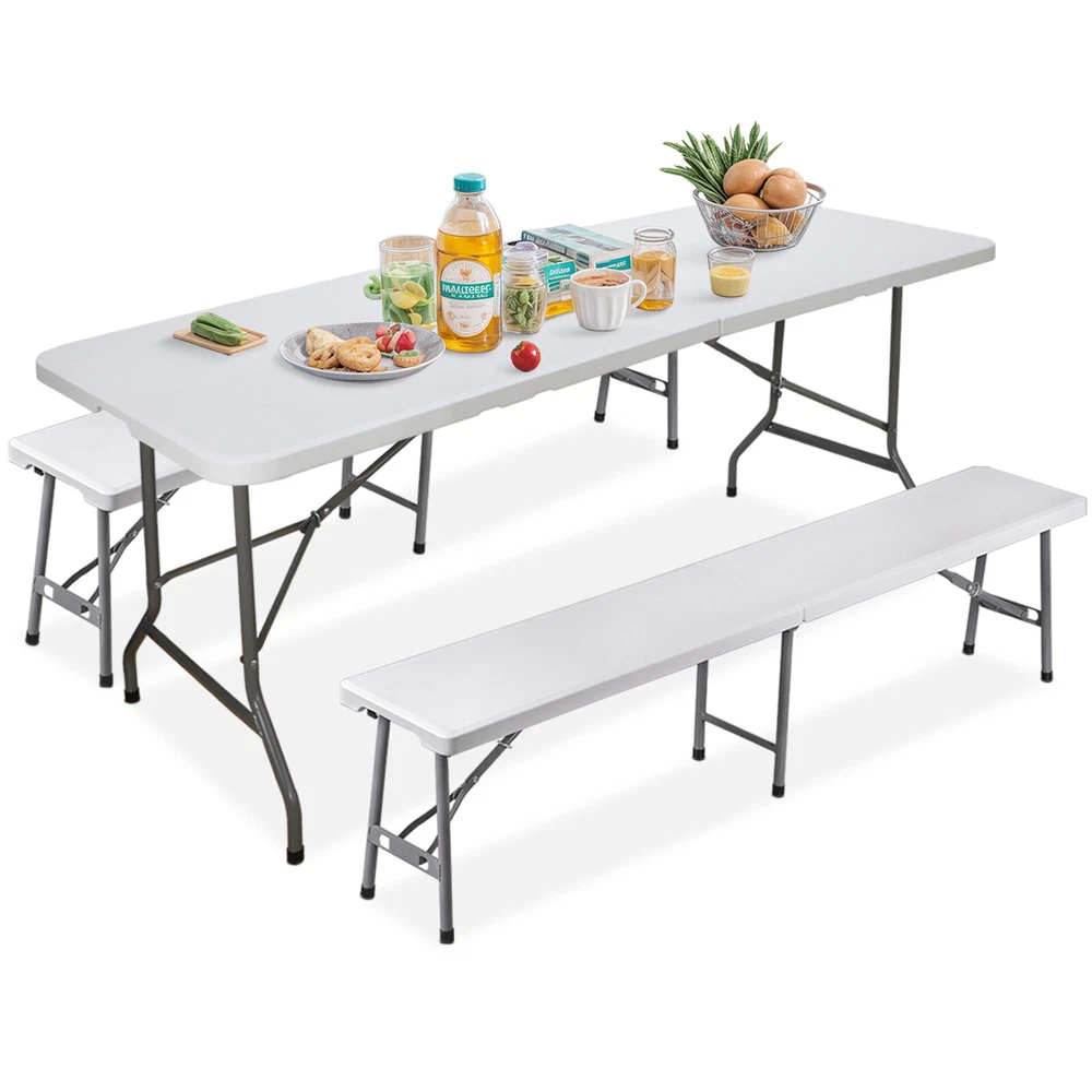 Ideal for family reunions, picnics, camping trips, buffets or barbecues. This table is great for entertaining and can be used as a serving table, game table, or outdoor dining table. Its collapsible design makes it quite space-saving. The high quality resin surface is waterproof, scratch, and impact resistant; making it perfect for all types of activities. Light grey powder-coated steel tube framing provides strong long-lasting use and lightweight portability The table legs fold under the table to make storage more convenient and for better portability. Specifications: Product size: 70.9"*27.4"*28.6" Product Weight: 11.6kg/25.6lbs Material: HDPE high density polyethylene The metal part is stainless steel plastic spraying 6FT Plastic Folding Bench Features: Quality Material & Easy to Clean: The portable outdoor folding bench is made of great material, which is waterproof, weather resistant, making it suitable for outdoor use. You can easily clean the panel. Safety Lock Ring & Non-slip Mat: The legs of the bench are secured with a locking ring design, while the triangular structure enhances overall safety and stability. The bottom of the folding stool has non-slip pads to prevent tilting. Folding & Portable: The bench is folded in half and has an internal snap design to prevent it from opening easily in transit. It does not occupy any space and has a handle on the top, which can be opened and used anytime and anywhere. And this camping dining seat is no assembly required, more convenience for you. Thickened Panel & Good Bearing Capacity: Our folding bench is thickened and supported by heavy steel pipe, making it more sturdy. It can hold up to 660 pounds, and the maximum number of people it can hold is: 4-5 people. Suitable for Indoor & Outdoor: Our benches have a wide range of ap plications and are ideal for any venue such as courtyards, gardens, parties, weddings, exhibitions, barbecues, potteries, etc. Specifications: Color: White Material: HDPE+Metal Item Weight: 17.52lbs Folding Size: 36.1"L* 12"W* 3.3"H Unfolded Size: 72.3"L*12"W*17"H Seat Tickness: 1.57" Weight Capacity: 661lbs