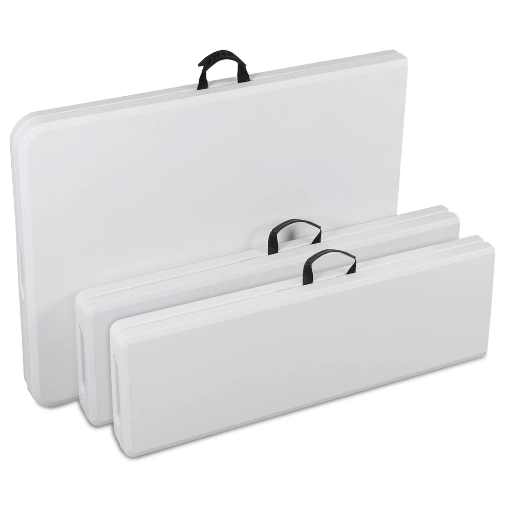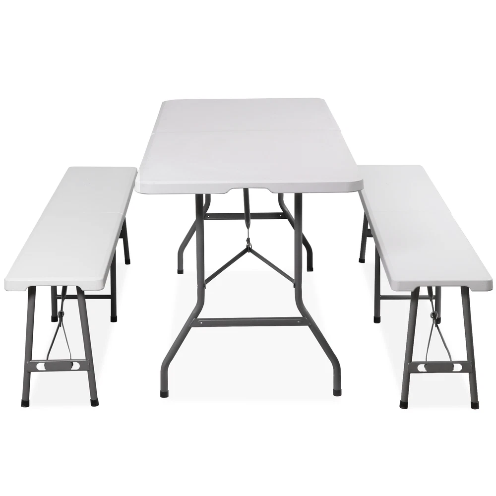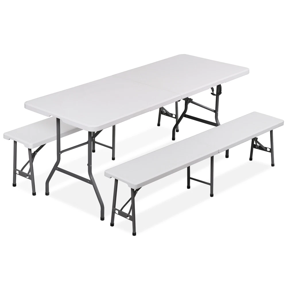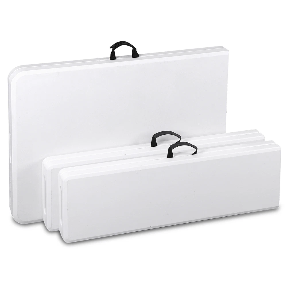 Ideal for family reunions, picnics, camping trips, buffets or barbecues. This table is great for entertaining and can be used as a serving table, game table, or outdoor dining table. Its collapsible design makes it quite space-saving. The high quality resin surface is waterproof, scratch, and impact resistant; making it perfect for all types of activities. Light grey powder-coated steel tube framing provides strong long-lasting use and lightweight portability The table legs fold under the table to make storage more convenient and for better portability. Specifications: Product size: 70.9"*27.4"*28.6" Product Weight: 11.6kg/25.6lbs Material: HDPE high density polyethylene The metal part is stainless steel plastic spraying 6FT Plastic Folding Bench Features: Quality Material & Easy to Clean: The portable outdoor folding bench is made of great material, which is waterproof, weather resistant, making it suitable for outdoor use. You can easily clean the panel. Safety Lock Ring & Non-slip Mat: The legs of the bench are secured with a locking ring design, while the triangular structure enhances overall safety and stability. The bottom of the folding stool has non-slip pads to prevent tilting. Folding & Portable: The bench is folded in half and has an internal snap design to prevent it from opening easily in transit. It does not occupy any space and has a handle on the top, which can be opened and used anytime and anywhere. And this camping dining seat is no assembly required, more convenience for you. Thickened Panel & Good Bearing Capacity: Our folding bench is thickened and supported by heavy steel pipe, making it more sturdy. It can hold up to 660 pounds, and the maximum number of people it can hold is: 4-5 people. Suitable for Indoor & Outdoor: Our benches have a wide range of ap plications and are ideal for any venue such as courtyards, gardens, parties, weddings, exhibitions, barbecues, potteries, etc. Specifications: Color: White Material: HDPE+Metal Item Weight: 17.52lbs Folding Size: 36.1"L* 12"W* 3.3"H Unfolded Size: 72.3"L*12"W*17"H Seat Tickness: 1.57" Weight Capacity: 661lbs