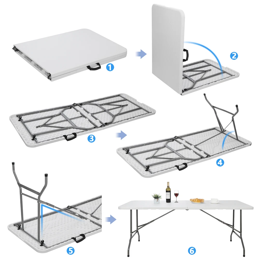 This folding table is a game-changer for outdoor gatherings! Super lightweight yet sturdy, it’s perfect for picnics, BBQs, or even as a quick serving station. The waterproof surface wipes clean easily, and the fold-in-half design makes storage a breeze. Love the built-in handle for carrying—super convenient for camping or tailgating. The steel frame feels solid, and the neutral color fits any setting. Highly recommend for anyone who needs extra table space without the bulk!