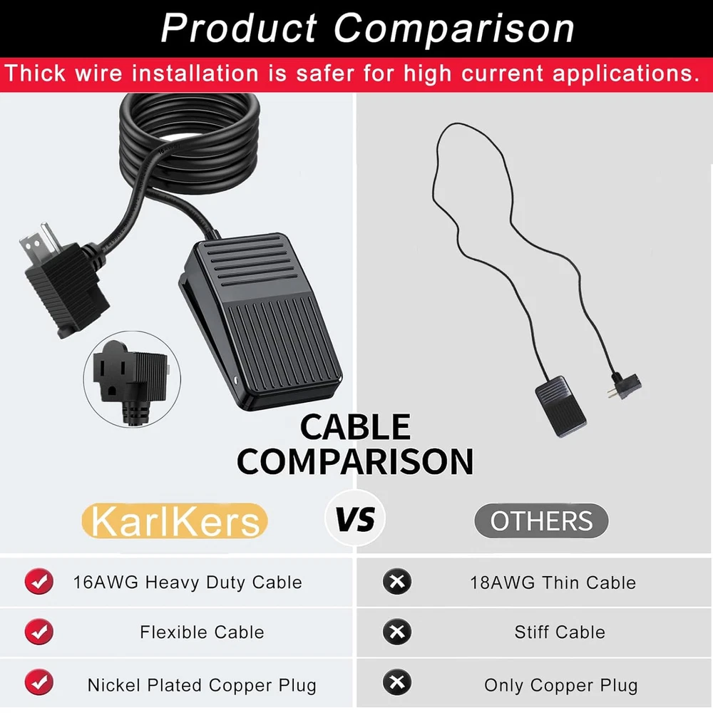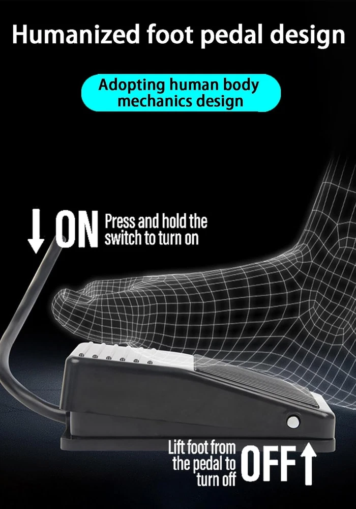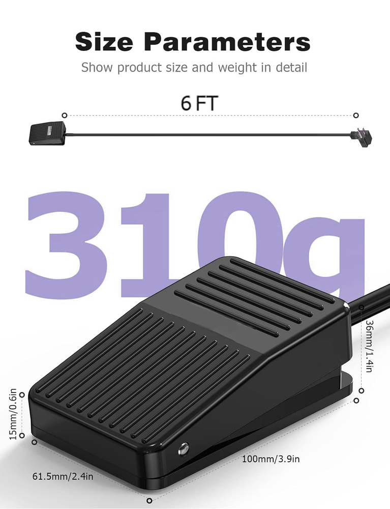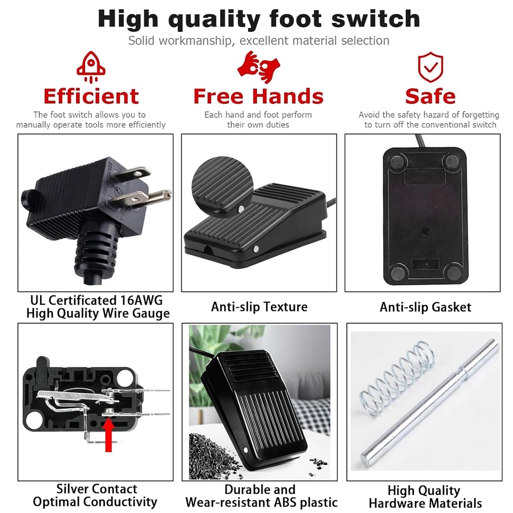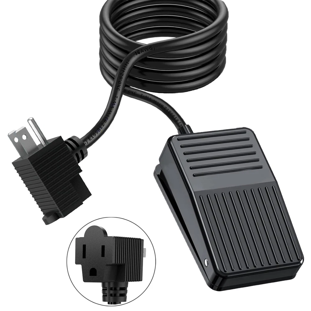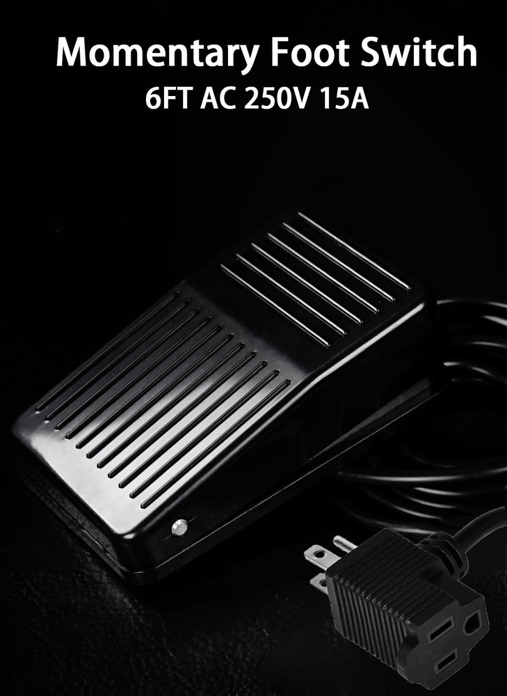 【PLUG AND PLAY】: Simply Plug the 3-prong power cord into a grounded 110V~250V power socket, and then plug the machine or tool into the 3-prong socket on the back of the plug. This switch features a 6-ft cable with a piggyback plug for easy setup and operation. 【WORKING PRINCIPLE】: This is a momentary foot switch, which means that it turns your product on when your foot is on the pedal, and turns it off when you release your foot from the pedal. There is a "click" sound when pressing and releasing. One advantage of this working mode is that free your hands, save the time on frequent switching equipment, improve work efficiency, and greatly improve the safety at work. Please note that this switch does not provide variable speed control, it just turns the power on and off, but is compatible with variable speed equipment. 【HIGH QUALITY】: The foot pedal switch uses 16AWG high-gauge wire, it has stronger load capacity compared to 18AWG cable, which can actually carry a current of 15 amps and a voltage of 110~250 volts, safer and more reliable. The cable is UL listed (clearly visible at the body and plug). The cord is flexible so it won't cause the pedal to flip from side to side. Cable length 6FT, rated current 15A, rated voltage 250V. The foot control switch features ABS plastic casting, ensuring durability and longevity. It has an electrical life of over 300,000 cycles. 【SENSITIVE AND ANTI-SLIP】: Front pivot reduces user fatigue, 3 plastic points support the pivot very stably, even if you press the border, the foot switch can be activated easily. With a textured pedal anti-slip design, making operation more efficient and sensitive. The switch base is equipped with a non-slip mat to help prevent slippage during operation. The 3-prong plug is also designed with anti slip stripes, making it easier to plug and unplug, labor-saving and safe. 【WIDELY APPLICATION】: Can be applied to woodworking tools, power tools, wood carving machines, sewing machines, textile tools, routers, sanders, drill presses, scroll saws, meat grinders, musical instruments, dental equipment, and lighting and other household appliances. 12 months warranty, 24/7 free technical support service, 100% customer satisfaction service. .【PLUG AND PLAY】: Simply Plug the 3-prong power cord into a grounded 110V~250V power socket, and then plug the machine or tool into the 3-prong socket on the back of the plug. This switch features a 6-ft cable with a piggyback plug for easy setup and operation. 【WIDELY APPLICATION】: Can be applied to woodworking tools, power tools, wood carving machines, sewing machines, textile tools, routers, sanders, drill presses, scroll saws, meat grinders, musical instruments, dental equipment, and lighting and other household appliances. 12 months warranty, 24/7 free technical support service, 100% customer satisfaction service.
