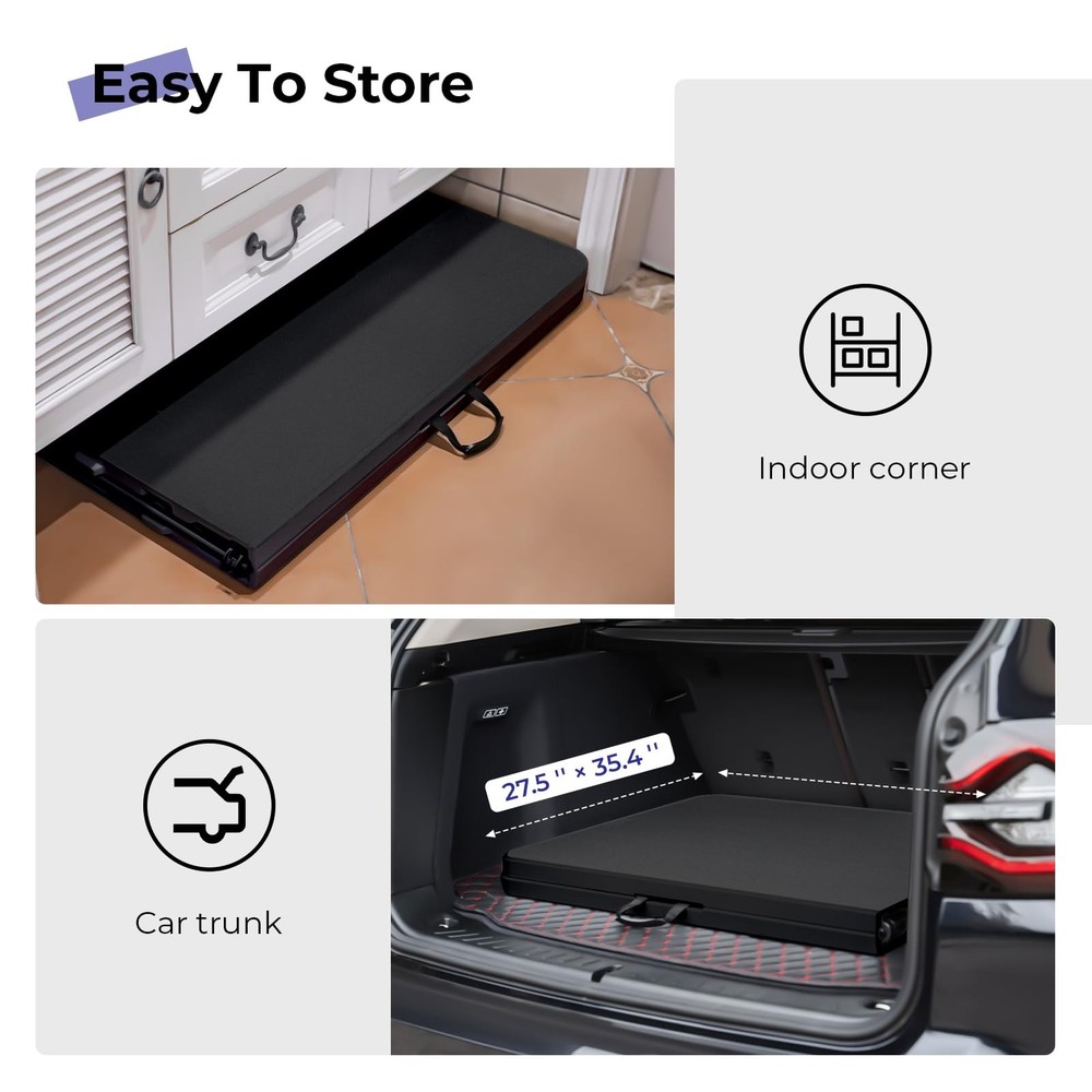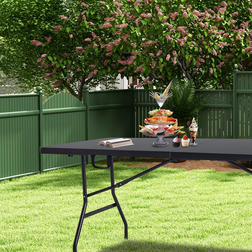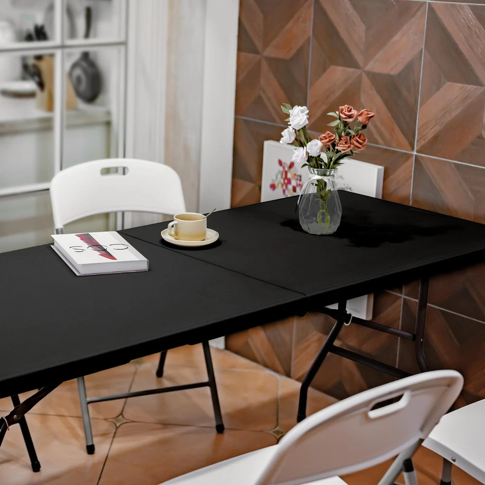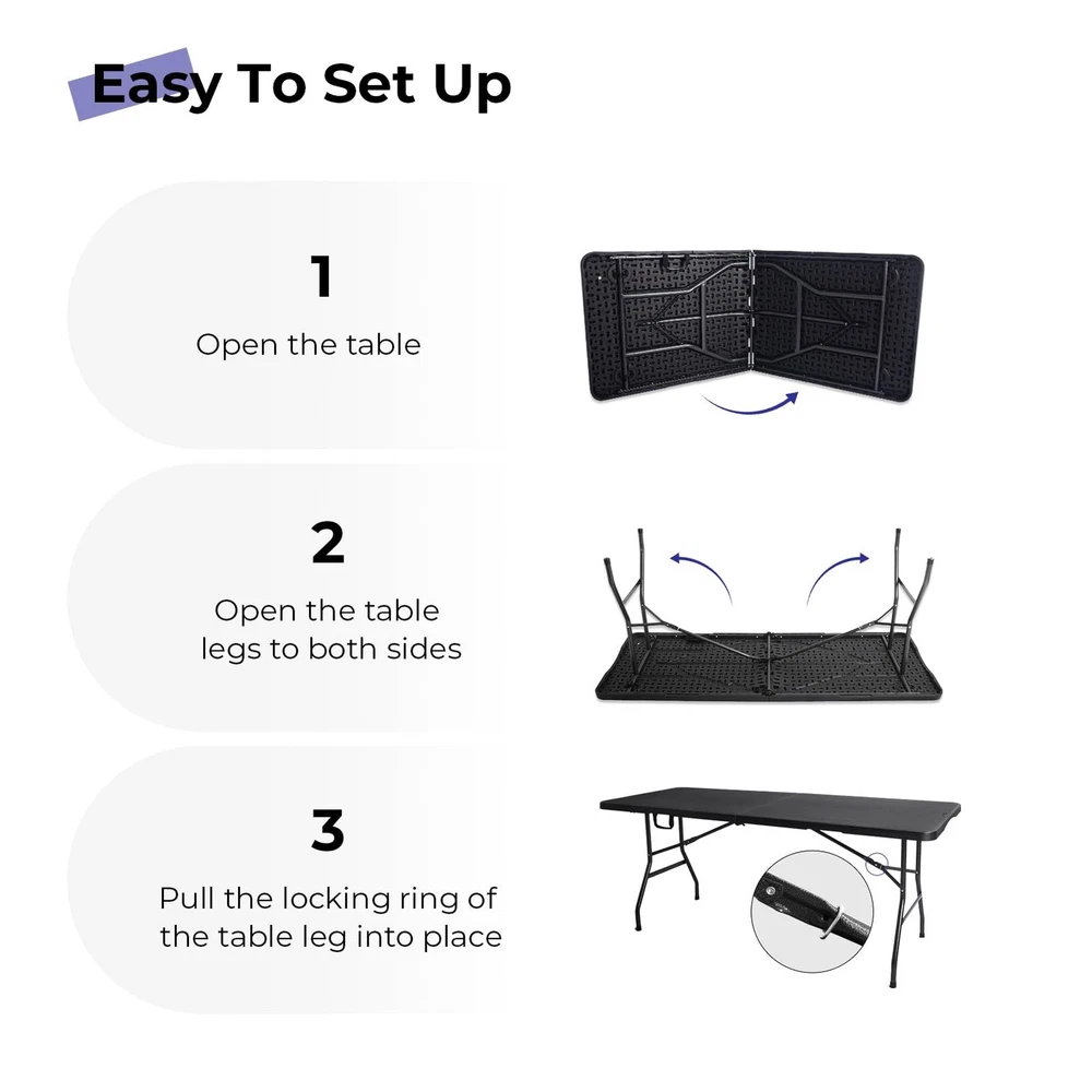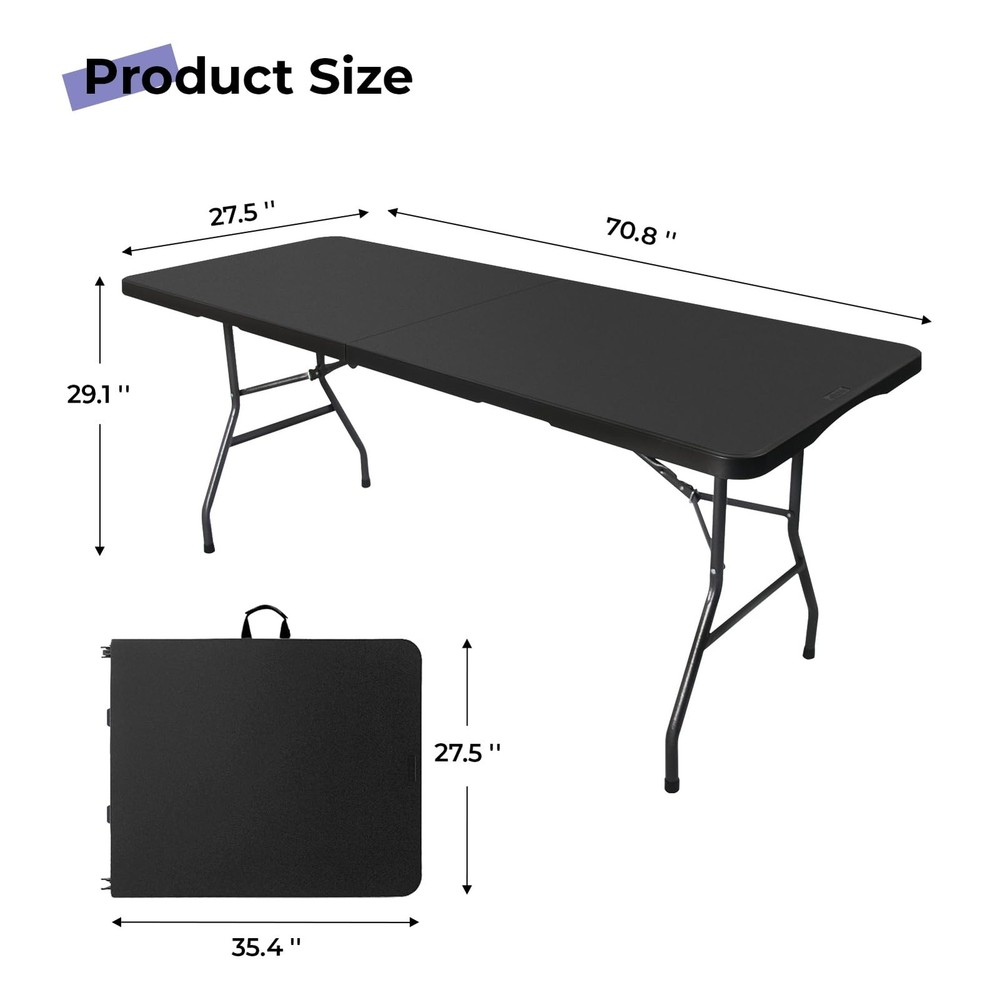 Product Specifications: Color: Black Material: High Density Polyethylene (HDPE) Folded Dimensions: 35.4" L x 27.5" W x 3" H Expanded Dimensions: 70.8" L x 27.5" W x 29.1" H Weight: 26lb Number of users: 6~8 people Features: This black folding table 6ft Constructed from HDPE plastic and black powder-coated steel pipe for Extreme hardness and durabilit. No assembly required, opens and folds in seconds Gravity lock keeps table legs open when upright Anti-slip feet effectively protect the floor. Our portable 6 foot folding tables fold in half and have convenient handles for easy transport and storage Simple appearance, suitable for indoor and outdoor, perfect for garden, beach, party, picnic or camping Instructions for use: Step 1:Open the table Step 2: Open the table legs and buckle the gravity lock Step 3: Stand it up, and you are all set! Tips:High temperature and open flame will damage our folding table, please use it carefully~ RUGGED AND STABLE: This folding table 6ft is made of high-density polyethylene (HDPE), thicker and harder, have better quality. The desktop of the foldable table is waterproof and not easy to scratch.The soft beveled radius edge is designed for safe FOLDABLE AND PORTABLE: portable 6 foot folding table can be folded in the middle, buckled with a safety buckle, safe and easy to store. There is a comfortable handle on the edge of the plastic table, more convenient to carry. Easily fits in the car trunk STRONG SUPPORT: Powder-coated steel legs and gravity locks help to completely fix the outdoor folding table at any time & place. In addition, the legs are also equipped with non-slip foot covers, which can not only protect your floor but also prevent slipping.The Maximum Weight of the table is 330 pounds, please do not exceed this weight PRACTICAL AND LIGHTWEIGHT: 6ft fold up table weighs 26 pounds, the unfolded size is 70.8" L x 27.5" W x 29.1" H; the folded size is 35.4" L x 27.5" W x 3" H. It requires no assembly and sets up or folded in minutes. Comfortably seating 4-6 adults MULTI-PURPOSE: Very suitable for outdoor picnic or birthday party table, banquet tables, dining fold out table, barbecue portable table, game table, or as a foldable dining table, display plastic folding table, study table or desk for indoor activities