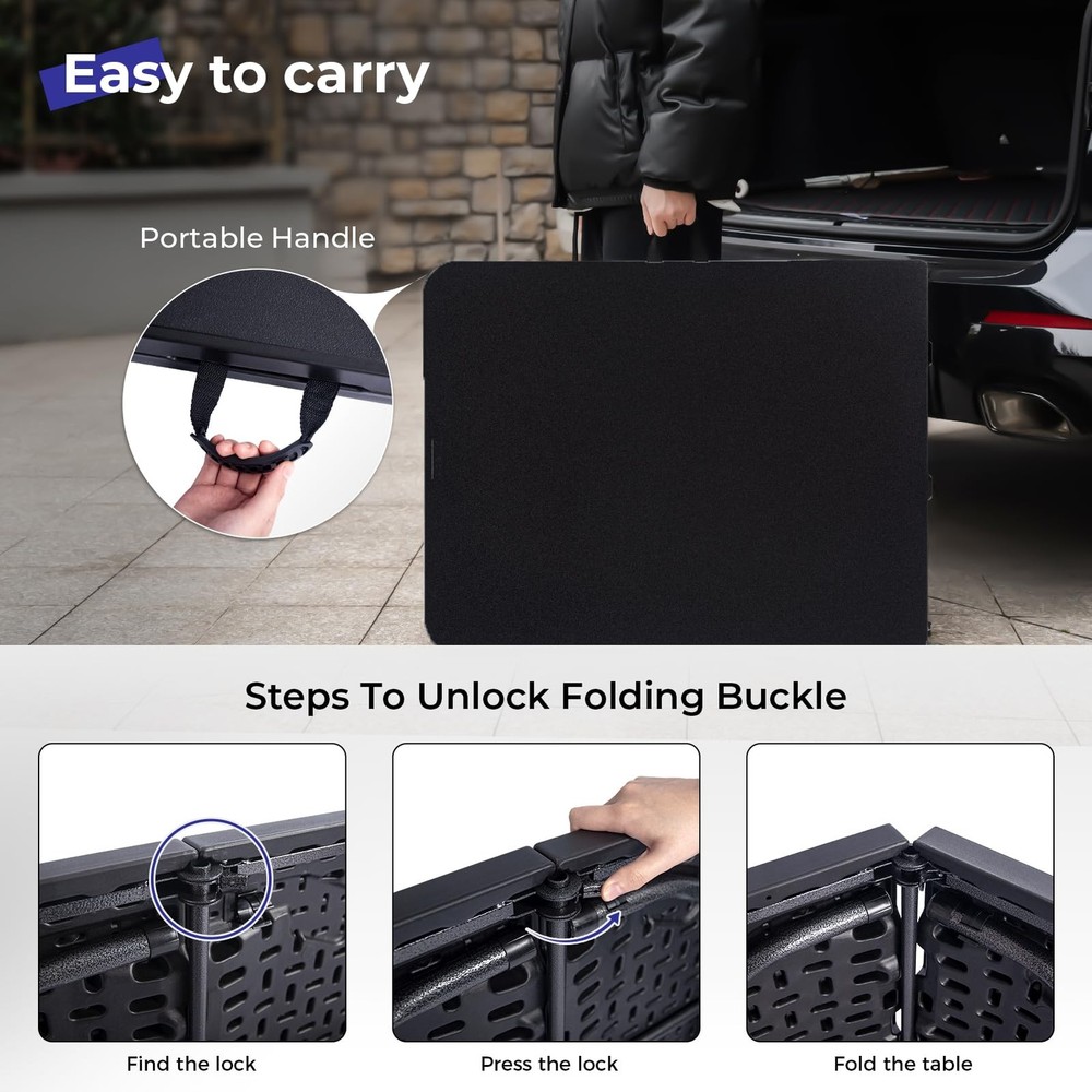 This folding table is a game-changer! Super sturdy and easy to set up—just unfold and it's ready in seconds. The HDPE top is tough and wipes clean easily, while the steel frame keeps it rock-solid. Love the anti-slip feet and gravity lock for safety. Perfect for parties, picnics, or extra workspace. Lightweight yet holds up to heavy use. No assembly needed—huge plus! Folds flat for compact storage. Highly recommend for anyone needing a reliable, portable table!