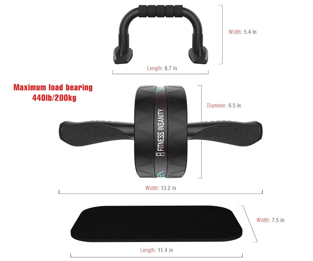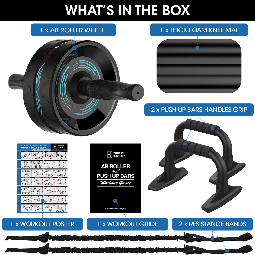 Ultra-Wide Roller Ab Wheel with Knee Pad – Our wheel is 3” width, holding up to 600lb. Made of durable non-slip rubber and strong stainless steel that ensures stability and comfort for your workouts, silence, never damage carpet or wood floor. Thicker knee pad is made of NBR material for providing extra comfort and protect your knees from getting hurt. Full Body Workout – Strengthen and tone your abdominal muscles, shoulders, arms, and legs with this premium quality home gym equipment. Each repetition of the rollout exercise works various muscles targeting your abs, hip flexors, shoulders, and back. It will not only help improve you lower back strength but decreases your risk of muscular injury. Complete Exercise Accessories – Included in the package are 1 AB Roller, 2 Push Up Bars, 2 Resistance Bands, 1 Thick Foam Knee Mat, 1 Workout Guide, and 1 Workout Poster. Superior Quality – The ab wheel is made of strong stainless steel, non-slip TPR and durable PVC. Ensure safety and comfort, silence. Never damage wood floor or carpet. 100% Satisfaction – If, for any reason, you are not happy with the quality or performance of these ab roller wheel, let us know anytime and we will be glad to straighten things out for you.