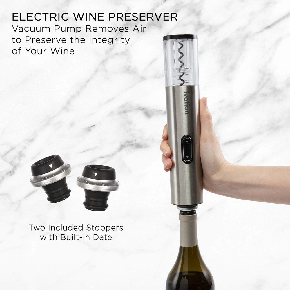 Cheers to the ultimate wine gadget collection! Discover a superior sipping experience with this all-in-one Wine Gift Set from . Featuring all the tech-savvy essentials you need to savor each glass to the fullest, our complete kit arrives with an automatic wine opener, electric vacuum preserver, aerating pourer, date-stamped stoppers and other goodies just waiting to be discovered. Whether you’re shopping for a birthday, anniversary, Christmas or another special occasion, sleek lines and sophisticated stainless steel make the perfect present for wine-loving men and women alike. Just pick up a nice bottle of white or red, and add this Wine Gift Set from to your cart today! Coordinated Collection With so many gadgets available on the market, wine enthusiasts will adore this convenient all-in-one gift set. Our sommeliers have assembled the ideal mix of items designed to enhance every oenophile’s tasting and serving experience, whether beginner, intermediate or advanced. Easy Automated Opening The set’s bi-directional corkscrew extractor seamlessly catches and removes up to 30 stoppers on a full charge, so there’s never a stuck or broken cork. No more twisting, turning and pulling—just easy one-touch button operation. You can even watch the device in action via the integrated viewing window. Electric Vacuum Pump Our unique preservation system sucks air from the open bottle, extending the life of your red, white or rosé so not a single sip ever goes to waste. Two stoppers also provide an airtight seal for maximum freshness. Just set the built-in date function to keep a close eye on the bottle’s age. ALL-IN-ONE DELUXE WINE GIFT SET | Wine Lover’s Collection Arrives With Everything You Need to Enhance, Preserve, Pour & Enjoy Your Favorite Red, White or Rosé Variety | Includes Electronic Opener, Preserver, Aerator Pourer & More ELECTRIC CORKSCREW EXTRACTOR | Stainless Steel Touch-Button Opener Captures & Removes Up to 30 Corks on a Full Charge with Simple Up/Down Operation | Features Convenient See-Through Window for Easy Viewing VACUUM PRESERVER & STOPPERS | Built-In Electric Wine Pump Extends Wine’s Freshness by Removing Air from Open Bottle & Sealing with Special Date-Stamped Stoppers [Set Includes 2] | Just Press Down to Preserve in Seconds! BLUE LED CHARGING STATION | Sleek, Sophisticated Power Dock Keeps All Your Accessories Organized While Charging Gadgets When Not in Use | Perfect for Home Wine Bar, Kitchen Counter, Man Cave, Wine Cellar, Travel & More BONUS AERATOR & FOIL CUTTER | Complete Set Features Premium Aerating Pourer for Enhanced Flavor, Aroma & Pour Precision | Razor-Sharp, Comfort-Grip Cutting Tool Allows for Easy Foil Removal—No Dangerous Knives Necessary!