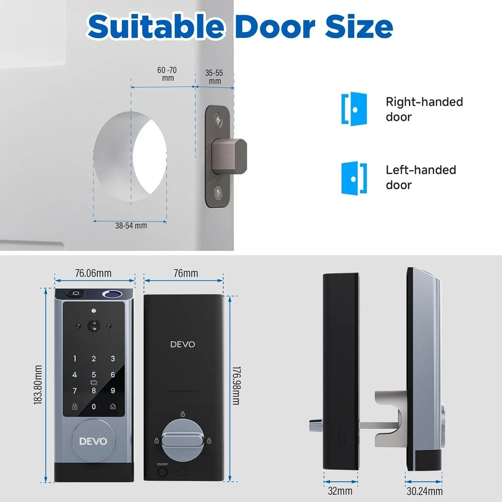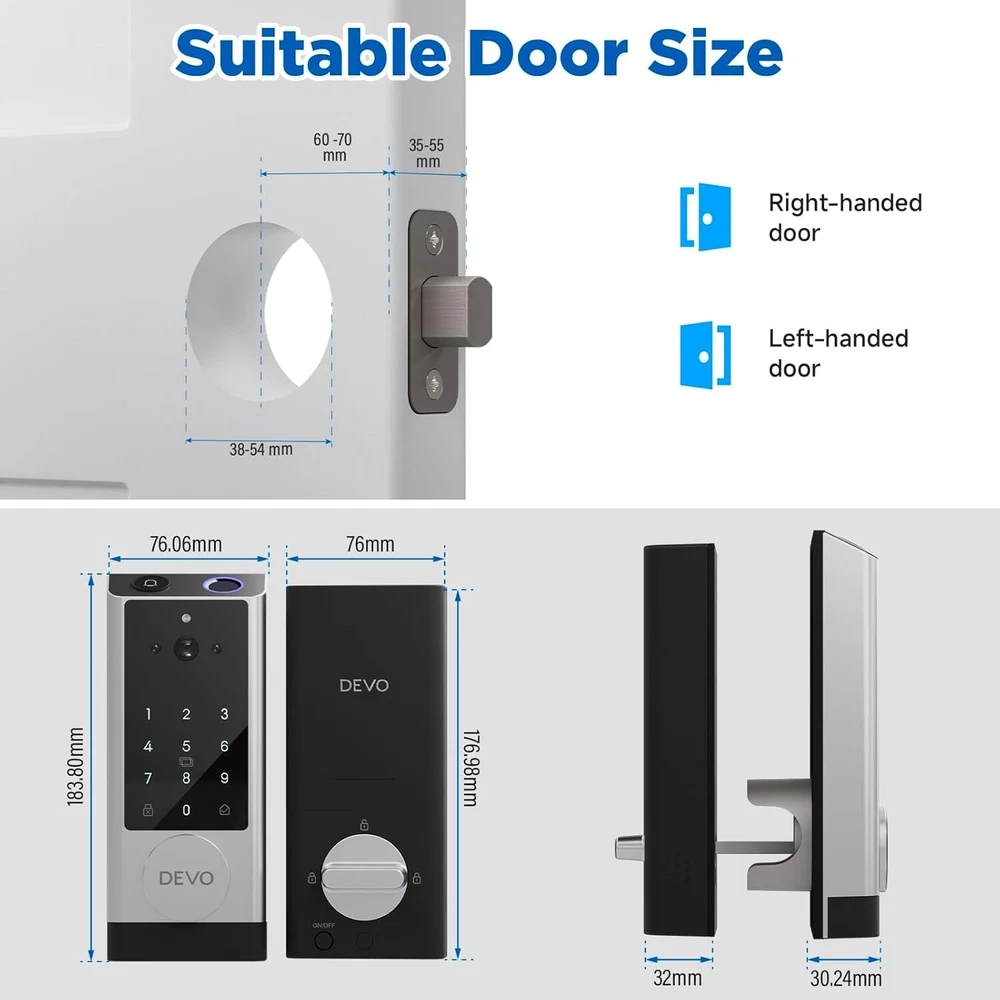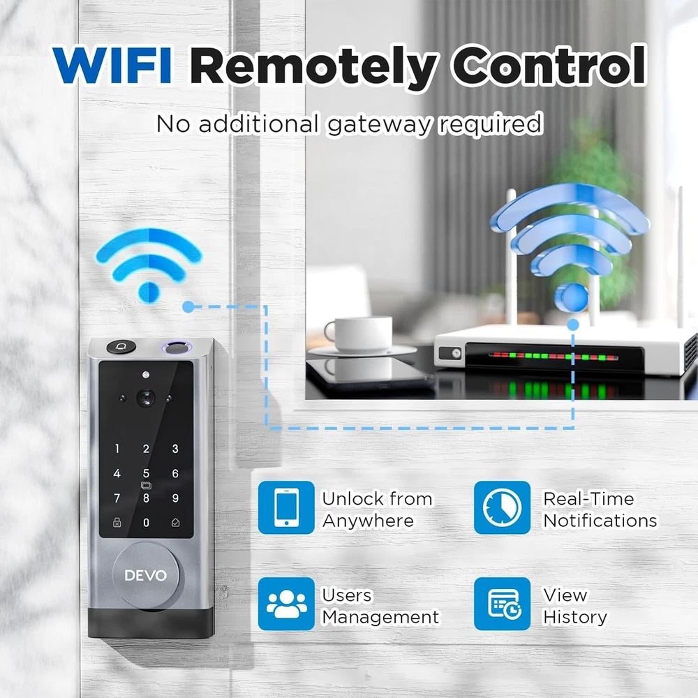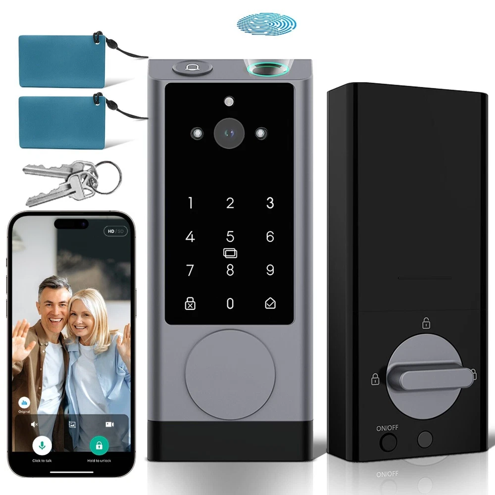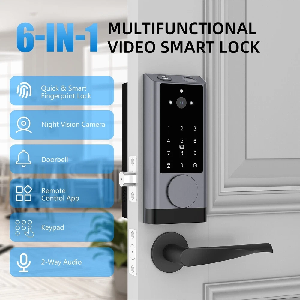 The 6-in-1 Upgraded Smart Lock is a keyless entry electronic lever door lock that allows you to program up to 30 user access codes that can be customized for family, friends or guests. It is easy to install, program and use, and it also features smart key security as a backup key slot. This entry lever can be locked or unlocked using a keypad or key on the outside and a rotary button on the inside. Combine the convenience of keyless entry with the highest residential security ratings and leading designs and finishes to enhance any door in your home. Perfect for a home office, storage room or interior garage door, the 6-in-1 Upgraded Smart Lock provides the right access solution to make your life more convenient, stylish and secure. Our smart locks are available in two styles - traditional and modern to match your home decor. In addition to this, our smart locks are available in three colors: Metallic Black, Premium Gray, Silver Gray. 【Wi-Fi Enabled】:6-in-1 Smart lock is a Wi-Fi-enabled door lock that connects directly to your home Wi-Fi network and smartphone for a secure smart home that does not require a third-party smart home hub, panel, or subscription 【APP Remote control】 Tuya APP, support Google Assistant, Amazon Alexa,Support remote unlocking and authorization, convenient for managing visitors or temporary users,Increase convenience.Receive notifications of your lock's activity and view the lock event history from your smartphone using the app for easy query and management 【Improve security】: Multiple unlocking methods (such as fingerprint, password, mobile phone App, etc.) Intercom, human body detection, automatic capture and upload to APP, automatic lock (timed anti-lock). Independent door Bell button, approach light reminder, automatic recognition of left and right door opening,reduce the safety hazards of traditional keys 【Multi-user management】: Support fingerprint, password or mobile phone authorization for multiple users, convenient for family members or employees,Switch between three entry modes: Multiple locking settings include ""Auto Lock"" (locks after every entry and exit), ""Passage"" (stays unlocked and no key or code required), and ""Disable Passage"" (for property managers, auto-locks every time and a key or code is always required for entry). 【SecureScreen&Digit Keypad&】Patented security feature for touchscreen deadbolts that prevents on-screen fingerprint user code identification by employing random digits prior to entering a personal user code,eypad deadbolt is backlit and comes with a dedicated one-touch locking button for keyless convenience"