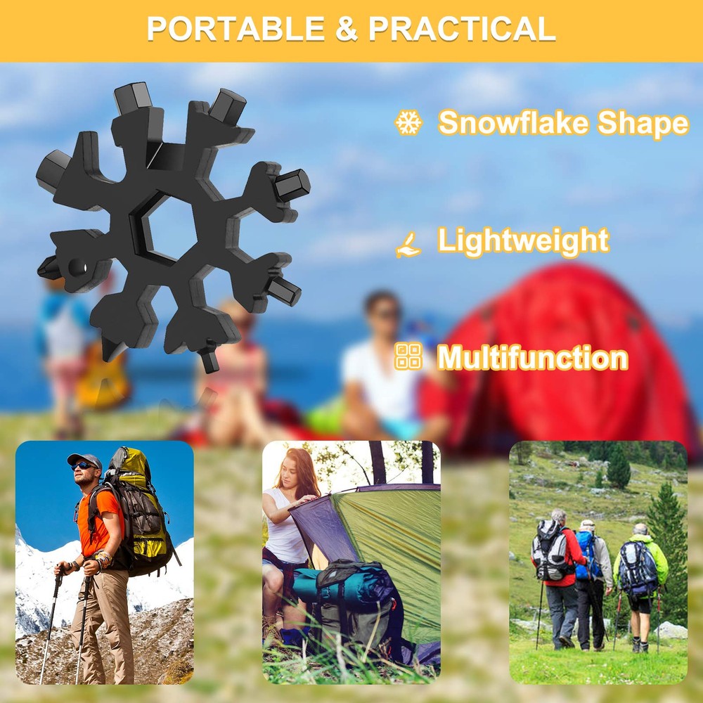 18 in 1 SNOWFLAKE MULTITOOL:Each snowflake tool has more than 18 uses,such as hexagon screwdrivers,wrenches,slotted screwdrivers ,phillips screwdrivers of different sizes.It can be also used ,Bottle Opener, Box Cutter,Rope Cutter,Gift Hanging Drop,etc. SMALL SIZE& KEYRING DESIGN: Our snowflake multi tool is Pocket Size.It just over 2.5" in diameter.It is so easy to be taken along.Because snowflake tool comes with a key ring that can be hung on a key or backpack.Key ring is designed to avoid the possibility of loss. MULTIPLE USES: One snowflake tool to unlock for multiple purposes.One snowflake multitool can be used to open the beer bottle,turn the screw,fix snowboarding,bicycle,Toys and more.It can be also used to open the carton, hung on the key or backpack. Hang on the Christmas tree for decoration or as a gift.When camping,rescue,boarding also be used. BEST CHRISTMAS GIFT: You will get 6 x multi-tool,6 、x key rings.It is an excellent gift for Christmas gifts.It's a good choice whether it's for Christmas decorations or as gifts. STURDY&DURABLE:18 in one snowflake tool is made of high quality stainless steel,exquisite workmanship.It is so sturdy and durable.Unique snowflake shaped design.Combine function and design in our compact multi-tool. Practical and beautiful.