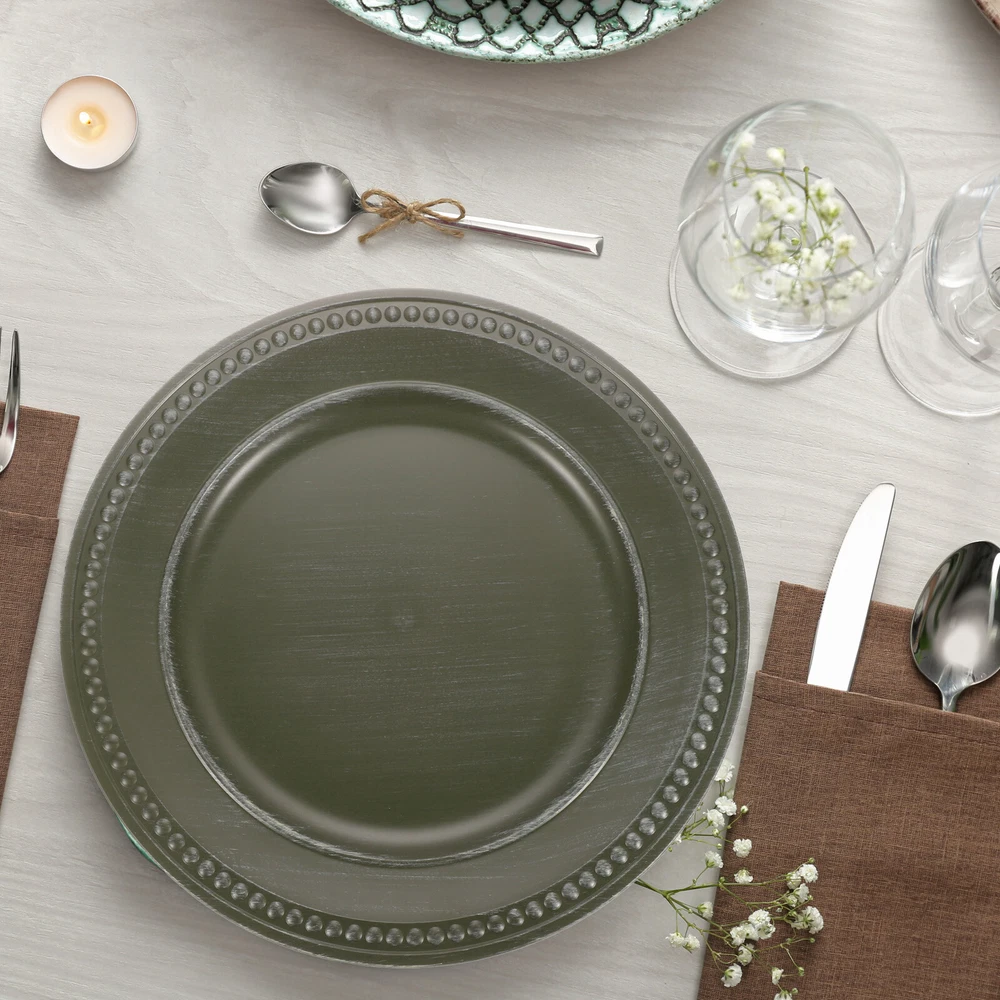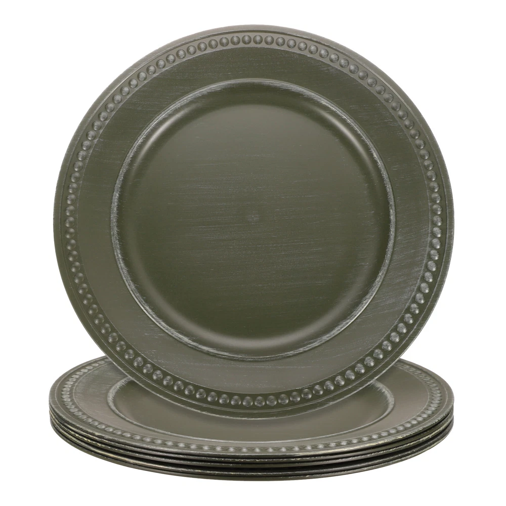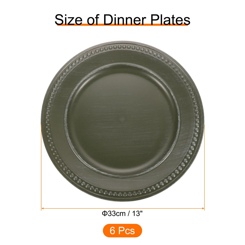 Document Dinner Plates Set:Package Included 6pcs x green brown beaded charger plates; with each plate charger measuring 13 inches in diameter, and the sufficient quantity and suitable size can meet your daily needs; They fit well under various salad plates, and dinner plates.Good Material:These plate chargers are made of plastic with floral pattern trim textured surface, lightweight and sturdy, and no nasty smell, washable and reusable, and will not break or fade, fine workmanship and stylish design will quickly grab others' attention.Petty Design:These charger plates fit under salad plates, soup bowls, and main course dinner plates to prevent your table from spills, our charger plates will blend a contemporary touch to every setting, style, and decor style with ease. Combining high-end ornamental appeal with the practicality of table setting.Easy Care:These charger plates are not microwave or dishwasher safe, Simply wash them under rinsing water and make sure to use a soft dish cloth. After drying, put them away. They will not take up much space on your worktop or dining table, and you can stack them when not in use.Wide Application:Our charger plates are suitable for many occasions, such as formal dinners, weddings, events, parties, and other occasions, and can enhance the decorative effect of the table layout and create an atmosphere. 6pcs Charger Plates Bulk 13" Plastic Beaded Chargers Dinner Plates, Green Brown Dinner Plates Set: Package Included 6pcs x green brown beaded charger plates; with each plate charger measuring 13 inches in diameter, and the sufficient quantity and suitable size can meet your daily needs; They fit well under various salad plates, and dinner plates. Good Material: These plate chargers are made of plastic with floral pattern trim textured surface, lightweight and sturdy, and no nasty smell, washable and reusable, and will not break or fade, fine workmanship and stylish design will quickly grab others' attention. Petty Design: These charger plates fit under salad plates, soup bowls, and main course dinner plates to prevent your table from spills, our charger plates will blend a contemporary touch to every setting, style, and decor style with ease. Combining high-end ornamental appeal with the practicality of table setting. Easy Care: These charger plates are not microwave or dishwasher safe, Simply wash them under rinsing water and make sure to use a soft dish cloth. After drying, put them away. They will not take up much space on your worktop or dining table, and you can stack them when not in use. Wide Application: Our charger plates are suitable for many occasions, such as formal dinners, weddings, events, parties, and other occasions, and can enhance the decorative effect of the table layout and create an atmosphere. Hot Item Payment 1.We accept eBay payment . 2.Payment must be received within 7 business days of auction closing. Shipping 1.We ship to your eBay or Paypal address. Please make sure your eBay and Paypal address is correct before you pay. 2.Items will be shipped within 1-3 business day when we received payment. 3.Delivery time depends on destination and other factors. Description Policy 6pcs Charger Plates Bulk 13" Plastic Beaded Chargers Dinner Plates, Green Brown Dinner Plates Set: Package Included 6pcs x green brown beaded charger plates; with each plate charger measuring 13 inches in diameter, and the sufficient quantity and suitable size can meet your daily needs; They fit well under various salad plates, and dinner plates. Good Material: These plate chargers are made of plastic with floral pattern trim textured surface, lightweight and sturdy, and no nasty smell, washable and reusable, and will not break or fade, fine workmanship and stylish design will quickly grab others' attention. Petty Design: These charger plates fit under salad plates, soup bowls, and main course dinner plates to prevent your table from spills, our charger plates will blend a contemporary touch to every setting, style, and decor style with ease. Combining high-end ornamental appeal with the practicality of table setting. Easy Care: These charger plates are not microwave or dishwasher safe, Simply wash them under rinsing water and make sure to use a soft dish cloth. After drying, put them away. They will not take up much space on your worktop or dining table, and you can stack them when not in use. Wide Application: Our charger plates are suitable for many occasions, such as formal dinners, weddings, events, parties, and other occasions, and can enhance the decorative effect of the table layout and create an atmosphere. Hot Item Payment 1.We accept eBay payment . 2.Payment must be received within 7 business days of auction closing. Shipping 1.We ship to your eBay or Paypal address. Please make sure your eBay and Paypal address is correct before you pay. 2.Items will be shipped within 1-3 business day when we received payment. 3.Delivery time depends on destination and other factors.