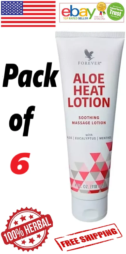 6x Forever Aloe HEAT LOTION Soothing Massage Lotion 100% Herbal 118ml. Each (FREE SHIP) After a long, active day, we all know the misery of tired, aching muscles. Now you can stretch no further than to grab a tube of Aloe Heat Lotion! This rich emollient lotion contains deep heating agents to make it the ideal massage companion for tired muscles and dry skin. Aloe Heat Lotion is a pH-balanced, lubricating lotion designed for a soothing, relaxing massage. The deep penetrating power of Aloe Vera will help soothe your muscles after sports or hard workouts! Soothing relief after sports or working out Rich, emollient formula An ideal massage lotion
