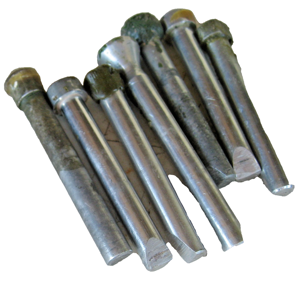 7 aluminum dops for faceting. Assorted 7 to 12mm. 1/4" shank with key x 2" length. See photo for type.