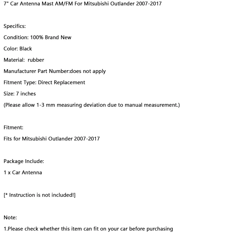 Auto Transmission Valve Body 01M325283A For VW Jetta Golf Beetle 1999-2005 170.78 USD Free shipping For Peterbilt Door Latch Striker R56-6017 15.78 USD Free shipping FUEL PUMP FUSE RELAY fit for Yamaha YZF R1 R6 FZ1 Fazer FZ8-N Naked 5VK-81950-40 28.87 USD Free shipping Sun Visor Holder Retainer Clip AL8Z-7804132-AA For Ford Escape 2010-2012 12.59 USD Free shipping Oil Cooler Filter Housing Seal Gasket O-ring 21304-JA11A For Nissan Armada Titan 10.15 USD 10.68 USD Free shipping 5% off M18X1.5 Female Aluminum Weld On Fitting Bung US 11.2 USD 11.79 USD Free shipping 5% off Regulator Rectifier for Johnson Evinrude 9.9-60Hp 82-03 173692 581778 582304 17.85 USD 18.79 USD Free shipping 5% off Clutch Booster Fit for Nissan Patrol GQ Y60 TB42 & TD42 Diesel # 30630-VB000 67.87 USD Free shipping H8 For`Philips CoreDrive Halogen Fog 12360CDC1 12V 35W PGJ91-1 M2 13.79 USD Free shipping Ignition Cover Gasket For 250 EXC-F XCF-W Six Days XC-F 2006-2011 77030140000 T9 12.15 USD 12.79 USD Free shipping 5% off Black mirror delete blanking block off plates fits BMW S 1000 RR 2020-2023 19.72 USD Free shipping Thermostat Cover Outlet Pipe w/Sensor For Jaguar Vanden Plas XJ8 & XK8 52.87 USD 63.79 USD Free shipping 17% off LEFT ENGINE STATOR COVER GASKET FOR SUZUKI SAVAGE LS650 BOULEVARD S40 1986-2019 13.1 USD 13.79 USD Free shipping 5% off Universal Motorcycle CNC Adjustable Steering Damper Stabilizer Top Black YU 50.15 USD 52.79 USD Free shipping 5% off Trunk Lid Tailgate Back Door Control Module Unit For BMW X5 E70 X6 61357335274 59.78 USD Free shipping Pulsing Electrical Coil AM105573 AUC15118 For John Deere 325 335 345 425 445 455 20.49 USD 21.57 USD Free shipping 5% off A Fantastic Shop Send us a message Our Store Seller Profile Feedbacks Save this seller Contact 7" Car Antenna Mast AM/FM For Mitsubishi Outlander 2007-2017 7" Car Antenna Mast AM/FM For Mitsubishi Outlander 2007-2017 Feature: 1: According to the original factory specifications,perfect match for the original car. 2: Own different test machines to design exact accurate parameter for our products.All switches were tested for performance. 3: Made by high quality material, lightweight, anti-rust, colorfast and durable. 4: Aftermarket product with premium quality. 5: Stable performance, high reliability,suitable for replacing your broken one. Specifics: Condition: 100% Brand New Color: Black Material: rubber Manufacturer Part Number:does not apply Fitment Type: Direct Replacement Size: 7 inches (Please allow 1-3 mm measuring deviation due to manual measurement.) Fitment: Fits for Mitsubishi Outlander 2007-2017 Package Include: 1 x Car Antenna 2x Screws(5.84mm-6.15mm) Please see whether the antenna screw thread is suitable before purchasing. [* Instruction is not included!] Note: 1.Please check whether this item can fit on your car before purchasing About US About Our Items We strive to describe all items accurately and thoroughly, with the utmost care and attention to detail. However, to ensure a mutually satisfactory transaction, we kindly ask for your assistance in thoroughly reviewing the item description and photos, and addressing any questions before placing a bid. Customer Satisfaction We stand behind our commitment with exceptional service, a 100% money-back guarantee, and a dedication to customer satisfaction. I am readily available to address any inquiries or concerns you may have, both before and after your purchase. Our aim is to ensure your shopping experience is enjoyable and that you're delighted with your purchase. Feedback Your feedback is crucial to our business's success. If you're satisfied with your purchase and the service you received, we would greatly appreciate your positive feedback, along with an overall Detailed Selling Rating (DSR) of 5. Please take a moment to leave us positive feedback. Our eBay account is set up to automatically reciprocate positive feedback once yours is received. If you're considering leaving neutral/negative feedback or opening an eBay/PayPal case, we encourage you to reach out to us immediately. We're committed to resolving any issues to the best of our ability. Shipping Parcel will be shipped using Standard shipping method. For security purposes, items will be shipped exclusively to the confirmed address on Paypal. Please ensure your Shipping address is up to date before proceeding with payment. Estimated delivery time within the United States ranges from 3 to 10 business days, depending on your location. Returns We accept returns within 60 days from the date the buyer receives the item. If the item is found to be defective upon receipt, the customer has up to 30 days from the date of receipt to request an exchange for a new item or a refund. For returns due to a change of mind, we accept items in their original selling condition. However, if the package has been opened due to a mistaken order, it does not qualify for our return policy. Please note that the buyer is responsible for covering the cost of return postage. If you encounter any issues, please reach out to us via eBay message, and we'll respond within 24 hours. ANTENNA ROD WITH DRIVE CABLE For Toyota Lexus Land Cruiser 86337-60080 13.78 USD Free shipping Radio Aerial Antenna 65202296772 For Mini R50 R52 R53 R55 R56 F54 F55 F56 F57 11.79 USD Free shipping 7" Car Antenna For GMC Sierra / Chevr Silverado 1500 2500 3500 2007-2019 14.79 USD Free shipping ANTENNA ROD WITH DRIVE CABLE Fits for Toyota Lexus Land Cruiser 86337-60080 13.78 USD Free shipping Manual Lock Down Antenna For Landcruiser 80 Series HDJ80 HZJ80 FZJ80 23.79 USD Free shipping 9" Amplified AM/PM Roof Aerial Antenna + Base Combo Set For VW Jetta Bora Passat 16.79 USD Free shipping 11"Inch Black Antenna Mast AM/FM For Toyota Tacoma 1995-2016 10.68 USD Free shipping 7" Car Antenna 863090R010 For Toyota RAV4 2009-2016 12.78 USD Free shipping 9" Universal Car Radio AM/FM Antena Roof Mast Long Whip style For Toyota V 10.14 USD 10.79 USD Free shipping 6% off Brand New Radio Ma