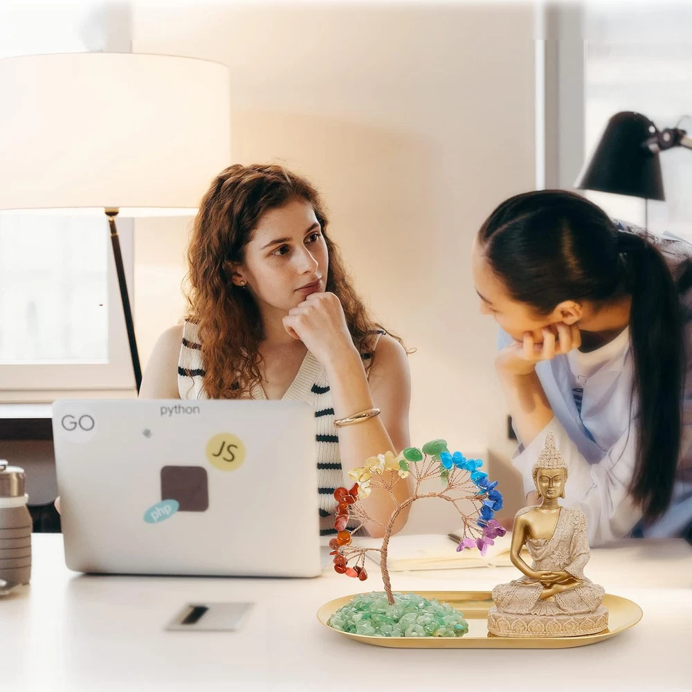 EXQUISITE ARTWORKS:This exquisite piece of art is a combination of 7 chakra crystal tree, stainless steel golden tray and golden Buddha Shakyamuni. The money tree is handcrafted by artisans. leaves and branches are adjustable and you can shape them in whatever way you want. Put it in your living room or on your desk. It will help you attract wealth and prosperity, success and all good things. CRYSTAL TREE BUDDHA STATUE:Zen decorative Buddha statues Size: 3x2x4.3 (LxWxH), in sitting meditative pose. Made of high quality sandstone and resin materials, hand-colored by artisans. Statues can be placed in your home, office, dining table, meditation room, prayer room, sacred room, yoga room, desk, it can bring you a relaxing and peaceful atmosphere. 7 CHAKRA CRYSTAL TREE:The 7 chakras are the energy centers of our body. An unbalanced energy field can cause blockages in the flow of energy. We regulate in the proper way, and meditation is the best way to regulate. The 7 chakras are the bottom chakra, the navel chakra, the abdomen chakra, the heart chakra, the throat chakra, the eyebrow chakra, and the crown chakra. So you can correspond to different chakras according to the color of the crystal. GREAT GIFT:Money tree can bring you good luck and wealth, and enhance the power of the person or the surrounding environment. Whether it's a birthday, Valentine's Day, Mother's Day, housewarming, Christmas or anniversary, it's a perfect present for your family, friends and colleagues. This is an absolutely beautiful, and meaningful gift for anyone. Note: You will receive folded branches due to packaging. A unique but similar tree will be yours. As the cash cow decor is made of natural stone, colors and shapes vary and may differ slightly from the pictures. We provide free return and exchange guarantee for your purchases for up to three months. During this period, you can contact us at any time if you encounter any problems. Product Description Place the chakra crystal tree in your living room and office desk, it will bring you wealth, good luck, wish you success and attract positive energy. YOGA MEDITATION STATUE 7 Chakras Office Meditation Accessories Crystal Home Decorations for cubicle office decor, kitchen decor, desk decoration, table decor, shelf decorations, Zen Spiritual Decor, yoga decor, meditation room decor, crystal decor, chakra decor, feng shui decor, statues for home decor, room decoration, spiritual decor etc. The Crystal Tree Buddha Statue is a wonderful Feng Shui gift for family and friends, especially for meditation lovers, yoga lovers, Feng Shui masters and Buddhists. The video showcases the product in use. The video guides you through product setup. The video compares multiple products. The video shows the product being unpacked. 7 Chakras Yoga Meditation Sculpture The crystal money tree will help you attract wealth, prosperity, success and all good things. Buddha Statue Gives you peace of mind, helps you overcome difficulties, and keeps your loved ones healthy happy. Yoga Meditation Statue The small yoga statue is perfect for display in Zen accessories, yoga, meditation room, office. 1 Buddha Decor 2 Office Desk Decor 3 Meditation Room Decor 1 DIY 2 SEVEN CHAKRAS A SPECIAL BLESSING GIFT The Seven Chakras Crystal Tree Buddha Statue can also be used as a blessing gift, wishing health, safety and happiness to relatives and friends around you. It's also a great gift to help your friend heal himself when he's in trouble. Our Product Material Resin Material Resin Material Resin good luck gift ✔ good luck gift ✔ good luck gift ✔ Our Product Add to Cart Add to Cart Add to Cart Add to Cart Customer Reviews 4.5 out of 5 stars 1,310 4.5 out of 5 stars 1,310 4.5 out of 5 stars 1,310 4.5 out of 5 stars 1,310 — 4.5 out of 5 stars 60 4.5 out of 5 stars 60 Price $8.98 $ 8 . 98 $9.99 $ 9 . 99 $9.98 $ 9 . 98 $8.98 $ 8 . 98 — — — Color Black White Gold Sandstone Gold Black Silver Material Resin Resin Resin Resin Resin Resin Resin Best Gift ✔ — — ✔ ✔ ✔ ✔ Home Decor ✔ — — ✔ ✔ ✔ ✔ Size 3.14"L x 5.12"H 3.14"L x 5.12"H 3.14"L x 5.12"H 3.14"L x 5.12"H 1.57"L x 2.56"W x 6.9"H 1.57"L x 2.56"W x 6.9"H 1.57"L x 2.56"W x 6.9"H