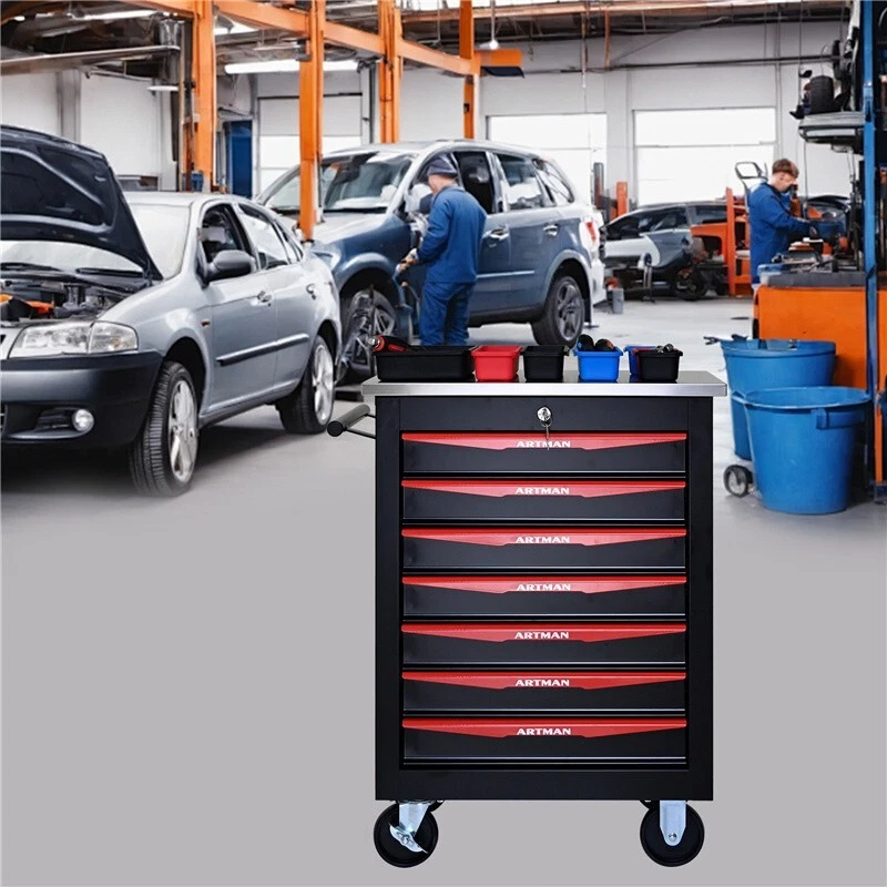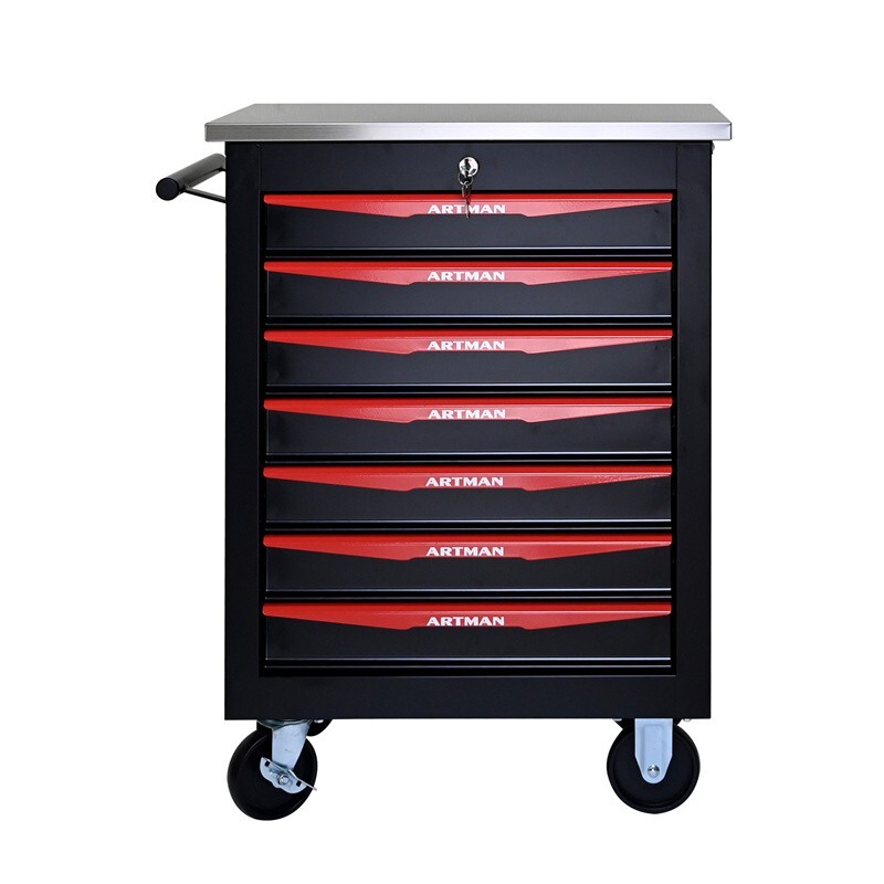 Features and Details: The ARTMAN tool trolley is equipped with a total of 7 drawers . The tool box is also lockable and can be used as a removable, attachable and mobile case attachment The opening and closing of the drawers of the tool cabinet is very gentle thanks to the ball-bearing drawers. The robust and powder-coated steel construction is used for high wear resistance. This assembly trolley has 4 steering wheels, 2 of which with parking brakes, so you can move the trolley freely in the garage, but also stop in one place This is a set of cabinets, can use a round hook at the bottom of the table to connect another tool car, thus forming a combination. Specification: Color: Black+Red Metrail:Cold Rolled Steel Surface Finish :Powder Coating Casters:4" Casters (2PCS with brake and 2PCS without brake) Product Size (with wheels and countertops):22.28*13.58*30.71INCH Product Size (without wheels and countertops):20.63*12.99*25.16INCH Weight (lbs.): 59.30