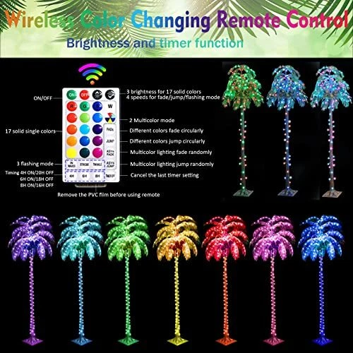 Return Policy Fast Delivery Trusted seller 7 FT Color Changing LED Palm Tree with Coconuts, Remote Control - for Pool, Beach, Yard, Party Decor Product Description Color Changing Palm Tree with 5 Coconuts: The multicolor coconut tree is designed by brown straight trunk and green palm fronds with color changing LED lights, can add some tropical style to your patio, pool, Hawaiian jungle party, Tiki bar, etc Updated 32 Keys Remote Control: The colorful palm tree lights can be controlled with remote. You can customize the color of the LED tropical palm tree, set up the time(4 hours on, 6 hours on, 8 hours on) and control the brightness of the lights 18 Colors and 7 Lighting Modes: 16 different solid single color, 2 combination colors (Red White Blue & Colorful), and 7 dynamic lighting modes (twinkling and flashing). You can switch the led lights from cozy to cheerful blinking Artificial palm tree Outdoor Decoration: The package contains ground nails that can make the palm tree stand steadily outdoors. IP44 waterproof functions make it more suitable for outside use Widely Application: Wver on the beach, swimming pool, yard, garden, party, home, office, indoor or outdoor, and whenever winter or summer, daytime or holiday, always bring you the Hawaiian tropical happiness Easy to Assemble: The palm tree is prelit. You just need screw the trunk into the base, and separately connect 2 trunks and the male & female plug. Then shape the leaves as you want. You can use it to decorate your room and luau aloha party Specification: The faux palm tree with lights is 6 FT height, designed with 170 long life span LED lights, powered by 29 V low voltage adaptor, which is more save-energy Shipping Returns Payment Shipping Shipping is FREE to all addresses other than APO/PO boxes in the lower 48 states. All our stock ships from US-based warehouses. Shipped via USPS or UPS (depending on location and package weight) Unless stated otherwise, all orders will ship within 24-72 hours of your payment being processed. Check our feedback to see the great reviews of FAST shipping we offer. Returns Seller does not accept returns Payment We currently accept payment via eBay managed payments only. Once payment is cleared, we will dispatch your shipment within 1-3 business days. Please refer to the "Shipping" tab for more information regarding shipping speed to your destination.
