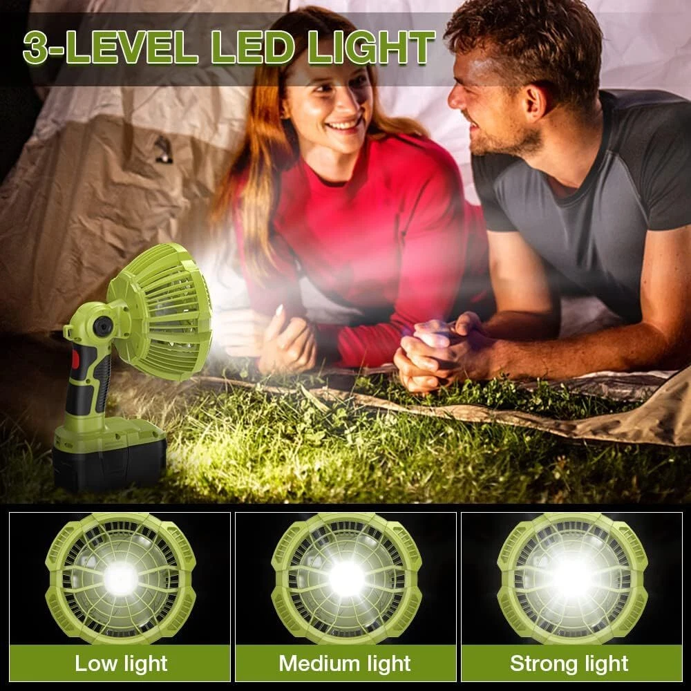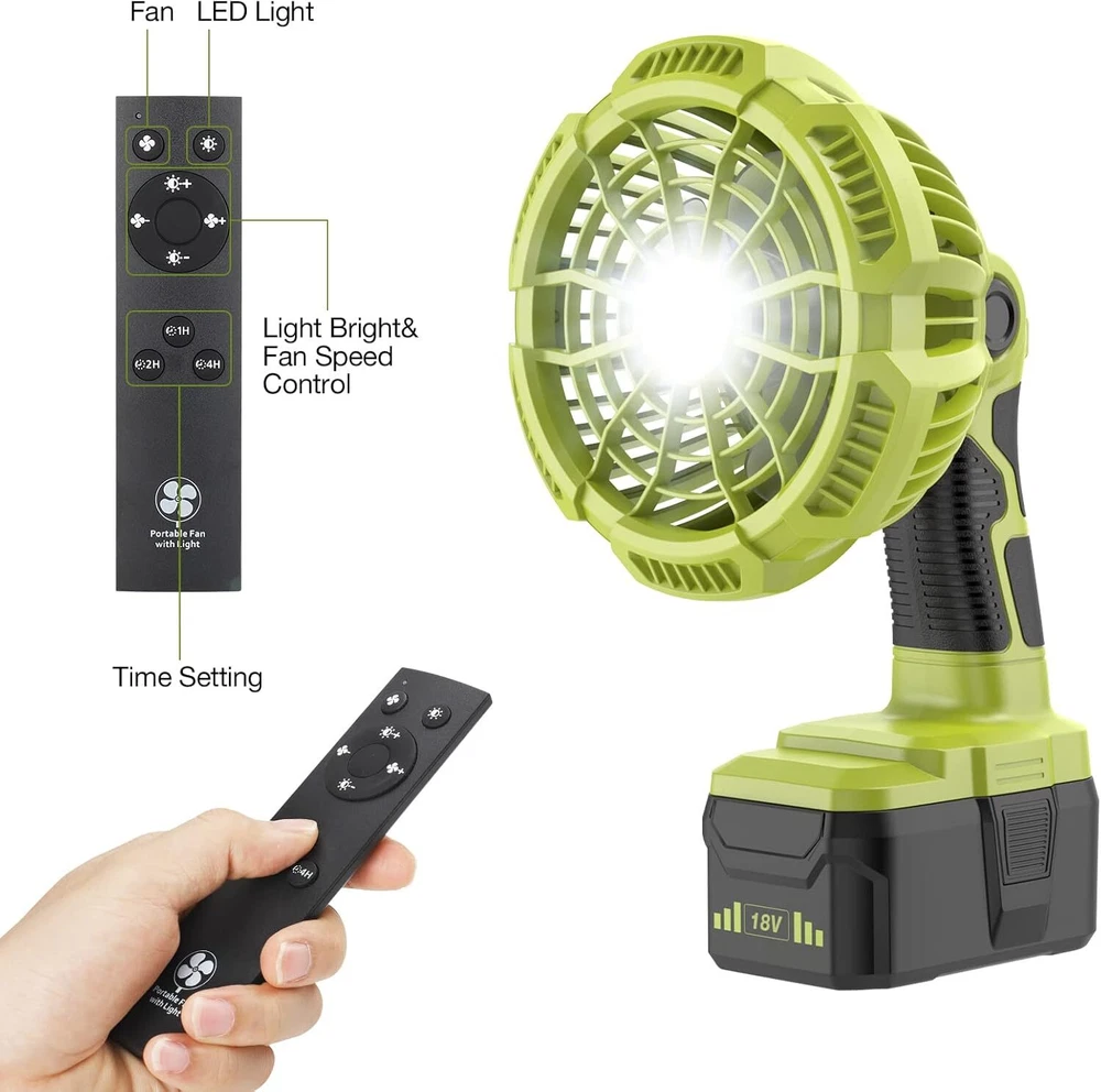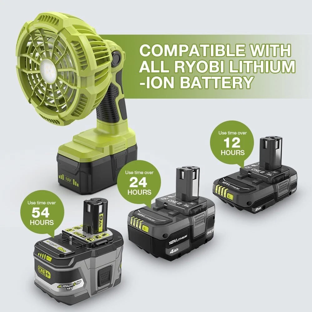 7 Inch Camping Fan Powered by Ryobi ONE+ 18V Li-ion Ni-CD Ni-MH Battery, Red Product Details Brand: DTEZTECH Color: Red Electric fan design: Table Fan Power Source: Battery Powered Style: Modern Product Dimensions: 6"D x 6"W x 10"H Room Type: Office Special Feature: Portable Recommended Uses For Product: Cooling Noise Level: 30 dB Wattage: 9 watts Number of Blades: 3 Voltage: 18 Volts Item Weight: 16 ounces Included Components: Remote Indoor/Outdoor Usage: Outdoor Control Method: Remote Light Type: LED Blade Material: Plastic Is Cordless?: Yes Number of Power Levels: 3 Item Weight: 1 pounds Mounting TypeController Type: Desk Fan,FreestandingRemote Control MaterialNumber of Speeds: Plastic3 Powered by Ryobi 18V ONE+ Li-ion Ni-CD Ni-MH Battery: This Ryobi desk fan perfect compatible with all Ryobi 18V ONE+ Li-ion Ni-CD Ni-MH batteries, RB18L40 P100 P101 P102 P103 P104 P105 P106 P107 P108 and Ryobi 12V 14.4V Ni-Cad Ni-Mh Battery. Replacement fan for Ryobi P3320, more portable and powerful. Brushless Motor, Quiet Operation and Strong Wind: Do you want to cool down without the pesky background noise in the hot summer? The DTEZTECH portable fan for Ryobi is equipped with Brushless Motor and 3 inch plastic blades, the noise is less than 30db and the motor runs at 1500 CFM and 3300 RPM. The portable fan has three wind speed gears, Low/Mid/High. Unique Design-9W LED Work Light: When you need to go out with a fan and a LED light at the same time, you will definitely be very annoying. Right now, our engineer design fans and lights into one. When you need to go out for camping, working, traveling, just take it with you. There are 3 modes setting, Low/Mid/High. Using the remote control to adjust, or pressing the switch on the fan more than 3s to adjust. PC Fireproof Material and Portable Size: The material of this outdoor camping fan is PC fireproof plastic and metal, which is durable and strong. Can be used in harsh environment. Size: 6" x 6" x 10" Inch. Weight: 1LB. This camping fan can be held in one hand, very convenient to carry out. 110 Degree Rotation Head: This handheld table fan has 110 degree rotation adjustment, provides a cool breeze in desired direction. No matter where you are, it can meet your needs at any time. Perfect companion for fishing, camping, trip, beach, hot sporting events and hiking! Summer coming up, so it will be put in good use!