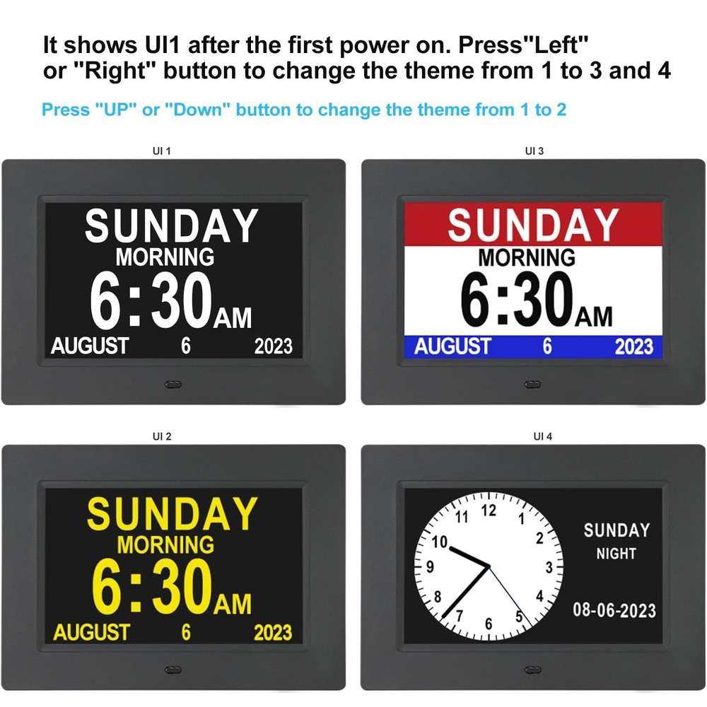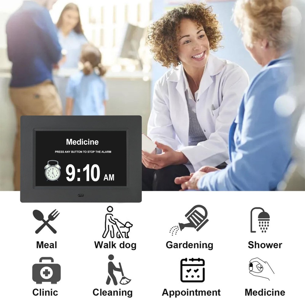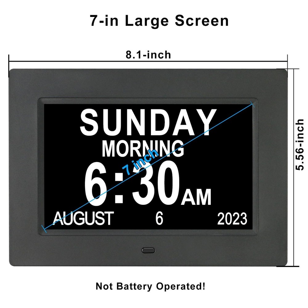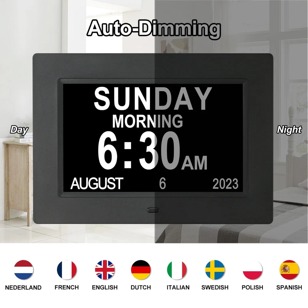 Digital Calendar Day Date Time Clock for Seniors Elderly Perfect for Senior Easy to Use and Operation Extra Large and Clear Hourly Chime. Digital Day of the Week Clock for seniors, elderly with dementia, Memory Loss, Alzheimer is a wonderful festival or birthday gift. Memory loss calendar day clock displays week, month, date and cycles of a day. Each period has no confusing abbreviation letters to remind you, which helps the Alzheimer distinguish day and night and helps others manage their time effectively. More features: ★ Time Mode: 12 hours or 24 hours. Dual Date Mode: Month-Day-Year or Day-Month-Year. ★ Displays: MORNING AFTERNOON EVENING NIGHT BEFORE DAWN. ★ Battery Backup: Auto save date when you disconnect power ★ 8 Languages: English, French,Germany, Italian, Dutch, Spanish, Polish, and Swedish. ★12 Alarm options: 12 Alarm Modes Easy set, Single Alarm, Every Day, Mon. to Fri. or Weekends Only. & tag: Meal, Medicine, Clinic, Shower, Gardening, Cleaning, Appointment and Walk dog. It is quickly becoming a perfect Senior Care and In Home Care necessity ★ Package Contents: 1xDigital Calendar Clock, 1 x Adapter, 1 x Holder, 1 x English User Manual. 【UNIQUE AM PM CLOCK】-Day date time clock clearly spells out DAY DATE TIME MONTH and YEAR in large,Time mode [ 12 or 24 hours], 5 time period: 6:00am - 11:59am (MORNING), 12:00pm - 5:59pm (AFTERNOON), 6:00pm - 8:59pm (EVENING), 9:00pm - 11:59pm (NIGHT) and 12:00am - 5:59am (PREDAWN) 【12 ALARMS OPTIONS】-Dementia clock with 12 Alarm Modes Easy set, Single Alarm, Every Day, Mon. to Fri. or Weekends Only. & tag: Meal, Medicine, Clinic, Shower, Gardening, Cleaning, Appointment and Walk dog. It is quickly becoming a perfect Senior Care and In Home Care necessity 【AUTO DIMMING 】- Memory loss clock Automatic brightness conversion during the 7:00 PM and the 7:00 AM(Mid, Low or High Brightness); also can adjust brightness by yourself (level 1-5) 【BATTERY BACKUP & 8 LANGUAGES】- In case of the power outage, Alzheimer Clock will be reset to the correct time and date when the power returns. Seniors clock is with 8 Languages: English, French, Italian, Dutch, Spanish, Polish, Nederland and Welsh 【SATISFACTION PROMISED & IDEAL GIFT】-We believe in our products. That's why we 30 days 100% money-back and provide friendly, easy-to-reach support. The words Dementia, Alzheimer's or Memory Loss are 'not’ printed on the clock itself so it makes a great gift for those special loved ones, especially Grandma & Grandpa