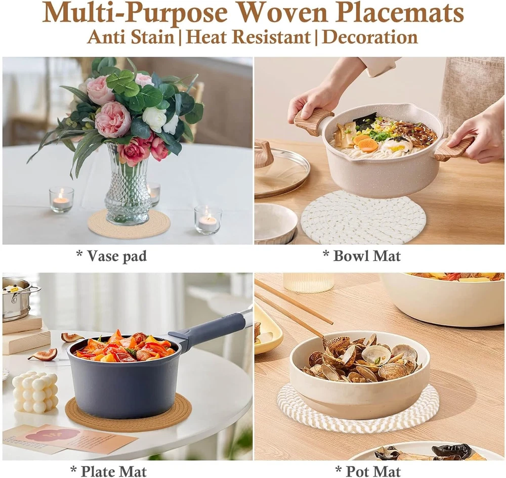 7" Trivets for Hot Dishes, Hot pots and Pans, 4 Heat Resistant Hot Pads, Pot Holders for Kitchen, Home Essentials for New Home and Farmhouse Decor, Fall Decorations for Home(Brown) 7" Trivets for Hot Dishes, Hot pots and Pans, 4 Heat Resistant Hot Pads, Pot Holders for Kitchen, Home Essentials for New Home and Farmhouse Decor, Fall Decorations for Home(Brown) FREE AND FAST SHIPPING! About this item Trivets Set - You will receive 4 piece of trivets for hot dishes. Measuring 7 inches in diameter and 0.3 inches thick, These hot pads for kitchen blend Boho and country farmhouse styles, perfect for your kitchen and dining table. Excellent Water Absorption - These Hot Pads is made of cotton ropes, which are super absorbent and sturdy. No worry about dishes or pans will dirty your table. Pure cotton material supports hand wash and machine wash. Heat Resistant - Our pot holders are thickened to withstand temperatures up to 356°F. They can be placed under hot dishes, hot pots and pans as protection and decoration, which can effectively blocks heat sources, scratches and stains, perfectly protecting the tabletop and extending the life of the table. Multi Purposes - These hot pads for kitchen can be used as trivets for hot dishes, hot pads for kitchen, trivets for hot pots and pans, farmhouse lacemats to protect your table and kitchen, also can be a perfect mat for your vases and flowerpots. Ideal for gift - These cotton trivets are a perfect option for home essentials for new home and farmhouse kitchen decor, making both thoughtful and practical gifts for friends and family. Product We offer a 30-Day Return Policy on items which you are not completely satisfied with. You have the option for a full-refund or an exchange of the item. No returns are available on items shipped outside of the US . Shipping We offer Free Shipping to the US and ship within 2 business days of payment, usually sooner. We use UPS express shipping. That's why your products are usually delivered within 3 days . Contact We try our very best to make sure every customer is completely satisfied. If there's a problem , message us! We're happy to help. 24/7 live chat available.