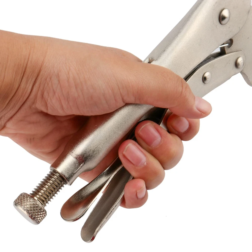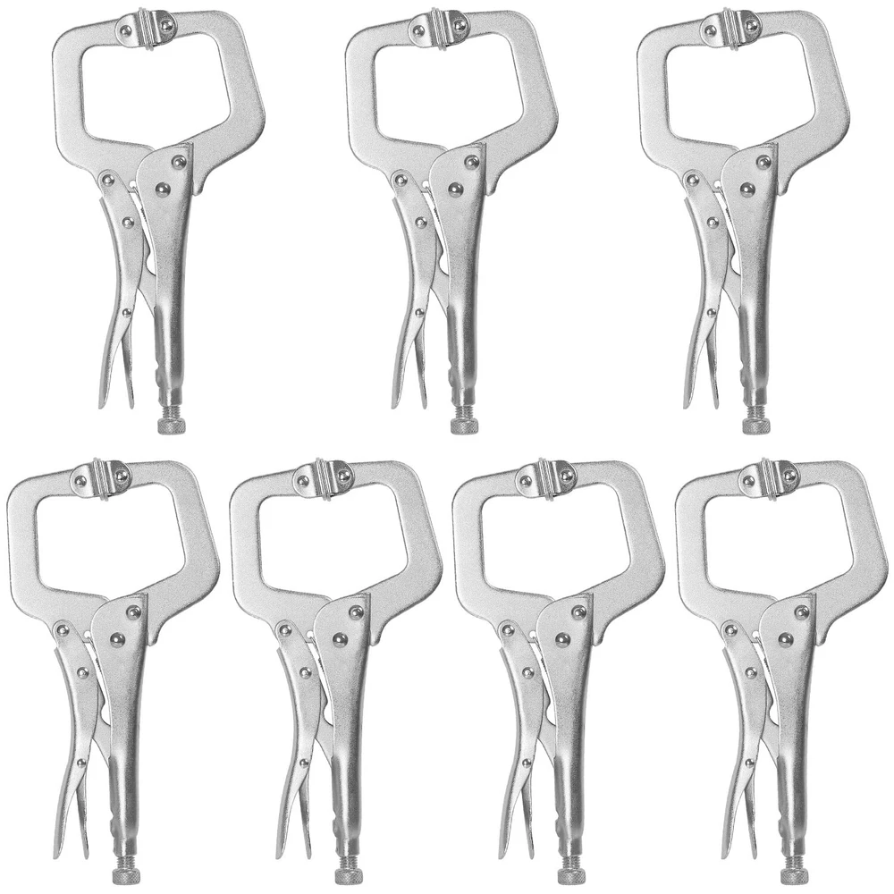 welding clamp tools 7 PCS VALUE PACK - This welding clamp tools set includes 7pcs heavy-duty C-clamps with sizes of 11 inches, all are made of high-quality nickel-plated alloy steel, which makes them durable and robust, and feature wide opening jaws for greater versatility in clamping a variety of shapes. ADJUSTABLE & SWIVEL PADS - Our adjustable wood working locking pliers provide the versatility of standard locking pliers. Simply turn the screw to adjust the grip, which stays adjusted for repetitive use. Swivel pads hold tapered work, awkward fabricating jobs, and delicate projects without damaging the work surface. PREMIUM MATERIAL - Built with nickel plated alloy steel, these C-clamp locking pliers are designed to be the hardest working tools in your kit. With professional clamping force that won't slip along with forged and hardened alloy steel jaws, our C-clamp welding tools are durable and built to last. TORQUE LOCK DESIGN - Anti-pinch ergonomically designed handles of the C-clamp locking pliers provides comfortable using experience. The contoured handle aids in the torque-lock design, resulting in a secure hold. The hardened wide jaws with better grip force on job site material, suitable for wood working, welding and more. WORRY-FREE SHOPPING - If you have questions, please click contact us to learn more information about the C-clamp locking pliers. Just email us and our service team will give you a reply within 24 hours. You’ll enjoy a 30-day hassle-free return policy. No risk to you!