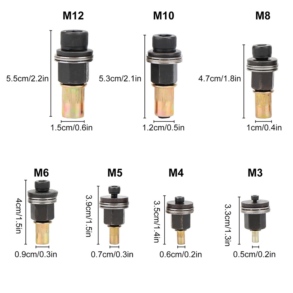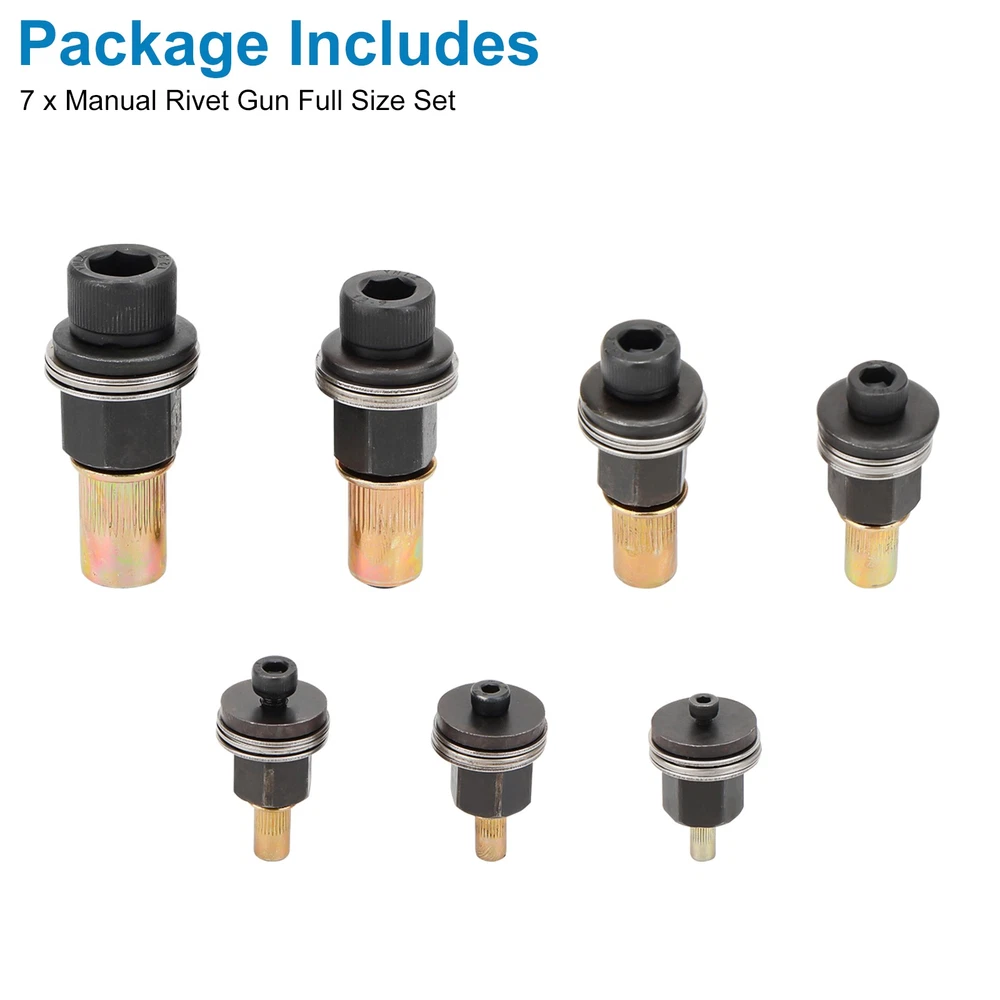 Product Description Rivet Nut Tool Manual - Universal Carbon Steel Adapter, Compatible with M3, M4, M5, M6, M8, M10, M12, Electric Riveting Machines and Rivet Tools | Easy to Install Durable Rivet Heads Product Feature ☀️ Durable Build: Constructed from sturdy carbon steel, these hand rivet tools are built to withstand tough work conditions and deliver consistent performance over time. ☀️ Comprehensive Set: This rivet tool kit comes with commonly used sizes M3, M4, M5, M6, M8, M10, and M12, covering a wide range of assembly requirements for different projects. ☀️ Efficient Installation: The manual head design of the rivet tool streamlines the assembly process, enabling quick and effective installations to save valuable time. ☀️ User-Friendly Operation: Simply attach the rivet head with a key, then tighten manually or with a power driver for fast and effortless riveting. ☀️ Wide Applications: Perfect for multiple industries, including manufacturing, construction, automotive, aerospace, and rail, offering excellent versatility for various tasks. Product Specification Type Rivet Nuts and Bolts Kit Material Carbon Steel Size M3, M4, M5, M6, M8, M10, M12 Operation Modes Manual (Wrench) / Power Drill Compatible Durability Robust Construction, Long-Lasting Performance, High Strength Design Ergonomic Manual Head for Fast Ease of Use Quick Rivet Head Attachment, Screw Manually or With Power Drill Features Time-Saving, Reliable Performance, Universal Compatibility, Versatile Tool Set Surface Compatibility Works with Steel, Aluminum, and Various Metal Surfaces Portability Compact Design, Easy to Store and Carry Efficiency Speeds Up Nut Installation, Reduces Manual Effort Applications Automotive, Home Decoration, Metal Assembly, Furniture, DIY Projects Industry Use Manufacturing, Construction, Automotive, Aerospace, Rail Ideal For Professionals and DIY Enthusiasts, Automotive Repair, Industrial Assembly, Craft Projects Package Included 🎁 7 x Rivet Tool Head Easy To Use 1. Drill A Hole The Same Size As The Nut 2. Install The Screws Into The Drilled Holes At The Location Where You Want To Install It 3. Hold The Hexagonal Rivet Head With A Wrench And Turn The Screw 4. Installation Is Complete, And The Required Equipment Can Be Installed Location Descriptions To improve your buying experience and ensure fast delivery, Your order will be shipped from the warehouse located in either new jersey or california that is closest to your address. If you have any questions, Please contact us. Thank you for your support !