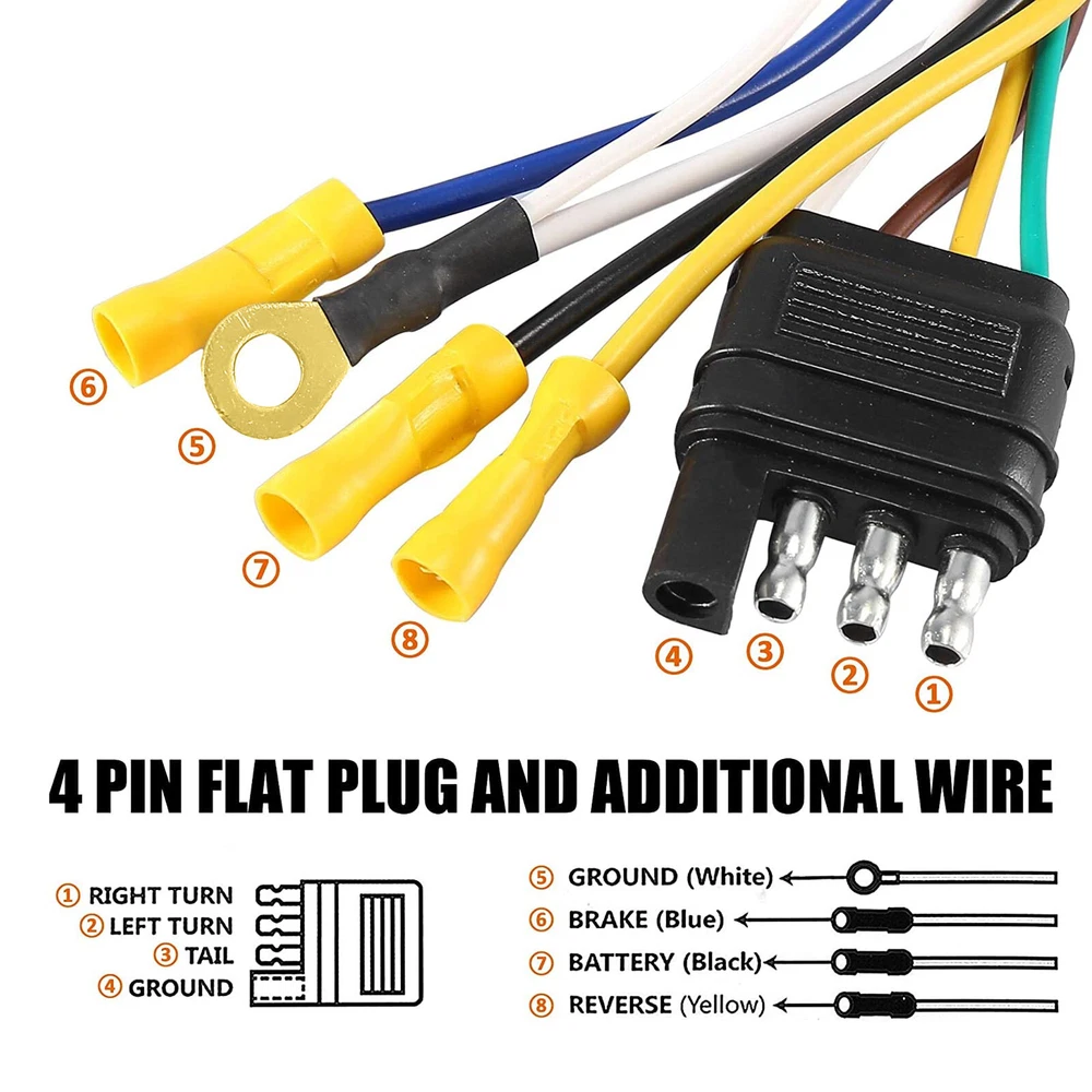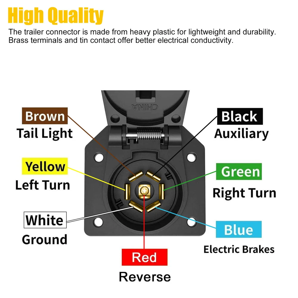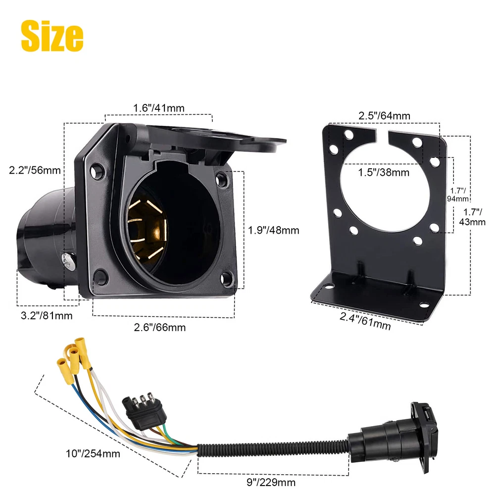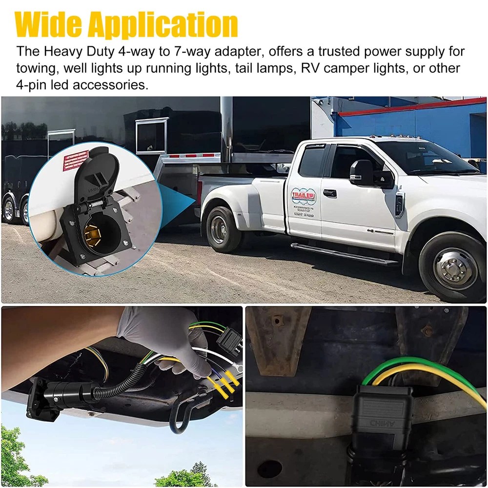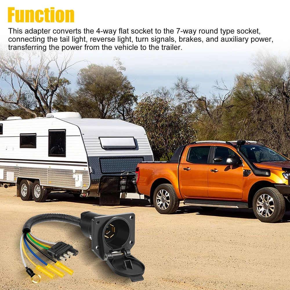 Product Feature ✨ High Quality: The trailer connector is made from heavy plastic for lightweight and durability. Brass terminals and tin contact offer better electrical conductivity. A well-sealed spring-loaded dust cover protects the connector from dust. ✨ Function: This adapter converts the 4-way flat socket to the 7-way round type socket, connecting the tail light, reverse light, turn signals, brakes, and auxiliary power, transferring the power from the vehicle to the trailer. ✨ Simple Setup: Standard round 7-way flat blade connector easily and tightly snaps into the trailer's existing socket and holds without any wiggle or loose, simple plug-and-play. ✨ Wide Application: The Heavy Duty 4-way to 7-way adapter, offers a trusted power supply for towing, well lights up running lights, tail lamps, RV camper lights, or other 4-pin led accessories. Compatible with most trailers, caravans, RV, car, boat, camper, etc. Product Specification Type T-Connector Material Plastic Plug 4-Way Flat to 7-Way Voltage 12V Yellow Wire (from 4-Way Plug) Left turn signal Brown Wire (from 4-Way Plug) Tail lights Green Wire (from 4-Way Plug) Right turn signal Yellow Wire Spare wire, backup White Wire Attach to a vehicle ground point Blue Wire Connect to output wire on brake controller Black Wire Connect to fuse block or fused battery lead Package Included 🎁 1 x Trailer Adapter Plug 🎁 1 x Mounting bracket 🎁 1 set Screws, Nuts, and Washers Location Descriptions To improve your buying experience and ensure fast delivery, Your order will be shipped from the warehouse located in either new jersey or california that is closest to your address. If you have any questions, Please contact us. Thank you for your support !