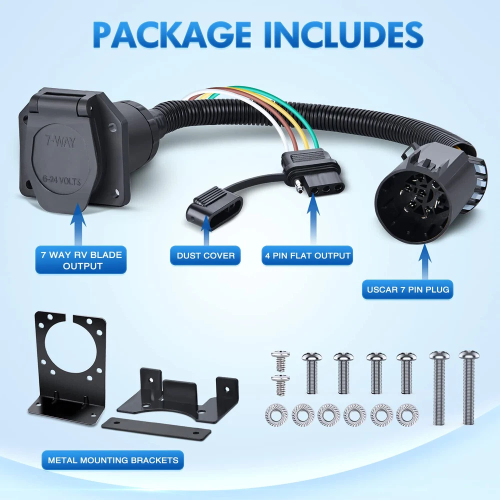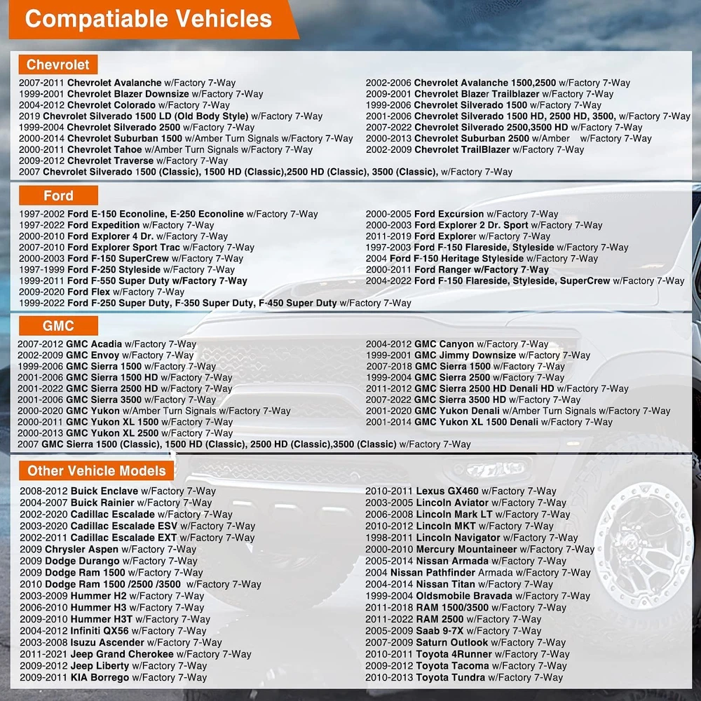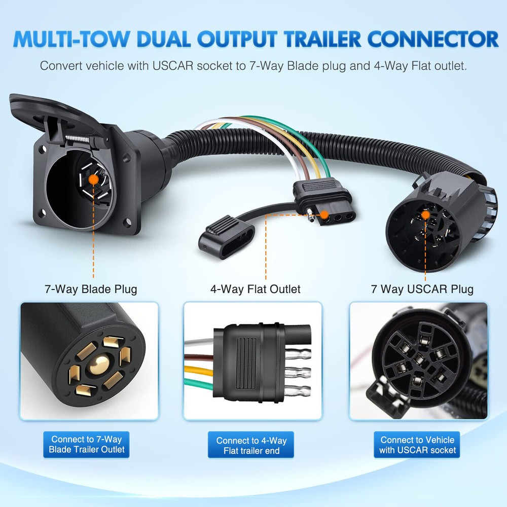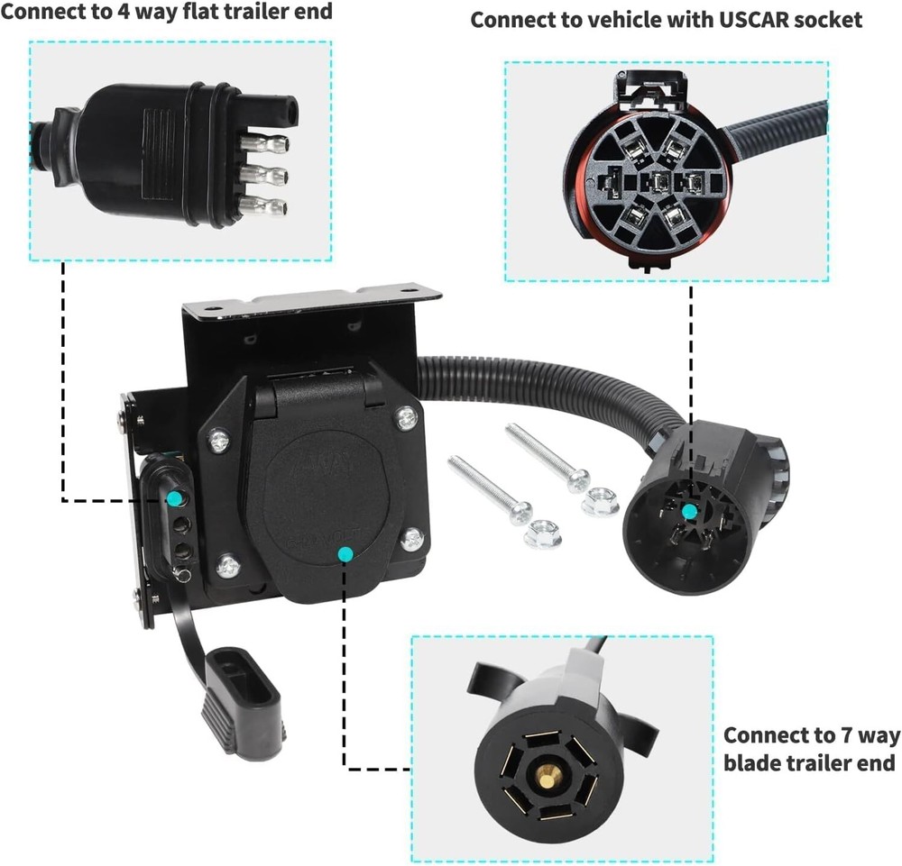 7 Way Trailer Wiring Harness 4 Way Flat Plug Kits For Chevy Silverado 1500 2500 Item Description VERSATILE DESIGN. This dual-output connector is a great upgrade for a variety of vehicles with a USCAR socket. It provides two standard trailer wiring sockets, a 4-way flat and an RV blade 7-way round socket, allowing for versatile towing options.Fit Type: Universal Fit WEATHER-RESISTANT. This two-way trailer wiring socket is designed to outlast weather exposure. The 7-pin socket has a spring-loaded dust cover that keeps the connection points dry and protected when not in use RELIABLE CONNECTION. These trailer wiring sockets come ready to plug into existing vehicle wiring, using the factory USCAR socket. They connect the taillights, brake lights, turn signals, reverse lights, electric trailer brakes and aux power USCAR-SPECIFIC. This trailer wiring harness socket is designed for specific vehicles with an industry-standard USCAR socket DURABLE CONSTRUCTION. For long-lasting use and a reliable connection, the housing of this dual 7-pin and 4-pin trailer wiring socket is made from durable black plastic that will never rust or corrode Metal bracket securely mounts wiring to the vehicle or trailer hitch Features Simple, plug-and-play installation Constructed with SMT circuitry Provides a standard trailer wiring output, usually 4-way or 5-way flat Dust cover included to keep connector clean when not in use Specifications Condition:100% Brand New Warranty: 90 Day Free Return:30 Day Color: Black Fitment 2002-2006 Chevrolet Avalanche 1500 2002-2006 Chevrolet Avalanche 1500 2003-2006 Chevrolet Silverado 1500 HD 2003-2018 Chevrolet Silverado 1500 2007-2007 Chevrolet Silverado 3500 Classic 2019-2019 Chevrolet Silverado 1500 LD 2001-2019 Chevrolet Silverado 2500 HD 2008-2017 Chevrolet Express 2500 2002-2006 Chevrolet Avalanche 2500 2007-2007 Chevrolet Silverado 1500 Classic 2007-2019 Chevrolet Silverado 3500 HD 2008-2014 Chevrolet Express 1500 2008-2019 Chevrolet Colorado 2010-2012 Chevrolet Traverse 1999-2004 Chevrolet Silverado 2500 2000-2006 Chevrolet Tahoe 2000-2013 Chevrolet Suburban 2500 2000-2014 Chevrolet Suburban 1500 2001-2006 Chevrolet Silverado 3500 2002-2009 Chevrolet Trailblazer 2007-2007 Chevrolet Silverado 1500 HD Classic 2007-2013 Chevrolet Avalanche 2015-2017 Chevrolet Express 3500 Please Double-Check that this is compatible with your vehicle. Package Included 1 x USCAR 7 Way Multi Tow Connector Wiring Harness 1 x Moungting Bracket 1 x Installation Accessorie As pictures show FAQ: I purchased by mistake, how do I cancel the order? Please contact us ASAP. If the item has not been shipped out we can cancel the order for you. If the item was shipped out you can refuse the package and wait for the item to return to us. I received your item but it does not fit or is defective Please contact us so we can assist you on the matter. Buy with confidence Our quality is based on meeting the requirements of the manufacturer and improvement them in design problems manufacture. NOTE: (1)It would be highly appreciated if you might contact us first once you have any problems concerning the items. And you can expect all the issues would be resolved ASAP! (2)Please let us know before you send us the neutral/negative feedback that wont help to finish the issues. And I will definitely try my best to provide the best solutions which would meet our satisfactory! (3)According to the distance of the receipt address items would be sent from CA or NJ (4) This product does not include an installation manual