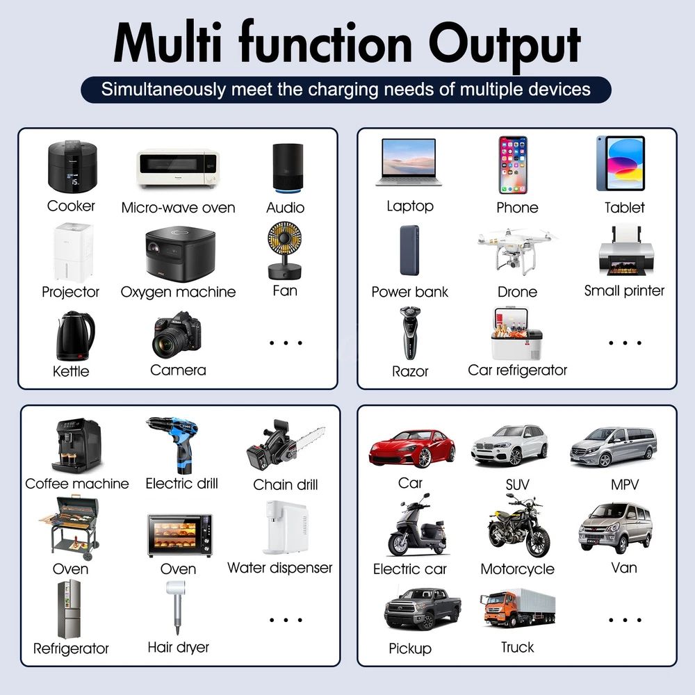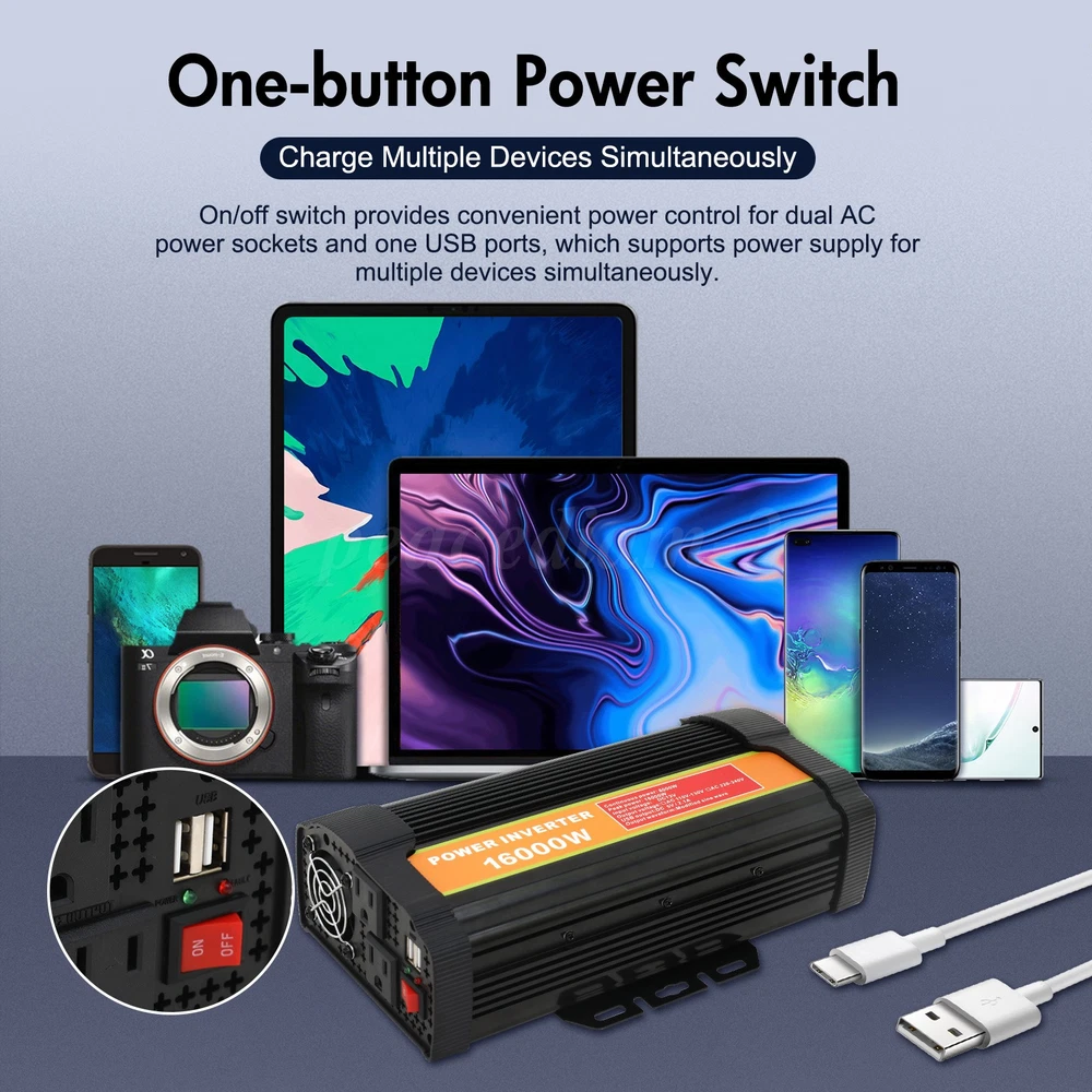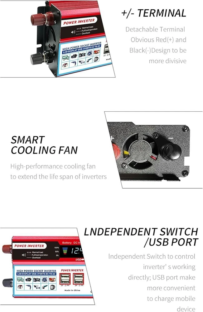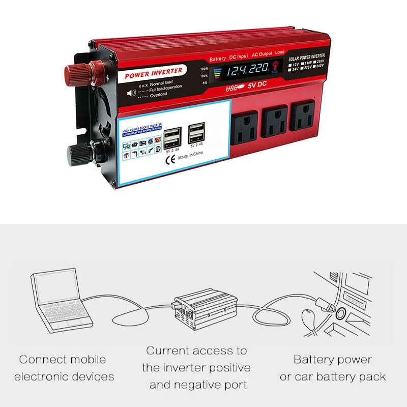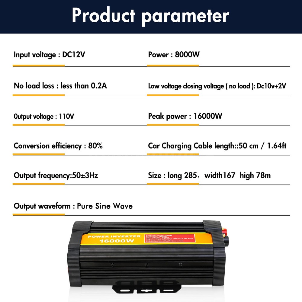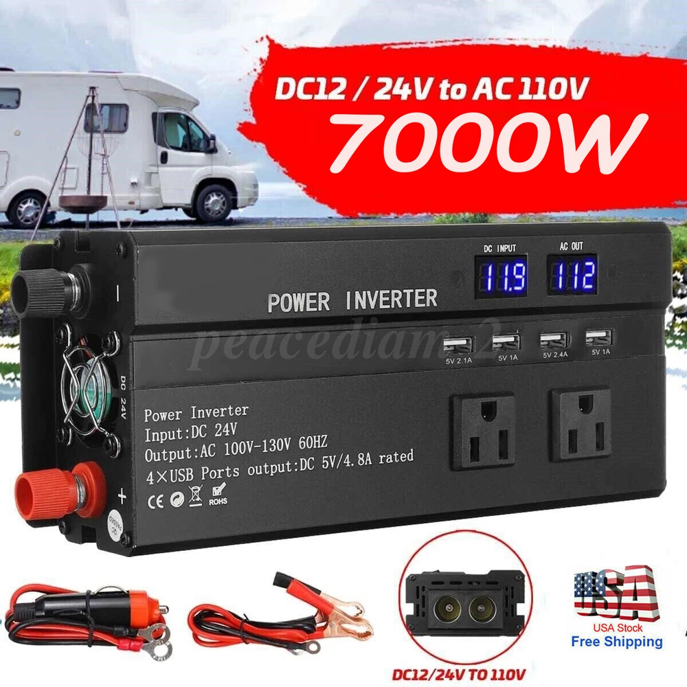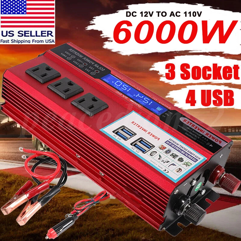 7000W 6000W Car Power Inverter DC 12V To AC 110V Home RV Solar Converter LCD 100% New & Excellent Quality Strictly QC, Each item was fully checked before shipping FREE & FAST Shipping delivery with Tracking Number 16000W Peak Pure Sine Wave Car Inverter - 12V to 110V DC-AC Converter β¨ Core Selling Points: 1000W Continuous/16000W Peak | Pure Sine Wave | Multi-Port Charging | Full Protections | Compact Features β‘ Clean pure sine wave, compatible with sensitive electronics π Multi-port design, charges 4 devices at once π‘οΈ Overvoltage/overload/short circuit/overheating etc. full protections + cooling fan π Compact lightweight, fits car/12V battery, for travel/emergency/outdoor use Specification Peak Power 16000W Continuous Power 1000W Input/Output DC 12V β AC 110V Output Waveform Pure Sine Wave Ports 2 AC Outlets + 2 USB 5V/2A Material Aluminum Alloy + PC Color Black Fuse 4Γ40A Digital Display Yes Operating Temp 0β-50β Package Contents 1 Γ 16000W Car Inverter 4 Γ Fuses 1 Γ Battery Clip(Red wire/Black wire) 1 Γ User Manual Important Notes 1.For DC 12V/car only (not 24V/airplane) 2.Turn off when car is off to avoid battery drain 3.Keep away from direct sunlight, use in cool environment 4.Slight image differences may exist due to display/lighting 7000W Peak Car Power Inverter - 12V/24V to 110V DC-AC Converter β¨ Core Selling Points: 7000W Peak Power | Modified Sine Wave | 2 AC + 4 USB Ports | LCD Display | Full Protections Specification Type Car Power Inverter Peak Power 7000W Input Voltage DC 12V/24V Output Voltage AC 110V Output Waveform Modified Sine Wave Frequency 60Hz Ports 2 AC Sockets + 4 USB Ports Conversion Efficiency ~95% Display LCD (Input/Output Voltage) Working Temp 0Β°C-40Β°C (32Β°F-104Β°F) Size 255Γ105Γ55mm / 10Γ4.13Γ2.2inch Net Weight 830g Material Aluminum Alloy Color Black Key Features β‘ 7000W peak power, converts 12V/24V DC to 110V AC π 6 ports total, supports simultaneous multi-device charging π LCD screen, real-time shows input/output voltage π‘οΈ Overvoltage/overload/short circuit/overheating etc. full protections + low-noise cooling fan π Compact lightweight, widely used for travel/emergency/outdoor/daily Package Contents 1 Γ Car Power Inverter 1 Γ Cigarette Lighter Adapter 1 Pair Γ 12V Car Battery Clips Important Notes 1.Minor size deviations from manual measurement are allowed 2.Slight image differences due to display/lighting (function unchanged) 3.Minor batch differences in product details; please purchase cautiously if you mind 4.Contact us for any product questions 6000W Peak Car Power Inverter - 12V/24V to 110V DC-AC Converter (Red) β¨ Core Selling Points: 6000W Peak/600W Continuous | Modified Sine Wave | 3 AC + 4 USB Ports | LCD Display | Full Protections Specification Type Car Power Inverter Peak Power 6000W Continuous Output Power 600W Input Voltage DC 12V/24V (12V for cars, 24V for trucks) Output Voltage AC 110V Output Waveform Modified Sine Wave Frequency 60Β±3Hz Conversion Efficiency >90% USB Output DC 5V (0.5A/1A/2.1A) Ports 3 AC Sockets + 4 USB Ports Display LCD (Real-time Input/Output Voltage) Size 200Γ102Γ58mm / 7.87Γ4Γ2.28inch Net Weight 730g / 1.6lbs Color Red Key Features β‘ 6000W peak/600W continuous power, converts 12V/24V DC to 110V AC π 7 total ports, supports fast multi-device simultaneous charging π LCD screen for real-time voltage monitoring, ensuring safe use π‘οΈ Full protections (overvoltage/overload/short circuit etc.) + low-noise cooling fan π Compact lightweight, ideal for travel, outdoor activities, emergencies, daily use Package Contents 1 Γ Car Power Inverter 1 Γ Cigarette Lighter Adapter 1 Pair Γ 12V Car Battery Clips Important Notes 1.Minor size deviations from manual measurement are allowed 2.Slight image differences due to display/lighting (function unchanged) 3.Minor batch differences in product details; please purchase cautiously if you mind 4.Contact us for any product questions or support