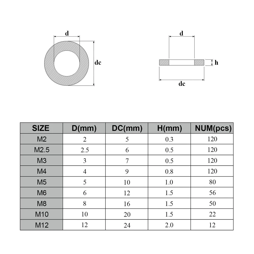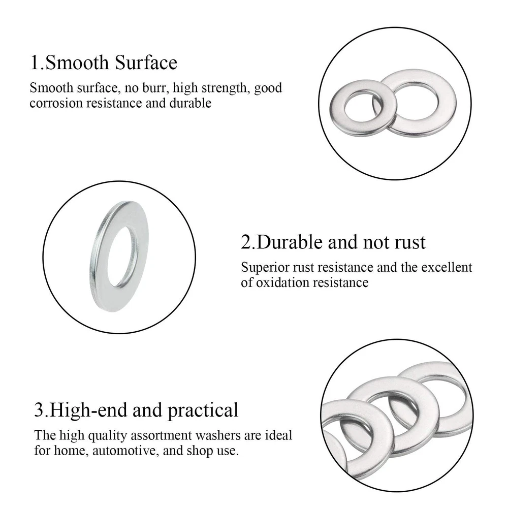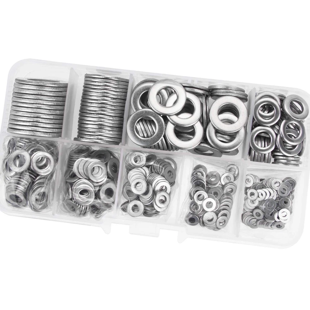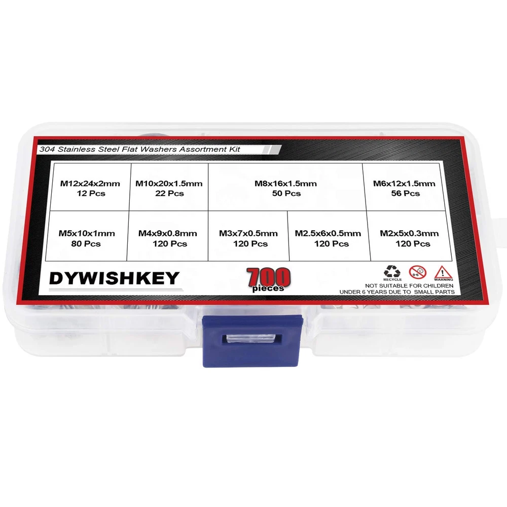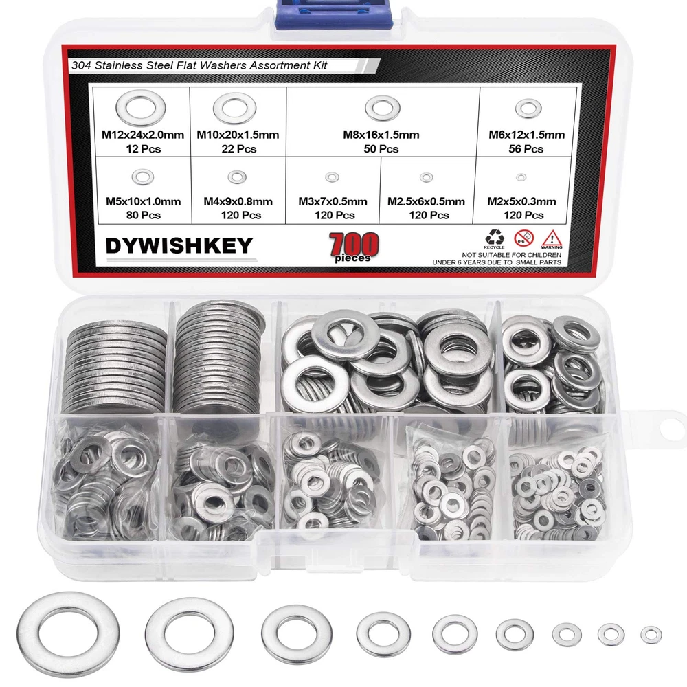 √ Size : M2 (120pcs), M2.5 (120pcs), M3 (120pcs), M4 (120pcs), M5 (80pcs), M6 (56pcs), M8 (50pcs), M10 (22pcs), M12 (12pcs), total 9 different sizes can meet your different needs. √ Material: High Quality 304 Stainless Steel, the 304 stainless steel material features strength and offers good corrosion resistance in bad environment like high temperature, cold weather, and high humidity areas. They have superior rust resistance and the excellent of oxidation resistance, which can ensure long time using. √ Feature: Weak Magnetic, the magnetic properties of 304 stainless steel due to the structure transformation reasons are not at the same level as the magnetic properties of stainless steel of other materials, which means that the magnetic properties of 304 steel always show weak magnetic properties √ Package: All DYWISHKEY 700PCS 9 Sizes Stainless Steel Flat Washer are packed into a sturdy transparent box organizer. Not only give you the best flat washers, but also the best storage system for them. Sufficient number to meet your daily use √ Widely Applications: Perfect for electrical connections on household and commercial appliances, automotive and marine uses in which the power source has a threaded/bolt-type connection. If you have any questions about our products, welcome your inquiry and we will solve the problem for you in time. 【Specifications:】 ● Color: Silver ● Package Quality: 700 PCS ● Washer Type: Flat Washer ● Material: High-quality 304 Stainless Steel ● Sizes: M2 M2.5 M3 M4 M5 M6 M8 M10 M12 【How to judge whether it is 304 stainless steel material?】 304 stainless steel is cold-worked and its structure will be transformation, the greater the degree of cold work deformation, the more transformation, the greater the magnetic properties of the steel. On the contrary, the 200-series stainless steel of the second-class quality is likely to be nonmagnetic, so it is a mistake to judge that it is a genuine stainless steel. In particular, the magnetic properties of 304 stainless steel due to the above reasons are not at the same level as the magnetic properties of stainless steel of other materials, which means that the magnetic properties of 304 steel always show weak magnetic properties. This tells us that if the stainless steel strip is weakly magnetic or not magnetic at all, it should be judged as 304; if it is the same as the magnetic steel, it shows strong magnetism, because it is judged not to be 304 material. 【Package Included:】 <1> M2------------------- 120 PCS <2> M2.5----------------- 120 PCS <3> M3 ------------------- 120 PCS <4> M4 ------------------- 120 PCS <5> M5 --------------------- 80 PCS <6> M6 --------------------- 56 PCS <7> M8 --------------------- 50 PCS <8> M10-------------------- 22 PCS <9> M12 ------------------- 12 PCS 【Total: 700 PCS, 9 Sizes】 Note: Small parts, keep away from children under 6 years old.