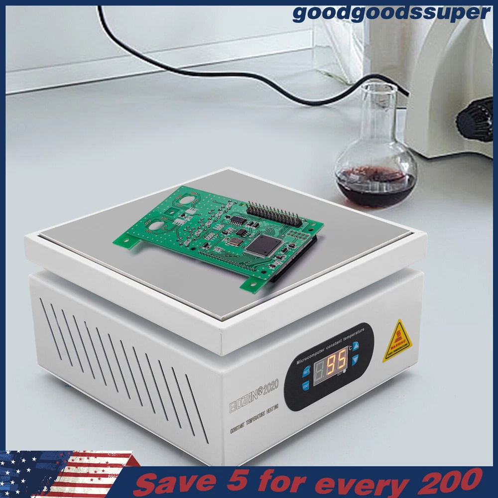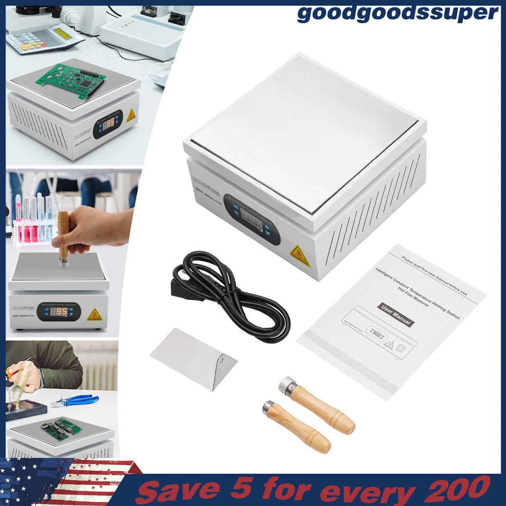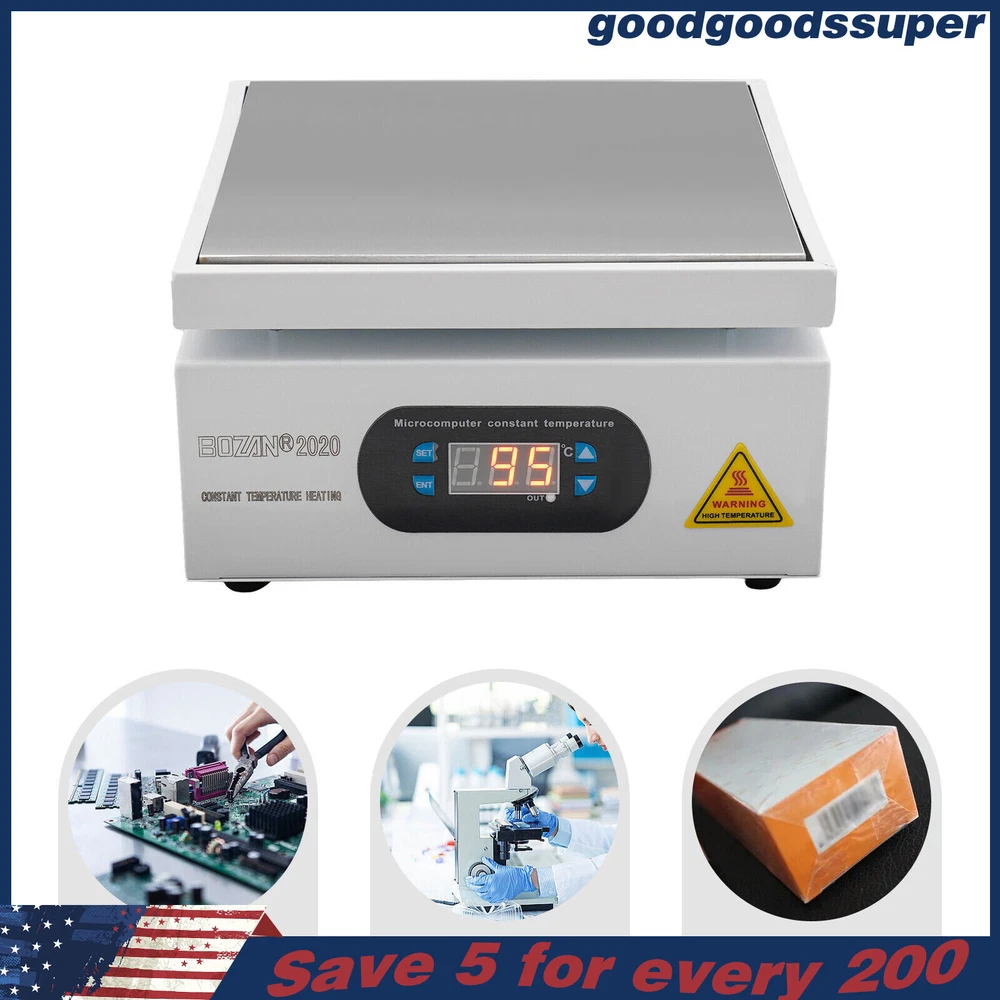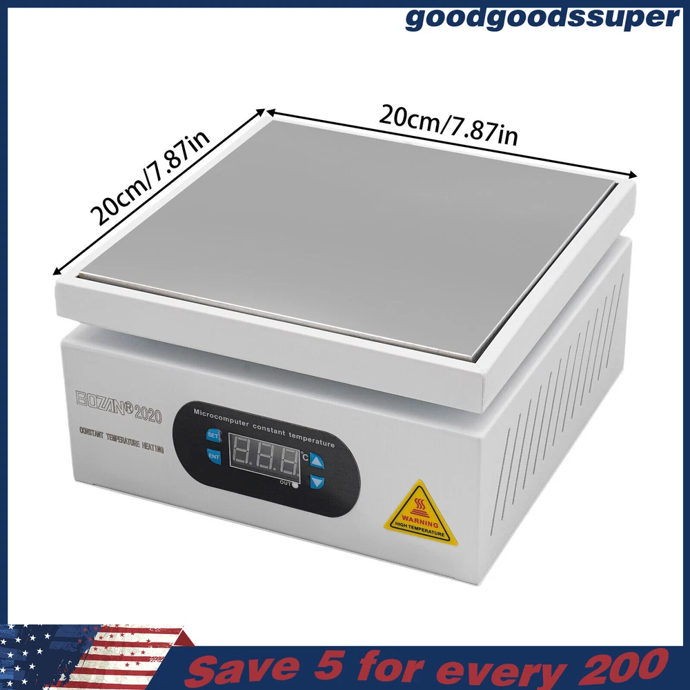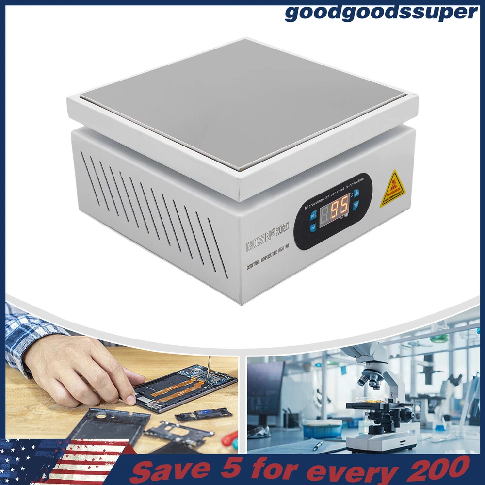 welcome to goodgoodssuper Description This microcomputer electric hot plate allows for fast, even, and stable heating, making your work more efficient. The product is made of aluminum alloy and metal plate, which is sturdy and durable while ensuring good heat conductivity. It is easy to operate and has a wide range of temperature adjustments and a 7.87*7.87-inch heat plate, making it widely available in different industries. Key Features Sturdy and Durable: The product is mainly made of aluminum alloy and metal plate and adopted wire drawing and spray paint processes, making it not easy to corrode and deform so that it can bear high-tension use and has a long service life. High Heating Efficiency: The 700W high power and aluminum alloy heating plate with high thermal conductivity can ensure that the heating plate and the workpiece are heated evenly and quickly to improve your working efficiency. Multi-functions: The product comes with multiple functions to make your work easier, which include the menu-locking function, temperature correction, and the auto-tuning function. Constant Temperature: The product adopts a microcomputer chip with low energy consumption, which can control the temperature intelligently and accurately for even, stable, and quick heating. Simple Operation: It comes with a digital display that can show you the temperature so that you can easily and precisely control the temperature from 32-932℉ through the operation panel. In addition, the product also has a memory function. After saving the temperature, the next time the product starts it will automatically heat up to the last set temperature. Safety Guarantee: The product is equipped with a three-prong power cord socket made of insulating material to avoid leakage of electricity. The fuse tube next to the socket helps avoid fire while protecting the circuit heater core and allowing for easy replacement. Wide Compatibility: The 7.87*7.87-inch heating plate and 32-932℉ adjustable temperature make our products suitable for heat shrink film packaging, PCB removal, chemistry experiments, and other fields. Protective Packaging: The pearl cotton can better protect your product during transportation so that it can be delivered to you completely to the greatest extent. Customer Service: We aim to provide quality products and services. If you have any problems, please feel free to contact us. We will reply and solve the problem for you as soon as possible. Details Non-slip Feet: They provide stable support to prevent the product from sliding during operation, and protect the countertop from scratches. Heat Emission Holes: The heat-sink holes on the left and right sides allow air convection to promote heat dissipation and increase the service life of the heater. Surrounding Edge Wrapping: The heating platform is designed with edges around it to prevent accidental contact and scalding during operation. This design also avoids slips or scratches. Tools for Shrinking Packaging: These tools can be used to press and secure film packages for heat-shrink packaging. Application The products can be used for splitting, repairing cell phone screens, LED displays, component work, PCB dismantling, soldering work, component heating work, SMD rebuilding work, packaging box plastic sealing hot film work, etc. Temperature Range (For Reference Only) 300-400°C/572-752℉: Pre-heating of mold cores and various metal materials 200-300°C/392-572℉: BGA ball welding 200-250°C/392-482℉: LED bead soldering, maintenance 150-200°C/302-392℉: Preheating and repair for electronic circuit board 80-120°C/176-248℉: Remove cell phone screen 30-100°C/86-212℉: Heating laboratory reagents 30°C/86℉: Heating Medical Experiment, Cell Culture, and Liquid Specifications Color: White+Silver Material: Metal Plate, Aluminum Alloy Process: Wire Drawing, Spray Paint Plug Type: US Standard Power: 700W Voltage: 110V Power Cord Length: About 1.5m/4.92ft Power Cord Diameter: About 6.7mm/0.26in Heating Area: 20*20cm/7.87*7.87in Adjustable Temperature Range: 0-500℃/32-932℉ Packaging Size: 26.5*26.5*18.5cm/10.43*10.43*7.28in Gross Weight: 3.1kg/6.8lbs Package Included 1* Microcomputer Electric Hot Plate 1*Power Cord 1*English Manual Other Needed Accessories Notes Please check the size carefully before ordering. Please read the operating manual completely before use. And pay particular attention to the safety instructions included. Please make sure the machine is well grounded before use. Please do not let the airflow blow directly onto the circuit board, otherwise, it will affect the heating of the heater. Before use, please make sure that the ventilation window on the chassis of the thermostatic platform is not blocked by foreign objects, so as not to affect its heat dissipation effect. Please do not place the product in damp and corrosive places for use or storage. Please make sure that the tabletop with the thermostatic platform is flat and not inclined to keep the aluminum heating platform level. Please also make sure that the desktop material must be heat-resistant . The surface of the workpiece and the surrounding area are very hot during product operation, so please do not use the hot plate near flammable materials, and please take care not to allow yourself to be scalded or burned. If you need to move or touch the machine, please turn off the power and wait for the heating plate to cool down completely to room temperature. To prolong the service life of the heating element and the machine, please do not use the machine for a long time under high temperatures (higher than 300℃/572℉). Under normal circumstances, the machine should not work continuously for more than 8 hours. This machine is a high-temperature electrically heated product. Please disconnect the power supply if the machine is not in use to avoid danger and accidents. Please allow the slight color difference caused by the shooting light and 1-3cm error due to manual measurement, an