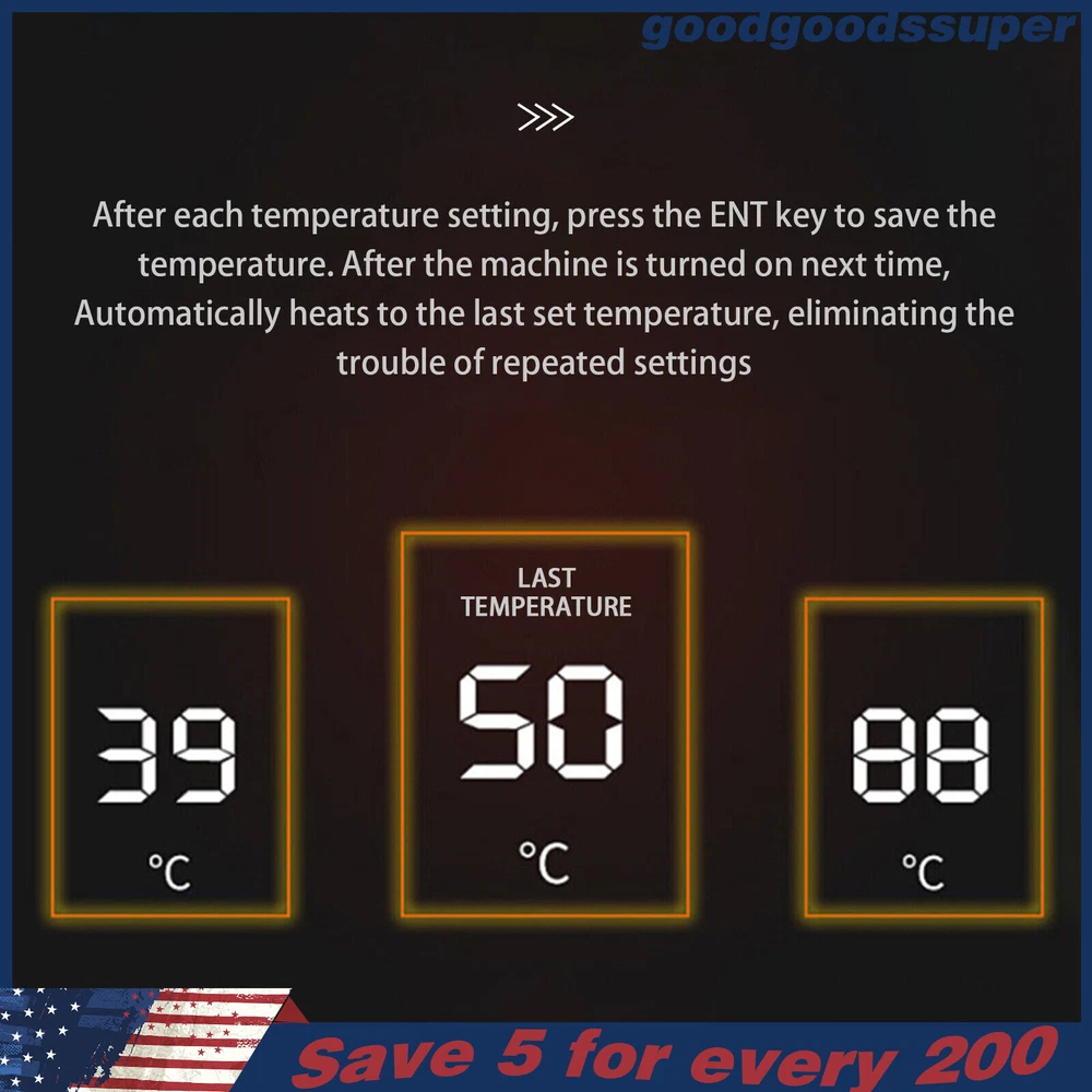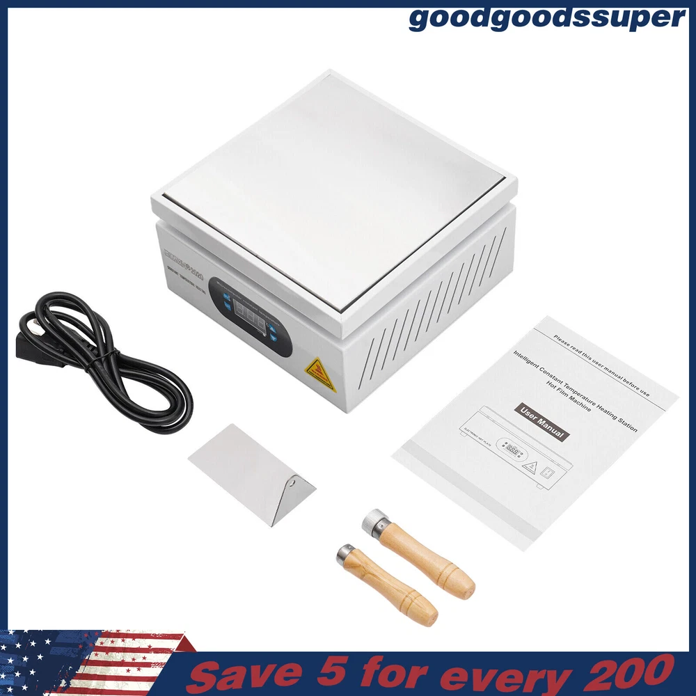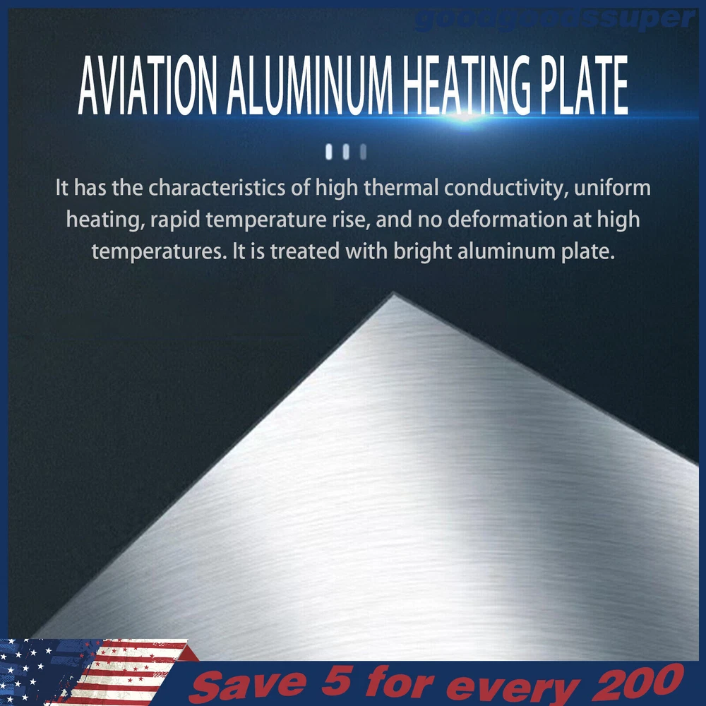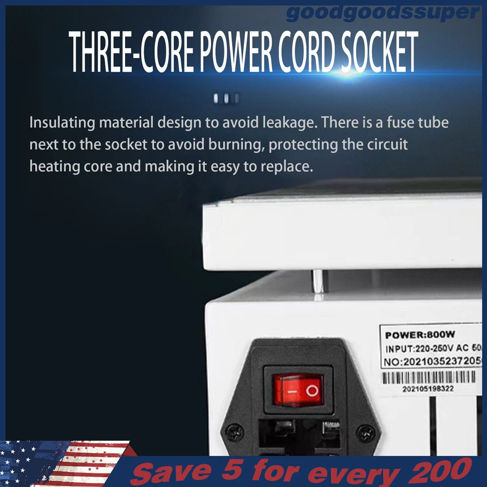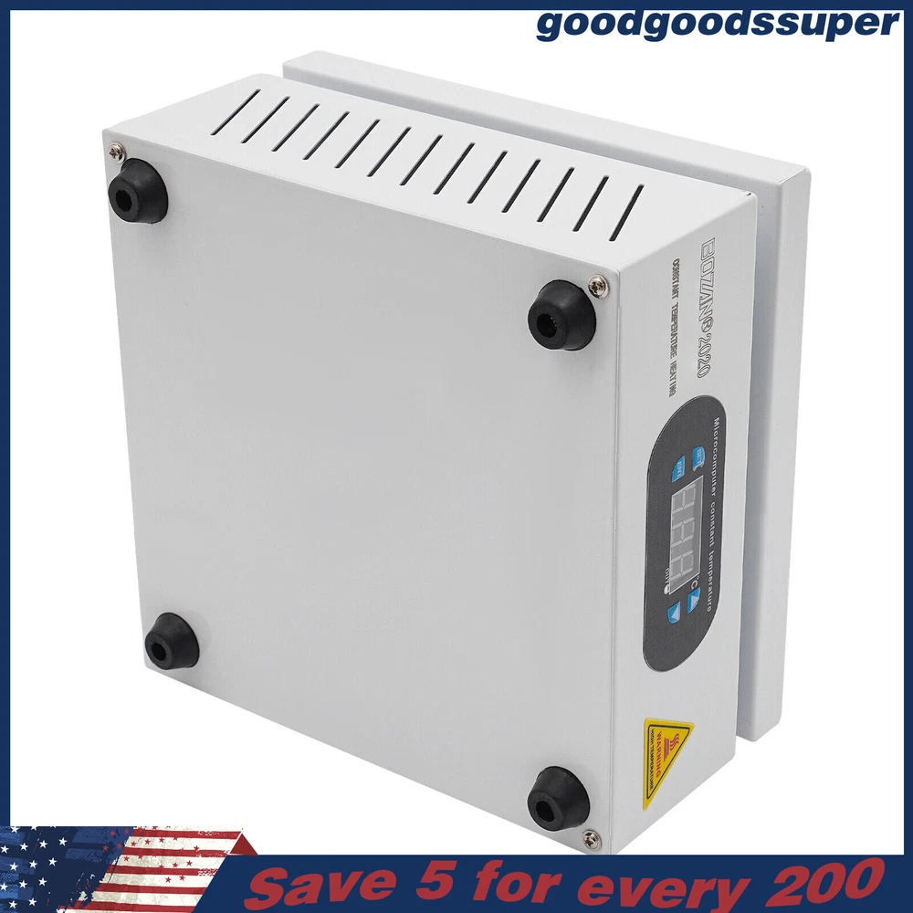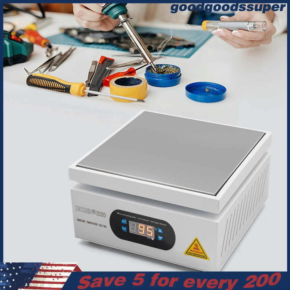 welcome to goodgoodssuper Description This microcomputer electric hot plate allows for fast, even, and stable heating, making your work more efficient. The product is made of aluminum alloy and metal plate, which is sturdy and durable while ensuring good heat conductivity. It is easy to operate and has a wide range of temperature adjustments and a 7.87*7.87-inch heat plate, making it widely available in different industries. Key Features Sturdy and Durable: The product is mainly made of aluminum alloy and metal plate and adopted wire drawing and spray paint processes, making it not easy to corrode and deform so that it can bear high-tension use and has a long service life. High Heating Efficiency: The 700W high power and aluminum alloy heating plate with high thermal conductivity can ensure that the heating plate and the workpiece are heated evenly and quickly to improve your working efficiency. Multi-functions: The product comes with multiple functions to make your work easier, which include the menu-locking function, temperature correction, and the auto-tuning function. Constant Temperature: The product adopts a microcomputer chip with low energy consumption, which can control the temperature intelligently and accurately for even, stable, and quick heating. Simple Operation: It comes with a digital display that can show you the temperature so that you can easily and precisely control the temperature from 32-932℉ through the operation panel. In addition, the product also has a memory function. After saving the temperature, the next time the product starts it will automatically heat up to the last set temperature. Safety Guarantee: The product is equipped with a three-prong power cord socket made of insulating material to avoid leakage of electricity. The fuse tube next to the socket helps avoid fire while protecting the circuit heater core and allowing for easy replacement. Wide Compatibility: The 7.87*7.87-inch heating plate and 32-932℉ adjustable temperature make our products suitable for heat shrink film packaging, PCB removal, chemistry experiments, and other fields. Protective Packaging: The pearl cotton can better protect your product during transportation so that it can be delivered to you completely to the greatest extent. Customer Service: We aim to provide quality products and services. If you have any problems, please feel free to contact us. We will reply and solve the problem for you as soon as possible. Details Non-slip Feet: They provide stable support to prevent the product from sliding during operation, and protect the countertop from scratches. Heat Emission Holes: The heat-sink holes on the left and right sides allow air convection to promote heat dissipation and increase the service life of the heater. Surrounding Edge Wrapping: The heating platform is designed with edges around it to prevent accidental contact and scalding during operation. This design also avoids slips or scratches. Tools for Shrinking Packaging: These tools can be used to press and secure film packages for heat-shrink packaging. Application The products can be used for splitting, repairing cell phone screens, LED displays, component work, PCB dismantling, soldering work, component heating work, SMD rebuilding work, packaging box plastic sealing hot film work, etc. Temperature Range (For Reference Only) 300-400°C/572-752℉: Pre-heating of mold cores and various metal materials 200-300°C/392-572℉: BGA ball welding 200-250°C/392-482℉: LED bead soldering, maintenance 150-200°C/302-392℉: Preheating and repair for electronic circuit board 80-120°C/176-248℉: Remove cell phone screen 30-100°C/86-212℉: Heating laboratory reagents 30°C/86℉: Heating Medical Experiment, Cell Culture, and Liquid Specifications Color: White+Silver Material: Metal Plate, Aluminum Alloy Process: Wire Drawing, Spray Paint Plug Type: US Standard Power: 700W Voltage: 110V Power Cord Length: About 1.5m/4.92ft Power Cord Diameter: About 6.7mm/0.26in Heating Area: 20*20cm/7.87*7.87in Adjustable Temperature Range: 0-500℃/32-932℉ Packaging Size: 26.5*26.5*18.5cm/10.43*10.43*7.28in Gross Weight: 3.1kg/6.8lbs Package Included 1* Microcomputer Electric Hot Plate 1*Power Cord 1*English Manual Other Needed Accessories Notes Please check the size carefully before ordering. Please read the operating manual completely before use. And pay particular attention to the safety instructions included. Please make sure the machine is well grounded before use. Please do not let the airflow blow directly onto the circuit board, otherwise, it will affect the heating of the heater. Before use, please make sure that the ventilation window on the chassis of the thermostatic platform is not blocked by foreign objects, so as not to affect its heat dissipation effect. Please do not place the product in damp and corrosive places for use or storage. Please make sure that the tabletop with the thermostatic platform is flat and not inclined to keep the aluminum heating platform level. Please also make sure that the desktop material must be heat-resistant . The surface of the workpiece and the surrounding area are very hot during product operation, so please do not use the hot plate near flammable materials, and please take care not to allow yourself to be scalded or burned. If you need to move or touch the machine, please turn off the power and wait for the heating plate to cool down completely to room temperature. To prolong the service life of the heating element and the machine, please do not use the machine for a long time under high temperatures (higher than 300℃/572℉). Under normal circumstances, the machine should not work continuously for more than 8 hours. This machine is a high-temperature electrically heated product. Please disconnect the power supply if the machine is not in use to avoid danger and accidents. Please allow the slight color difference caused by the shooting light and 1-3cm error due to manual measurement, an