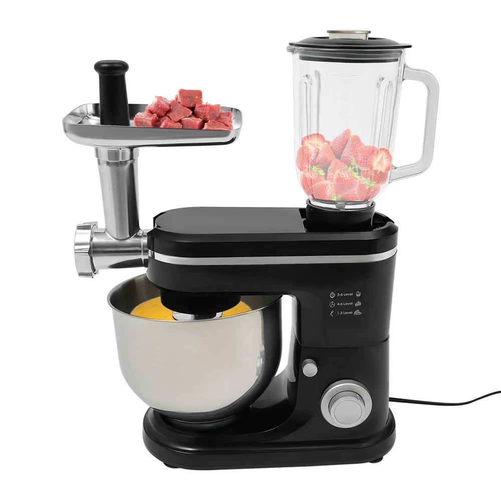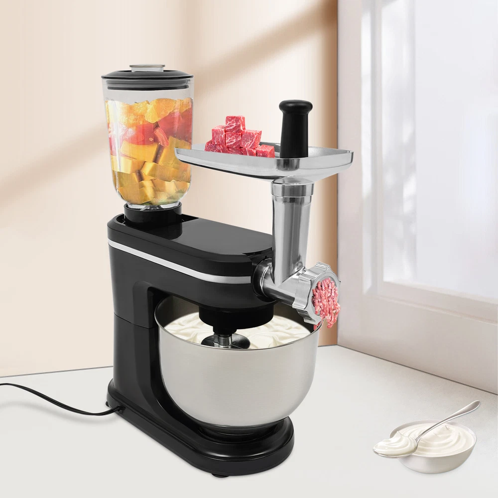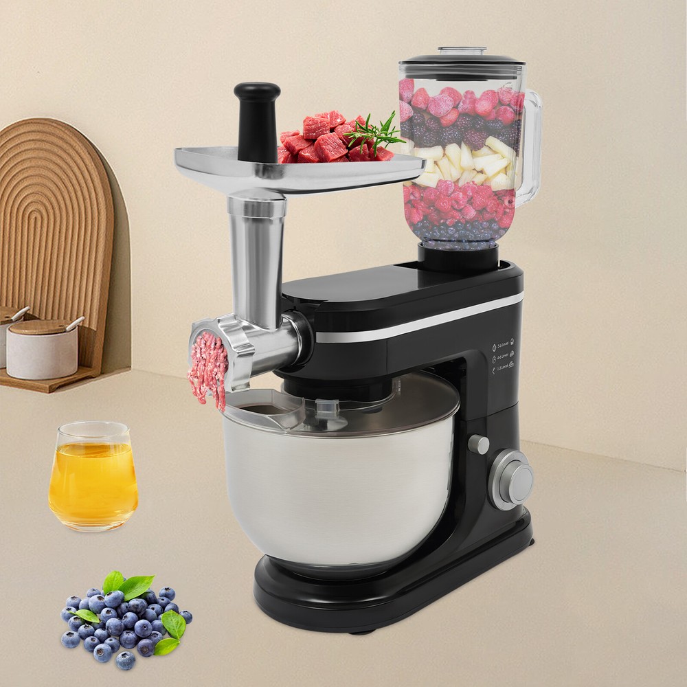 Specifications Style: Modern Color: Black, Silver Material: ABS, 304 Stainless Steel, Glass Mounting Type: Free Standing Assembly Required: Yes Control Type: Knob Power Source: Corded Electric Plug Type: US Standard Motor Type: 8830 Motor Volatge: 110-120V, 50/60Hz Power: 700W Speed Gears: 6+1(Pulse Function) Mixing Bowl Capacity: 6L/6.34qt Juice Container Capacity: 1.5L/1.58qt Noise: 90db Power Cord Length: 1m/3.28ft Gross Weight: 8.3kg/18.3lbs Net Weight: 7kg/15.43lbs Product Size: 35*18*54.75cm/13.78*7.09*21.56in Package Size: 61*36*27cm/24.02*14.17*10.63in Package Included 1* Kitchen Mixer 1* Douch Hook 1* Mixing Beater 1* Whisk 1* Juice Container 1*Anti-splash Guard 1*Mixing Bowl 1* English Manual Other Assembly Accessories 6.34-QT 700W 7-Speed Multi-function Kitchen Electric Stand Food Mixer w/ juicer Description 6.34-QT 700W 7-Speed Multi-function Kitchen Electric Stand Food Mixer w/ juicer Description Look at our kitchen mixer, it is a helpful assistant for your kitchen. It is made of premium materials, so it is safe to use and durable. This machine is compact and lightweight, so you can easily store it in the cabinet. As a daily mixer, it is easy to operate and clean up. The clear anti-splash guard could prevent the ingredients from making a mess. It comes with 6+1-speed options and three different mixing tools that can satisfy precise needs for various mixing tasks. Key Features Build to Last : The product is made of high-quality ABS, glass and 304 stainless steel, making it durable, and not easy to rust and corrosion, so it can remain beautiful and practical for a long time. Powerful Function: It has a strong power (700W) as well as a knob that allows you to adjust 6 mixing speeds, allowing you to finish kneading and mixing more quickly and thoroughly than human hands, and the pulse function can deliver short bursts of power at the optimal speed to blend mixtures evenly. Thoughtful Design: A deepened mixing bowl( 6.34qt ) can thoroughly mix flour, eggs, and other ingredients inside. The enhanced gear and enclosed transmission can provide powerful power to the machine and achieve the noise reduction function, ensuring smooth operation. High Safety: The Hall sensor of the machine has a motor overheating automatic power off thermal protection function that can ensure your safety as well as easy for you to replace the accessories when using, in addition, the cooling holes can dissipate the heat in time to ensure the stability of the product when using. Multi-function Machine: Its mixing bowl can hold enough ingredients and is equipped with a whisk, beater, and dough hook to facilitate the mixing of different ingredients and meet the dietary needs of you and your family. The meat grinder provides freshly ground meat when required, and the provided meat pusher offers you a safe and convenient use experience. 1.58qt glass juice container allows the sharing of more vegetable juice, fruit juice, or milkshakes, creating delightful beverages for family and friends. Ready to Use: Complete accessories and a detailed English manual make it very convenient and time-saving for you to use it directly after receiving it. Compact and Lightweight: With its compact size (13.78*7.09*21.56 inches) and lightweight ( 15.43 lbs ), you can use it conveniently or store it in your cabinet without taking up too much space, making it suitable for small kitchen, apartment, or limited storage space. Ideal Gift: Because of its powerful functions and practicality, you can give it to your friends as a Christmas, Thanksgiving, or housewarming gift. Quality Service: We are honored that you have chosen our product. We have sufficient confidence in the quality of the product so that you can buy it confidently. But if you have any questions, you can contact our customer service, he will patiently answer and solve your problems . Details 6 Suction Pads: They provide a non-slip effect to ensure product stability . Locking Groove: It helps secure the mixing bowl more accurately. Heads-up Button: It allows the attachment of the agitator section to be lifted upwards, making it easy for you to remove or replace the agitator. Splash-proof Cover: The clear anti-splash guard helps you with process monitoring and facilitates pouring water, milk, or other liquid ingredients(not included) through the small holes in the splash guard when needed while preventing ingredients from running out of the bowl, making cleanup easier. Handle: The handle on the juicer makes it easy to grip and pour your juice (not included). Application It can be used in kitchens, restaurants, bakeries, etc. for smoothies, pizza, waffles, milkshakes, bread, dough, whipped cream, marble cakes, mincemeat, juice and more! Specifications Style: Modern Color: Black, Silver Material: ABS, 304 Stainless Steel, Glass Mounting Type: Free Standing Assembly Req uired: Yes Control Type: Knob Power Source: Corded Electric Plug Type: US Standard Motor Type: 8830 Motor Volatge: 110-120V, 50/60Hz Power: 700W Speed Gears: 6+1(P ulse Function ) Mixing Bowl Capacity: 6L/ 6.34qt Juice Container Capacity: 1.5L/1.58qt Noise: 90db Power Cord Length: 1m/3.28ft Gross Weight: 8.3kg/18.3lbs Net Weight: 7kg/15.43lbs Product Size: 35*18*54.75cm/13.78*7.09*21.56in Package Size: 61*36*27cm/24.02*14.17*10.63in Package Included 1* Kitchen Mixer 1* Douch Hook 1* Mixing Beater 1* Whisk 1* Juice Container 1* Anti-splash Guard 1*Mixing Bowl 1* English Manual Other Assembly Accessories Notes Please note that the mixing elements are not dishwasher safe! Please note that this product does not include any food ingredients. Before purchasing, please make sure that the capacity of this product is available for your needs. It is suitable for the new baker, 1-2 members, or small family in everyday use. If you are a pro-baker or need to handle large batches of mixing, please consider other larger-capacity mixers. Please read the English manual carefully before use and pay particular attention to the sa