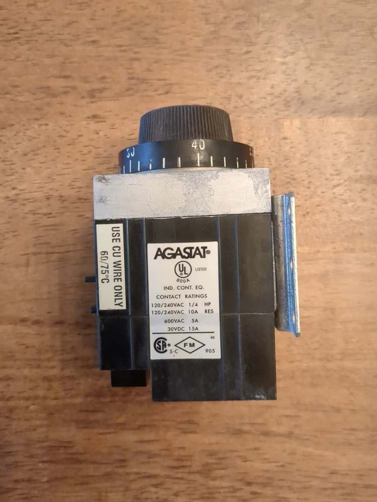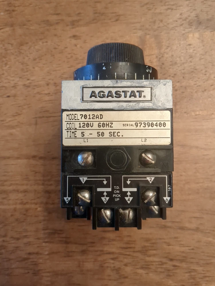 This is an Agastat 7012AD time delay relay designed to operate with a 120V power supply. It has an adjustable time delay range of 5 to 50 seconds, offering flexibility in controlling electrical circuits. This relay is suitable for various industrial and commercial applications requiring precise timing functions.