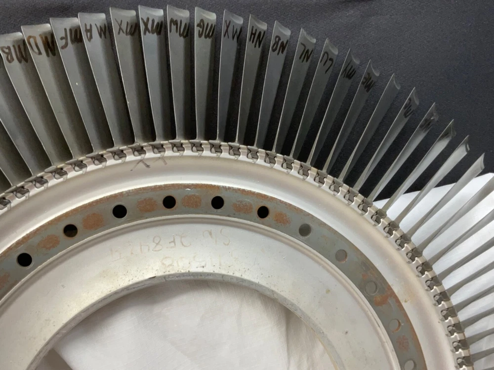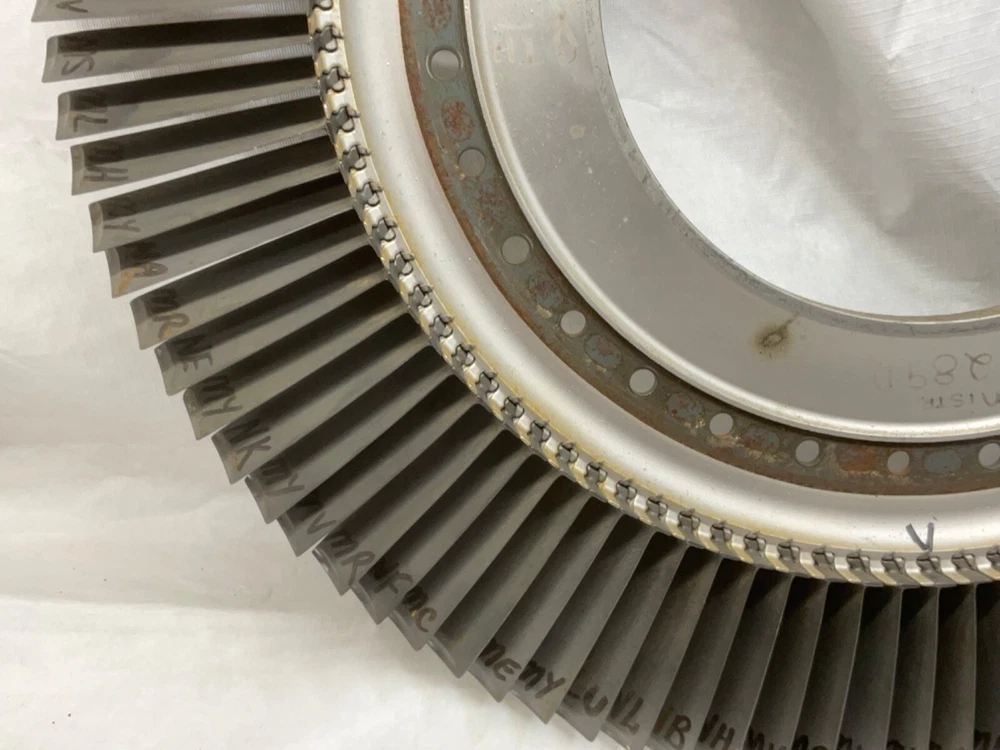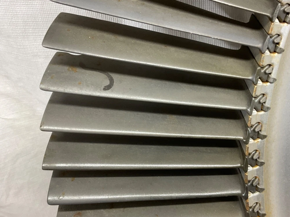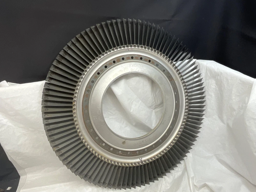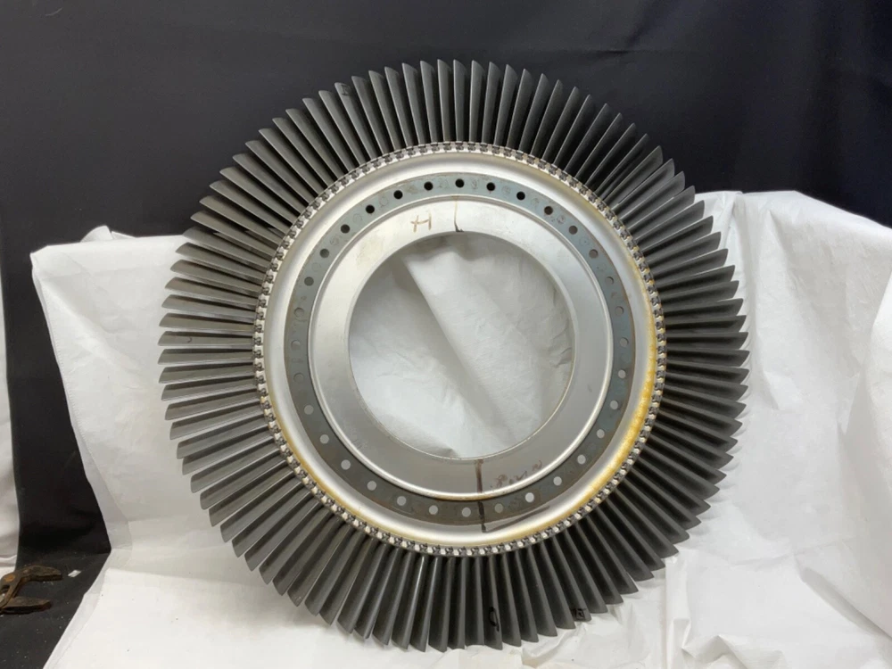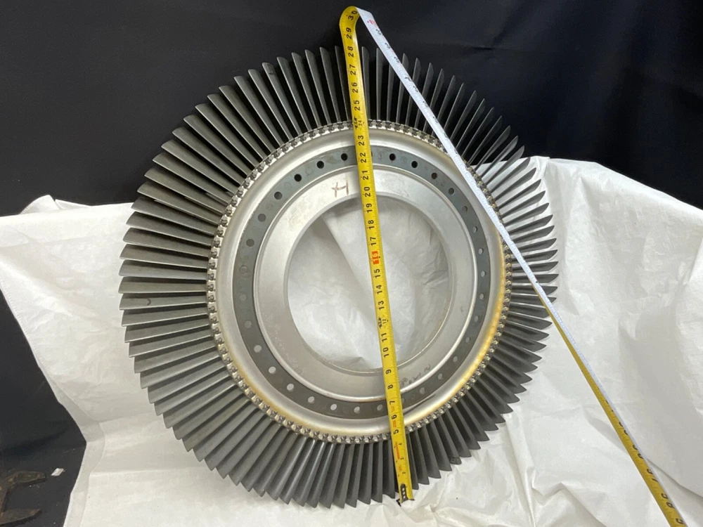 This is a full set of compressor blades from I believe a Boeing 707 Pratt and Whitney JT3D Jet engine. I am not sure about the plane or engine, that is a best guess from research. This is compressor ring from a rebuilt engine that was not put back into service. The piece is very clean and the markings on the blades indicate it hasn’t been used again. This is approximately 28 inches in diameter and 38 pounds. A magnet will stick to all of the parts, the blades themselves and the ring. So they are all steel and not titanium. I counted 101 individual blades. I have cut the center out of one of these leaving about 1-1/2 inch of the hub and added an inverted cone, with a glass top it looks very good. This item is not to be used for its original purpose as an engine component. This is sold for artistic purposes only. Use your imagination and have fun building something cool.