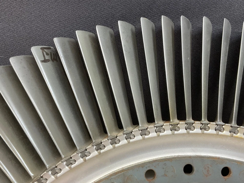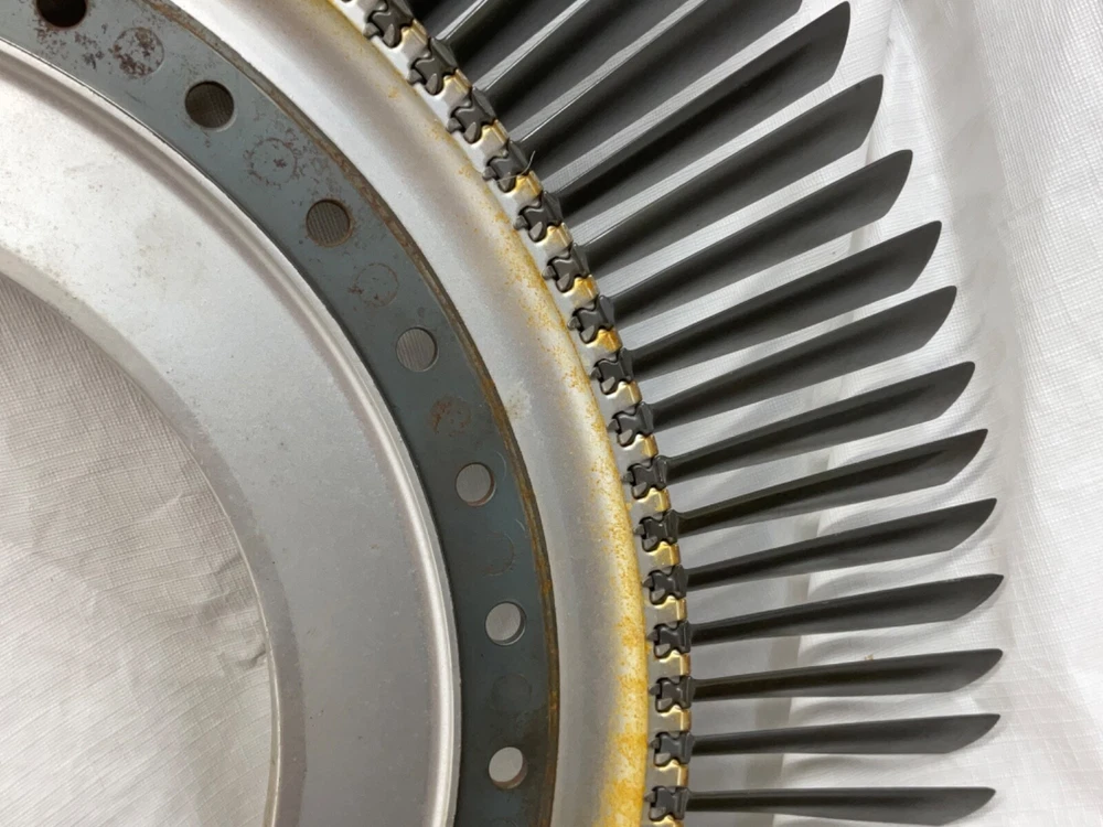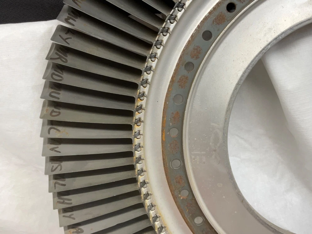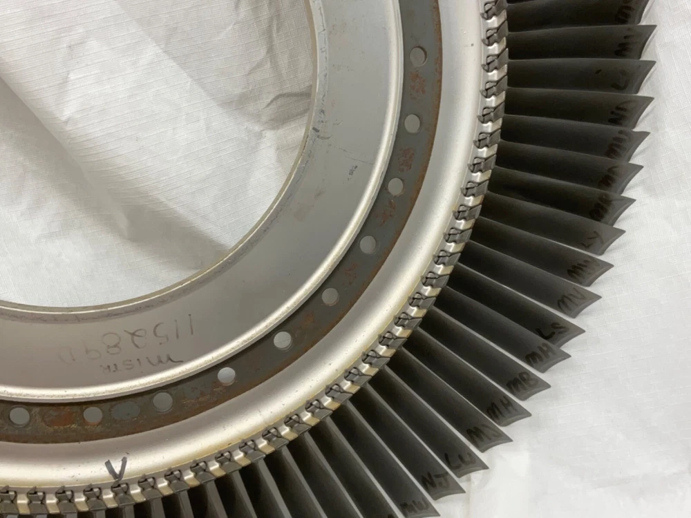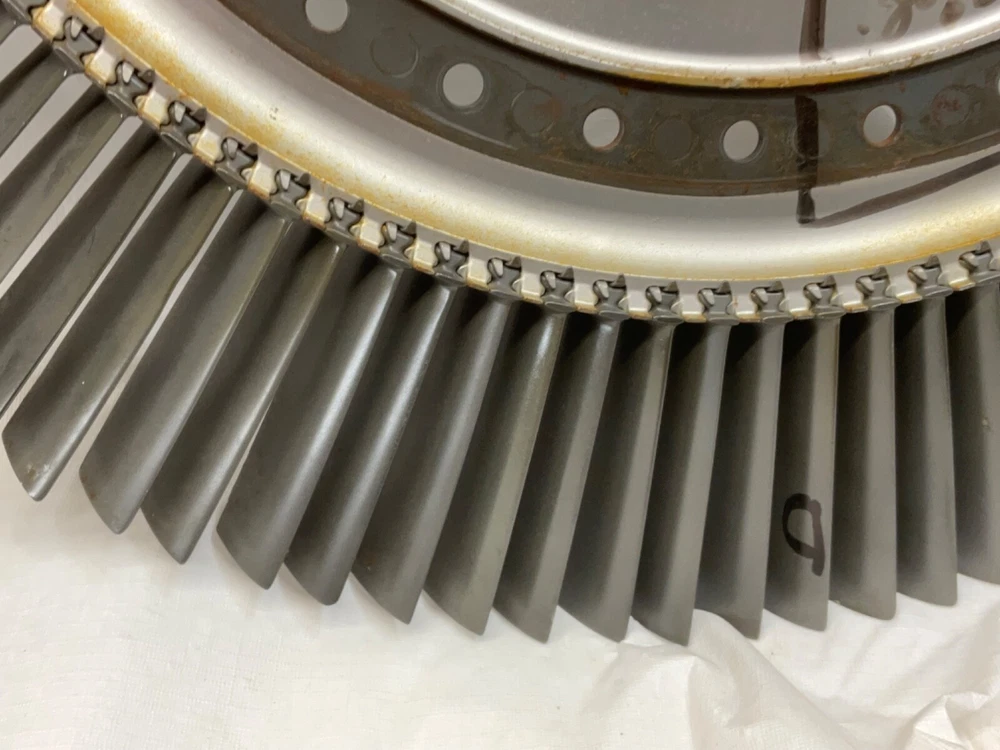 This is a full set of compressor blades from I believe a Boeing 707 Pratt and Whitney JT3D Jet engine. I am not sure about the plane or engine, that is a best guess from research. This is compressor ring from a rebuilt engine that was not put back into service. The piece is very clean and the markings on the blades indicate it hasn’t been used again. This is approximately 28 inches in diameter and 38 pounds. A magnet will stick to all of the parts, the blades themselves and the ring. So they are all steel and not titanium. I counted 101 individual blades. I have cut the center out of one of these leaving about 1-1/2 inch of the hub and added an inverted cone, with a glass top it looks very good. This item is not to be used for its original purpose as an engine component. This is sold for artistic purposes only. Use your imagination and have fun building something cool.