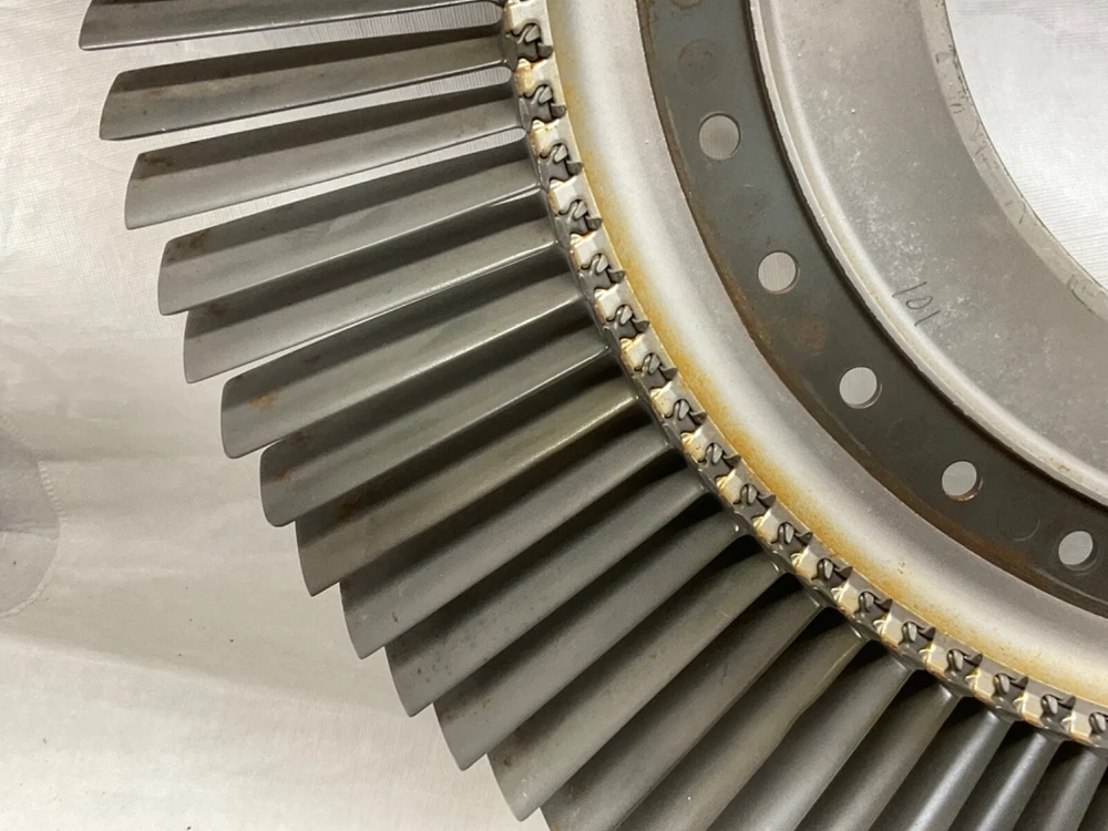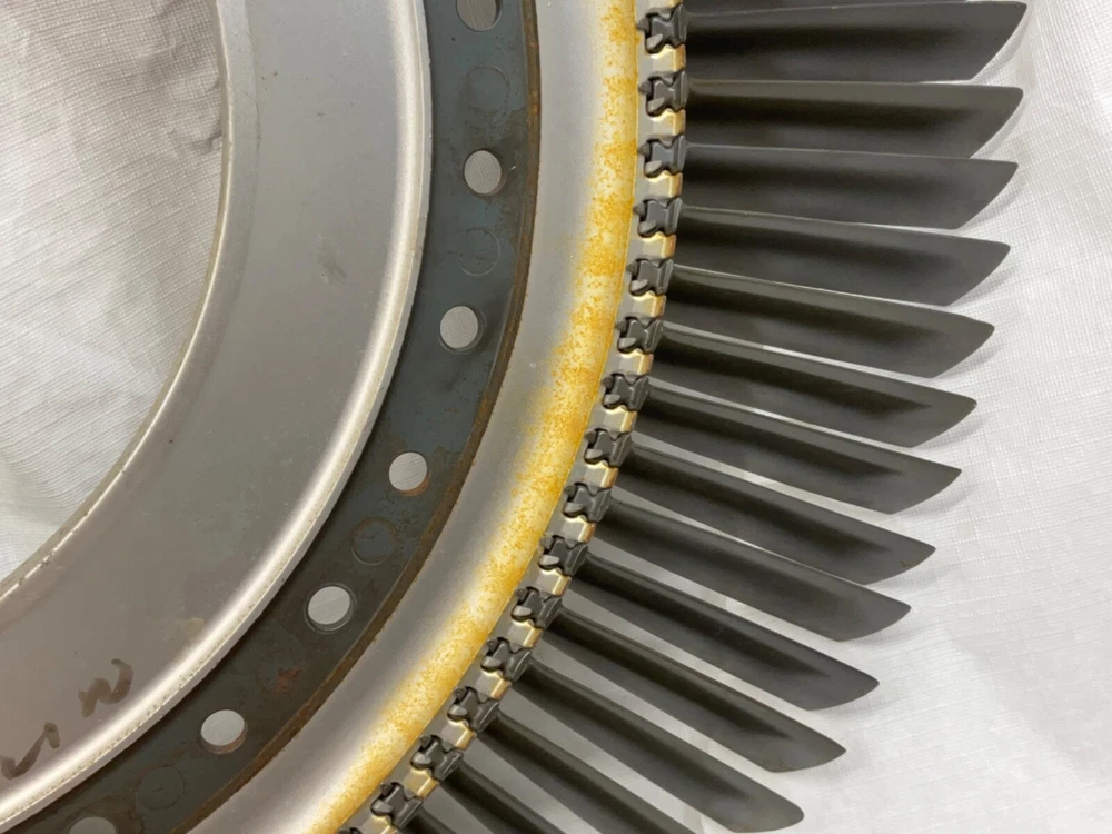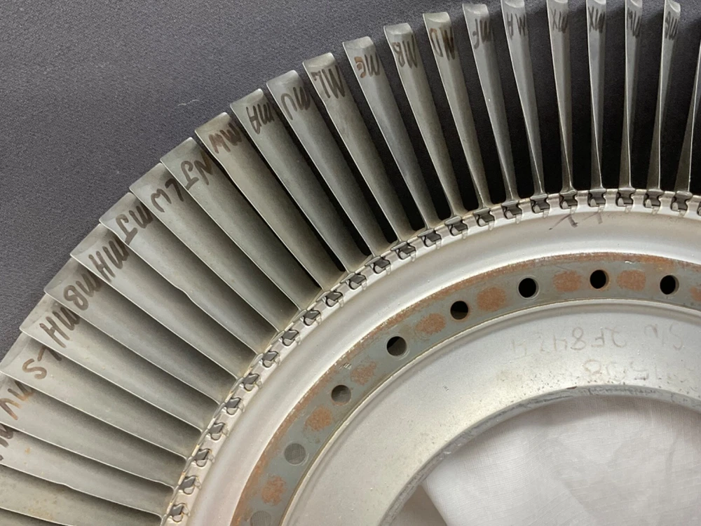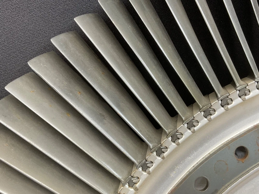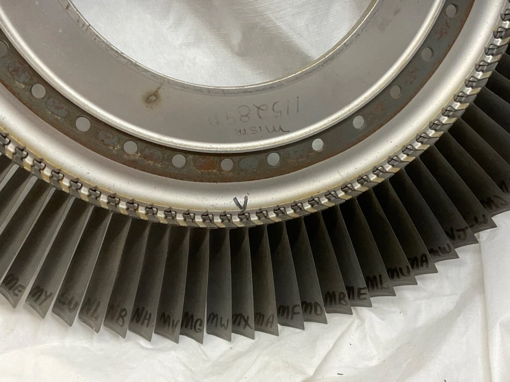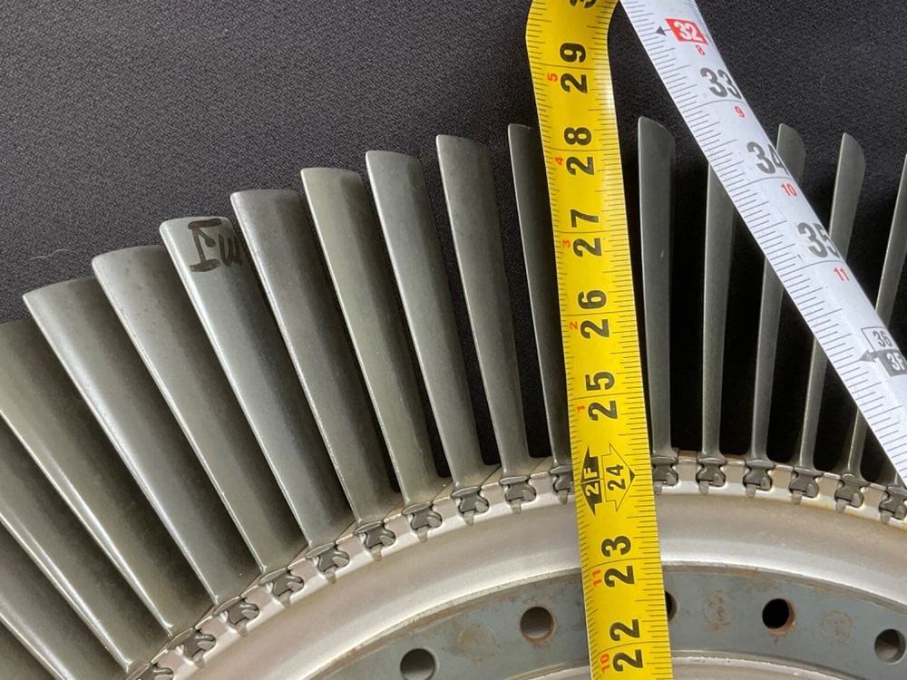This is a full set of compressor blades from I believe a Boeing 707 Pratt and Whitney JT3D Jet engine. I am not sure about the plane or engine, that is a best guess from research. This is compressor ring from a rebuilt engine that was not put back into service. The piece is very clean and the markings on the blades indicate it hasn’t been used again. This is approximately 28 inches in diameter and 38 pounds. A magnet will stick to all of the parts, the blades themselves and the ring. So they are all steel and not titanium. I counted 101 individual blades. I have cut the center out of one of these leaving about 1-1/2 inch of the hub and added an inverted cone, with a glass top it looks very good. This item is not to be used for its original purpose as an engine component. This is sold for artistic purposes only. Use your imagination and have fun building something cool.