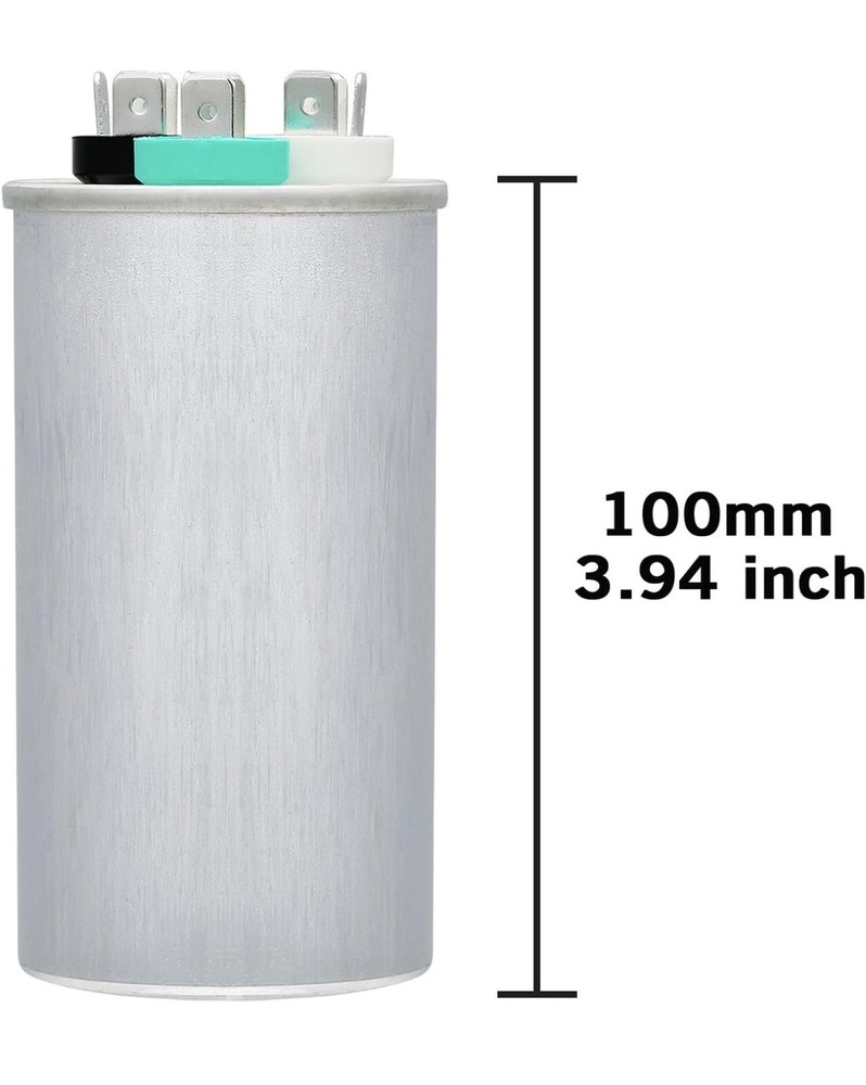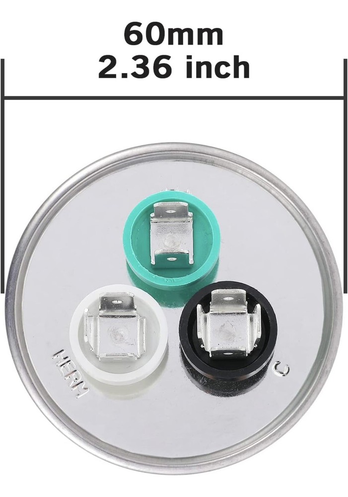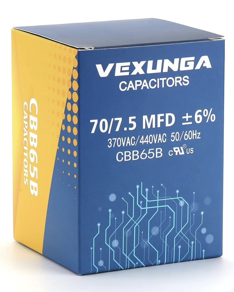 This Vexunga CBB65B motor run capacitor is a high-quality electrical component suitable for HVAC and AC motor applications. With a capacitance rating of 70+7.5 uF and a tolerance rating of ±5%, this capacitor ensures reliable and efficient performance. The metalized polypropylene film capacitor construction and round shape make it easy to install and handle. This stand-alone capacitor has a minimum operating temperature of -40 °C (-40 °F) and a maximum operating temperature of 70 °C (158 °F). It operates on a voltage range of 65-450 V and has a resistance rating of 3000 MΩ. The item diameter is 2.13 inches, and it comes in a box packaging. This product contains chemicals known to the State of California to cause cancer and birth defects or other reproductive harm, as indicated by the California Prop 65 Warning. The manufacturer warranty is one year.