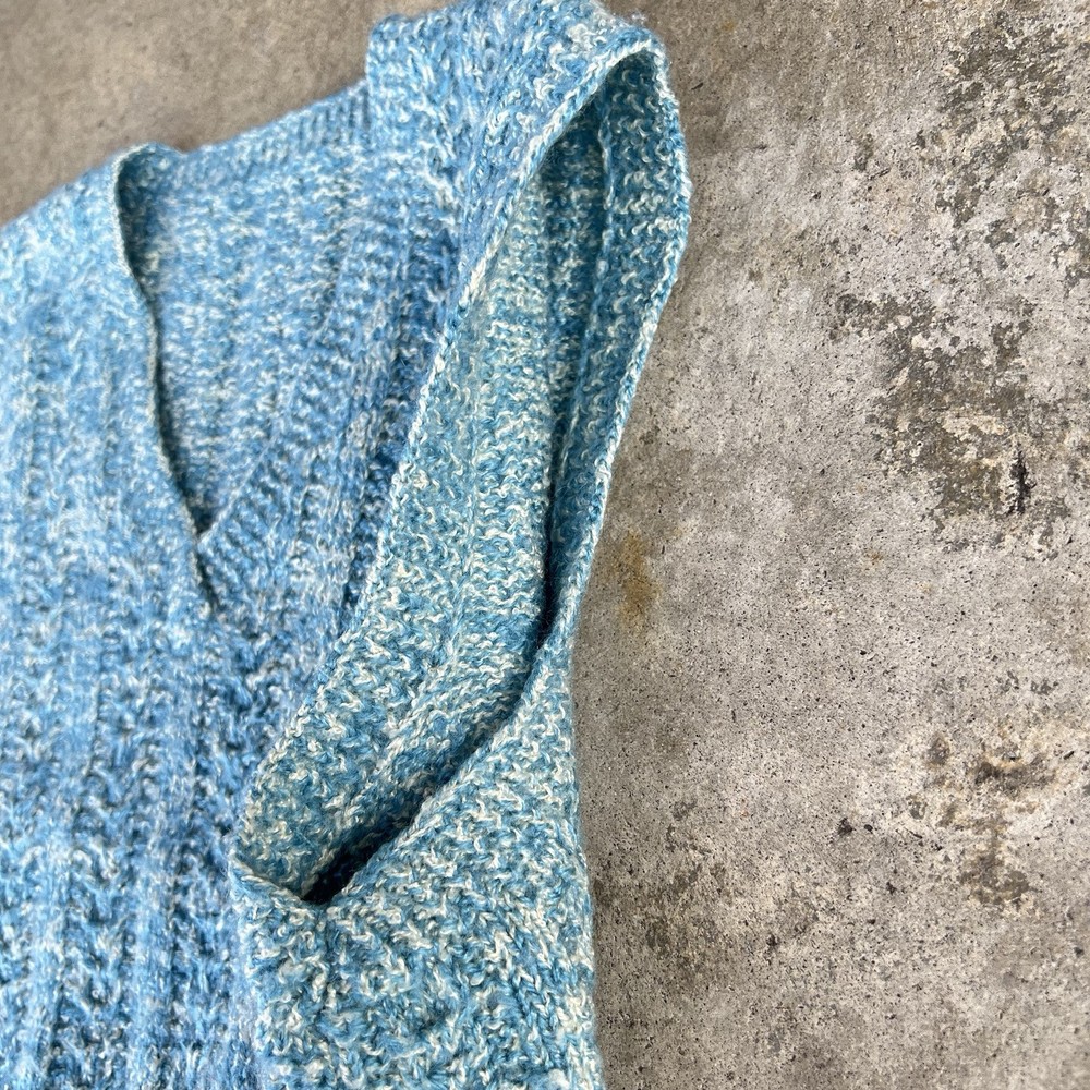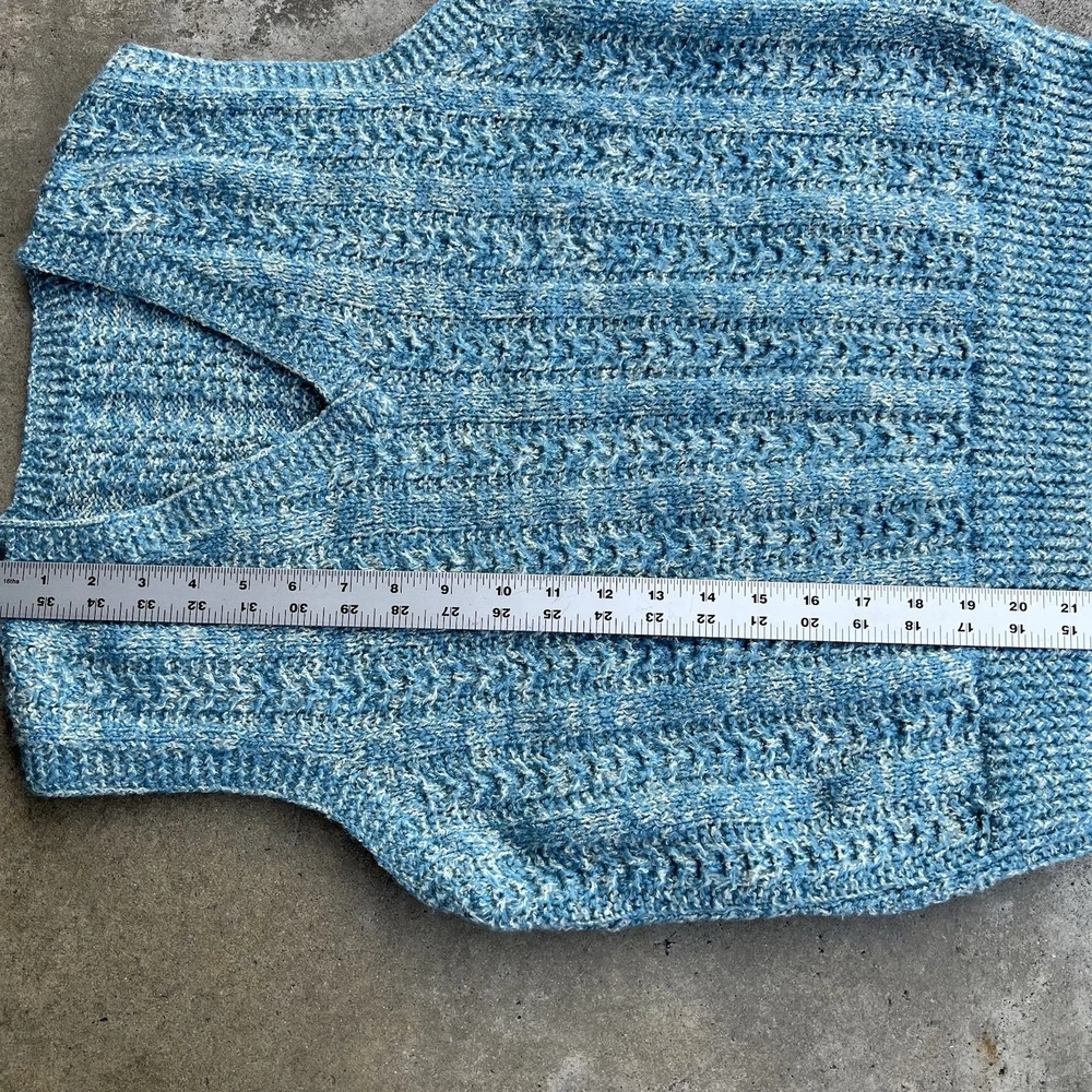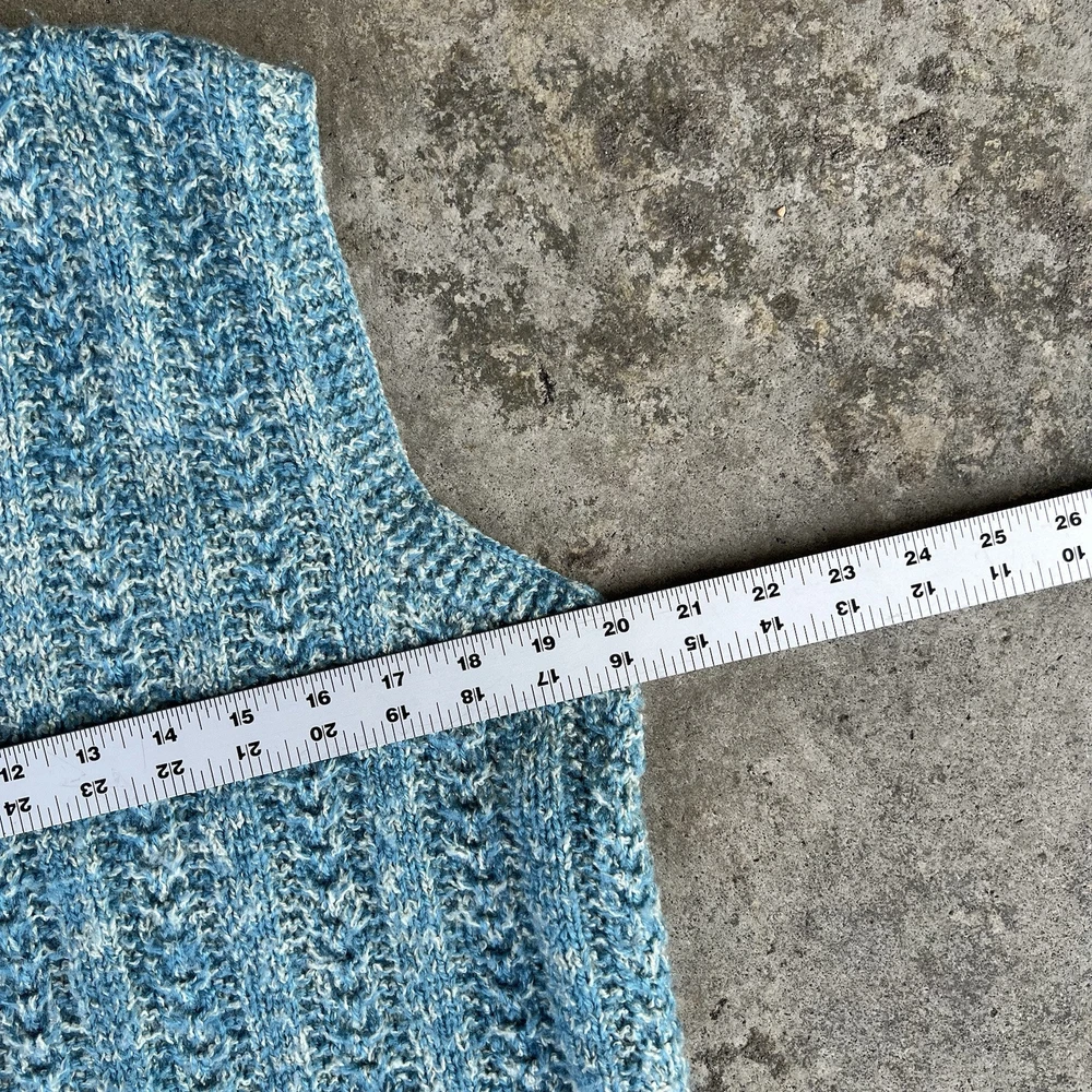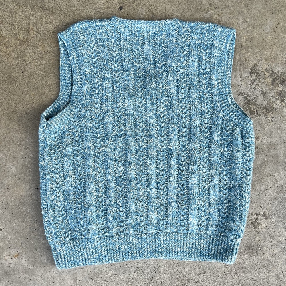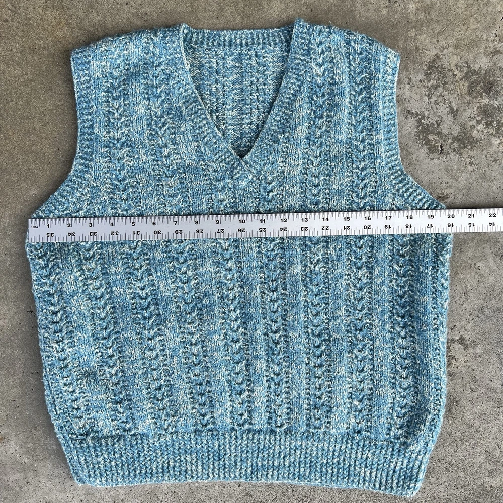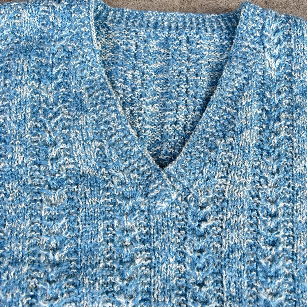 Item: Vintage 1970's 'Hand Knit' V-Neck sweater vest Size: No tag but looks to fit 'MEDIUM' best. Measurements: 20" x 21.5" Arm Opening: 8.5" Details: A rare and stylish authentic true vintage piece perfect for layering Great preppy / period piece that is in really good shape. There might be a couple yellowed or stained areas but it's really hard to find them because of how the sweater is knit and how small they are. *Ideal for fans of 70s fashion, retro academia, or cottagecore aesthetics ✔ Era: 1970s ✔ Style: Sweater Vest, Preppy, Retro, Collegiate ✔ Material: Feels like wool or wool blend (no label to confirm) ✔ Color: Marled blue & white ✔ Pattern: Cable knit with ribbed details ✔ Fit: Classic vintage fit, slightly boxy Ships fast & securely from a smoke-free home. Feel free to message with any questions!