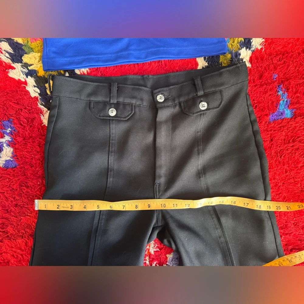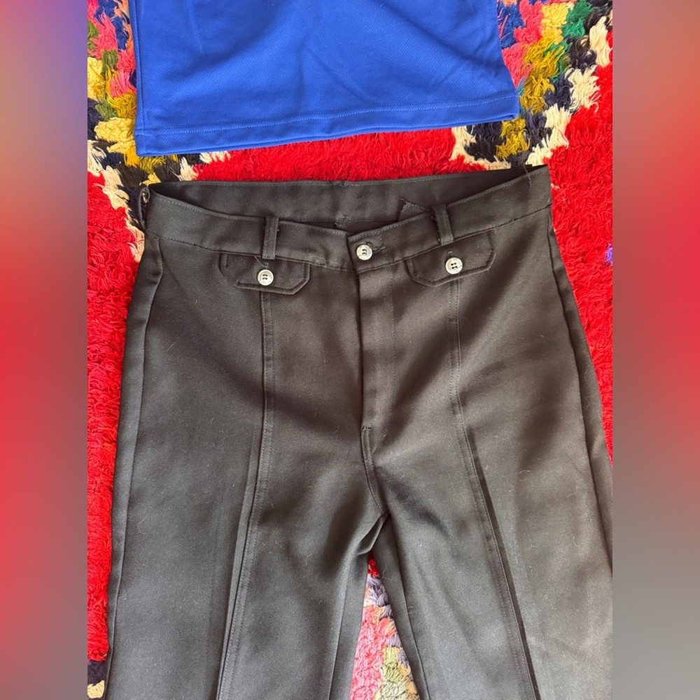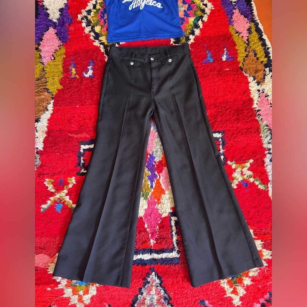 This is an incredible pair of 1970s vintage disco era unisex bell bottoms. Made of a black poly, they have a mid to high waisted fit with two faux front pockets and a stitched seam down both legs. They zip with a talon zipper. Likely made for men initially, but can be worn unisex. Studio 54, Saturday night fever vibes. Have no size tag - see measurements in photos for best fit. Approx a 32 waist with some stretch. Approx a small to medium women’s.