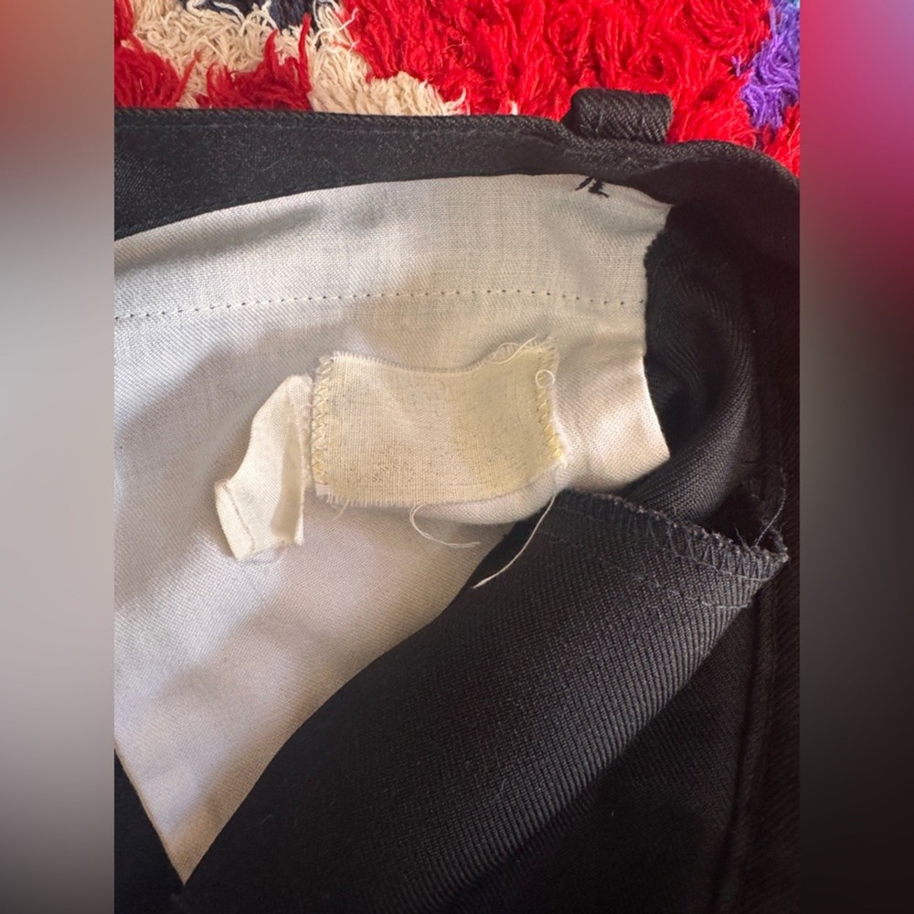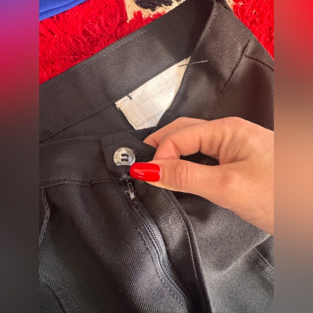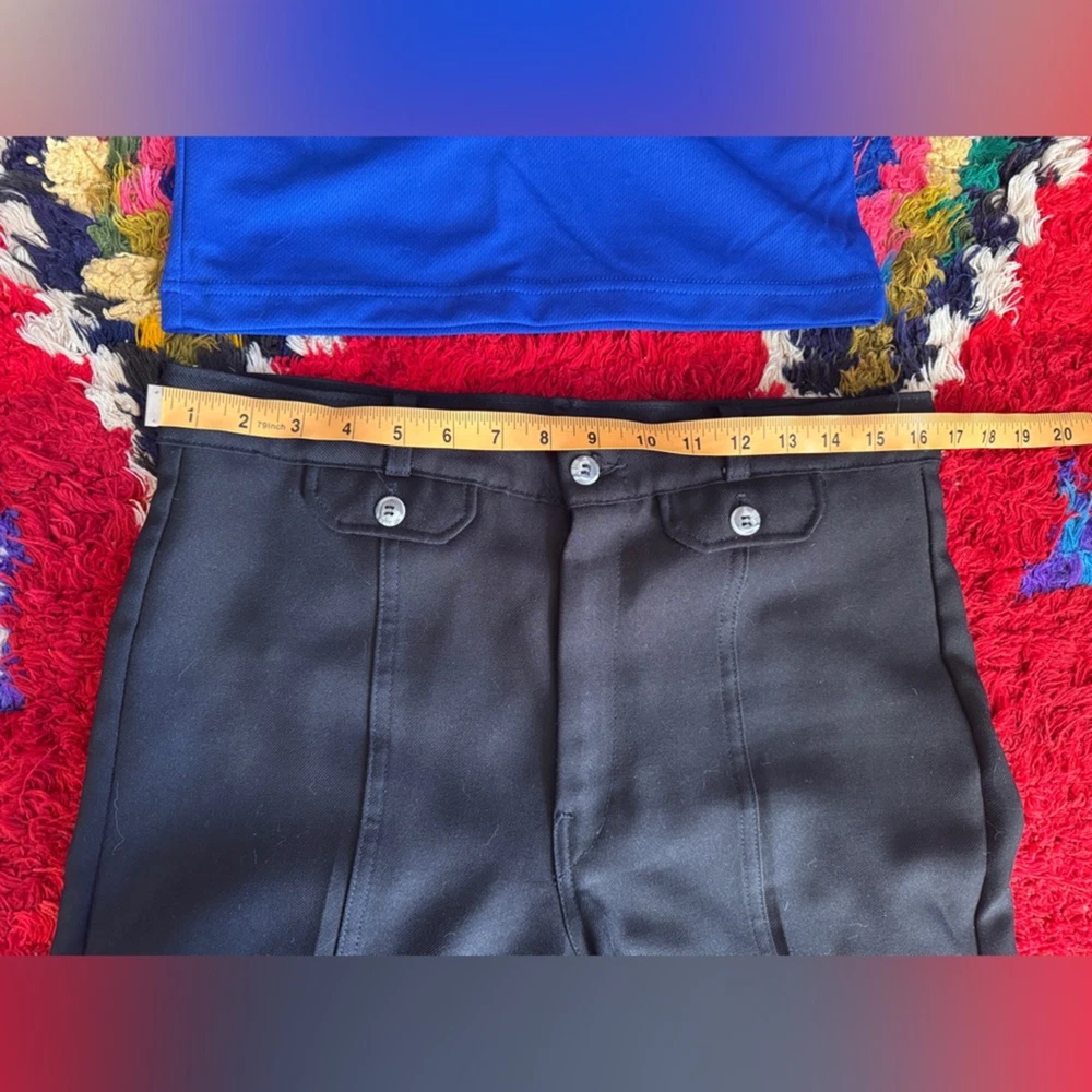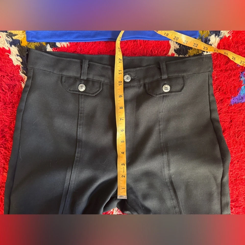 This is an incredible pair of 1970s vintage disco era unisex bell bottoms. Made of a black poly, they have a mid to high waisted fit with two faux front pockets and a stitched seam down both legs. They zip with a talon zipper. Likely made for men initially, but can be worn unisex. Studio 54, Saturday night fever vibes. Have no size tag - see measurements in photos for best fit. Approx a 32 waist with some stretch. Approx a small to medium women’s.