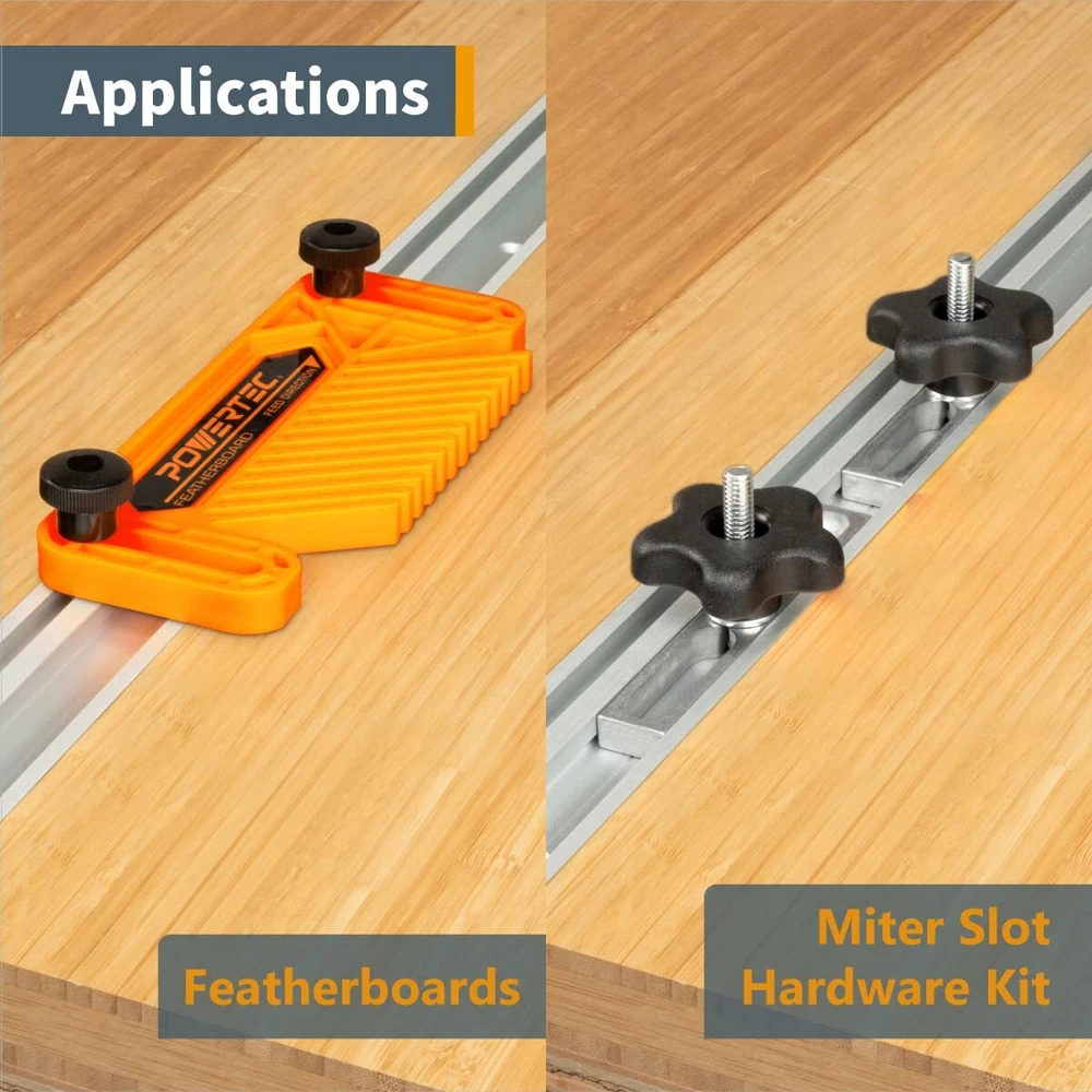 Introducing the 48" Aluminum T-track by . This heavy duty T-Track is designed to work with an assortment of general purpose fixture and jig applications. In addition to a multitude of unique enhancements, it features an extruded anodized aluminum construction, delivering a solid and durable design. An extruded line, in the bottom of the track, provides for easy and precise alignment when mounting. Unlike other brands, it’s delivered to you unblemished, with a smooth and straight profile, and without the structural flaws that may affect your project goals. Whether you’re utilizing metal or woodworking machines, this t-track gives you consistently reliable and highly accurate results. Fittings: Miter track accepts standard 3/4" X 3/8" Miter gauge bar | T-track possesses specialized T-slot Track mounting for standard 1/4”-20 hex-bolts or DuBois 51055 and 51056, T-Bolts for ¼” T-Track. Please note, will not work with T-Bolts designed for universal t-track. Unlimited Applications Jigs Fences Fixtures Drill Presses Work Benches Router Tables Sliding platforms and more! Product Specifications: Finish: Anodized Aluminum (Silver) T-Slot Mounting Groove Dimensions: 3/4" deep by 1/2" wide Mounting Holes: 16 3/16" Holes: 1-1/2" from each end then every 3 inches Hole: #8 wood screw (not included) is a US based manufacturer of high quality woodworking machines, wood work accessories, and a wide assortment of OEM parts. We are committed to exceeding expectations, while bringing the best innovations, technologies, and product development to the industry. Includes: (1) premium 48 inch miter t-track Combo Overview: combines a mini t-track and miter channel track into solid aluminum dual t-track extrusion Fittings: miter track accepts standard 3/4" X 3/8" Miter gauge bar | t-track possesses specialized T-slot Track mounting for standard 1/4”-20 hex-bolts or DuBois 51055 and 51056, T-Bolts for ¼” T-Track. Please note, will not work with T-Bolts designed for universal t-track. Design: features constructed out of extruded anodized aluminum for optimal performance, durability and t-track efficiency. The straightness tolerance is within 0. 005" In all planes. An extruded line, in the bottom of the track, provides for easy and precise alignment When mounting. Mounting/ versatile/: 7, pre-drilled 3/16” holes, 1-1/2” from each end then 7-1/2” apart, countersunk to fit #8 wood screws, perfect for building customer Router tables, adding miter tracks, or attaching feather boards, stops and cross slide fixtures