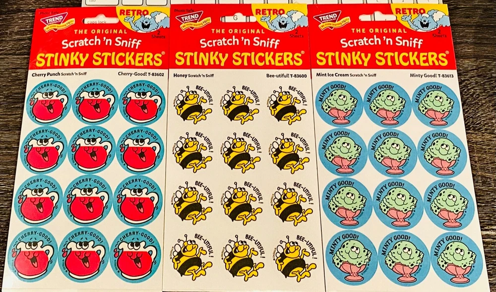 This lot of 3 TREND Scratch n Sniff Stickers is from the Special Edition RETRO Collection ~ Stinky Stickers! Cherry Punch ~ 24 Stickers + Honey ~ 24 Stickers + Mint Ice Cream ~ 24 Stickers