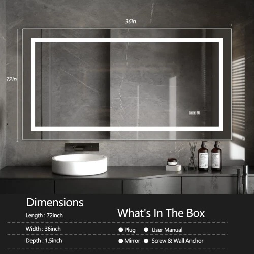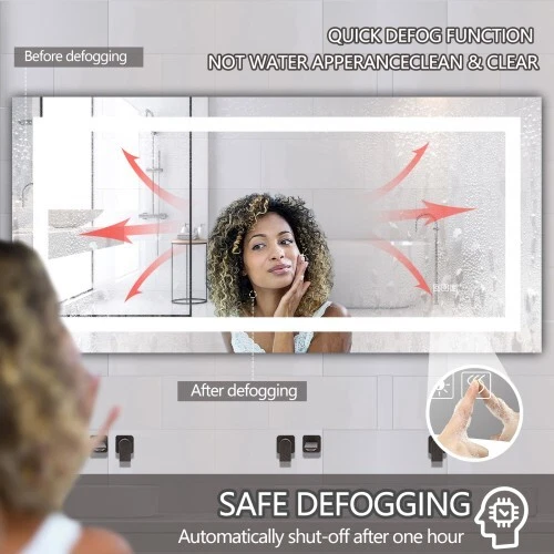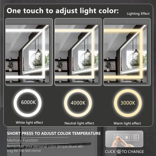 Description Lights & Super Bright: With built-in LED strip lights, LED lighted bathroom mirror gives out the lighting. The lighting mirrors are bright enough for makeup or shave or beauty care. Shatterproof & Corrosion Proof:Our mirror is made from stronger glass, that is armored glass. It will not get broken easily. Even it is broken, it will not shatter to piece, no harm, more safe to use. With epoxy coat, this mirror is corrosion proof. It will not get corroded after 30days acid test. Colors Changeable and Brightness Dimmable: This LED illuminated mirror is multifunctional. You can press the button to change the color temperatures: Warm(3000K), natural (4200K) and white(6400K). You can also dim the bright to your comfortable level. All these will be easily controlled by the touch button. The smart memory function will record the lighting setting and keep the previous lighting status after turning off and on. Easy to Install and Powered by Hard Wire Features Lights & Super Bright Colors Changeable and Brightness Dimmable Easy to Install and Powered by Hard Wire Press the button to change the color temperatures: Warm(3000K), natural (4200K) and white(6400K).