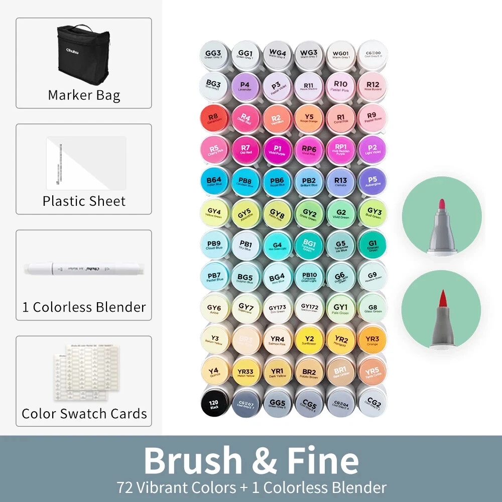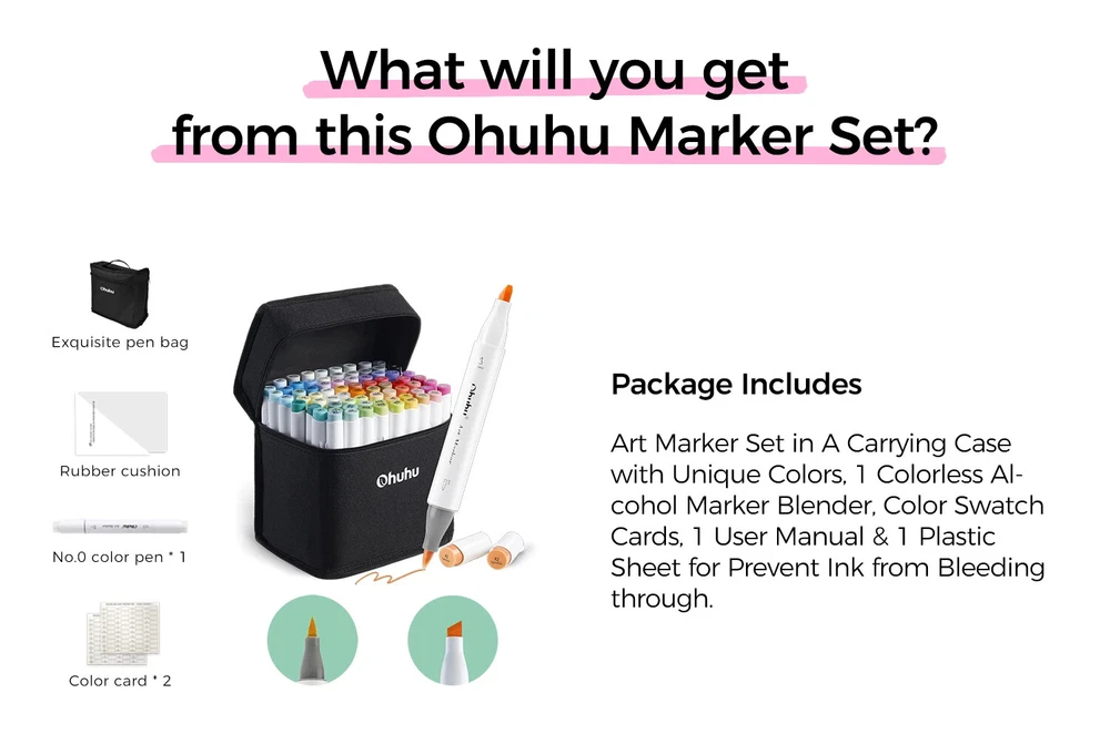 Main Featrues 【Honolulu Series】BRUSH & CHISEL , DOUBLE-TIP, DOUBLE THE FUN Widen your artistic horizons with the dual-tip marker design! Choose the brush tip for sweeping, calligraphic strokes or quickly color in large areas with the wide chisel tip. What's more, now Ohuhu replacement brush tips is available, so you can easily replace the worn-out tips to ensure consistent and precise lines whenever you create. The only limit is your imagination 【Honolulu B Series】BRUSH & FINE , DOUBLE-TIP, DOUBLE THE FUN Widen your artistic horizons with the dual-tip marker design! Choose the brush tip for sweeping, calligraphic strokes or the fine tip for details. What's more, now Ohuhu replacement brush tips is available, so you can easily replace the worn-out tips to ensure consistent and precise lines whenever you create. The only limit is your imagination REFILLABLE INK FOR A LIFETIME OF CREATIVITY With 51 Ohuhu popular colors available for refills now and more on the way, your creativity knows no bounds. Enjoy a wide range of hues and keep your markers going for years to come. Whether you're exploring the rich colors of Honolulu, Oahu, the Kaala, or the bold hues of Molokai Series, they are refillable now. Switch between sets seamlessly and unlock endless artistic possibilities. Elevate your artwork with Ohuhu markers, designed for a lifetime of creativity SEAMLESSLY BLENDING Say goodbye to unsightly splotches and uneven coloring. Our high-quality ink seamlessly blends to create beautiful, professional-grade artwork, perfect for both beginners and experienced artists; Also, no more frustrating smudges or wet ink ruining your work. Our alcohol-based ink dries quickly, ensuring that your art is always clean, crisp, smudge-free, and ready to display 72 VIBRANT COLORS + 1 COLORLESS BLENDER The rainbow is at your fingertips - choose from 72 brilliant colors and bring your ideas to life. The color spectrum is yours to explore with 72 brilliant shades to choose from, plus a colorless blender for better blending effects. From coloring books to professional masterpieces, our brush markers will breathe life into your artwork EASY IDENTIFICATION, ORGANIZATION & PORTABILITY Don't waste time searching for the perfect color. Our markers come with color-coded caps to keep you organized and efficient. Plus, the free carrying case makes these markers perfect for any coloring adventure or as a thoughtful gift for any artist Product Description