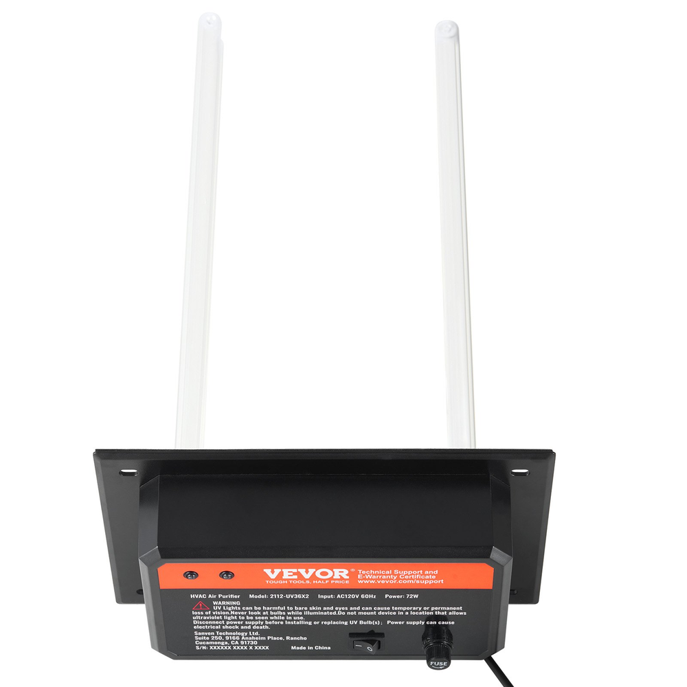 Efficient Air Purification Whole House Coverage: Designed to purify the air in your entire home, ensuring a clean and healthy indoor environment. Powerful UV Light: Equipped with dual 36W UV bulbs, totaling 72W of power, to effectively eliminate airborne pollutants, bacteria, and viruses. Reliable and Durable Quality Long-lasting Bulbs: Includes 2 spare bulbs, ensuring prolonged use and consistent air purification. Durable Construction: Made with high-quality PC material and robust housing dimensions of 10.16 x 6.14 x 2.09 inches. Easy to Use and Maintain Simple Installation: Comes with a 4.92 ft (1.5 m) power cord for convenient placement in your HVAC system. Maintenance-Free: Minimal maintenance required, allowing you to enjoy clean air effortlessly. Wide Application Universal Fit: Compatible with most HVAC systems, making it an ideal choice for a variety of home setups. Versatile Use: Perfect for homes, offices, and other indoor settings requiring high air quality. Product Specifications Power: 72W (36W per bulb) Bulb Quantity: 2 (includes 2 spare bulbs) Color: Black Item Model Number: 2112-UV36X2 Dimensions: 10.16 x 6.14 x 19.61 inches (258 x 156 x 498 mm) Weight: 2.54 lbs (1.15 kg) Wavelength: 254nm Bulb Length: 5.71 inches (145 mm) Main Material: PC Specifications: - Length: 48.0 in, Width: 30.0 in, Height: 13.0 in