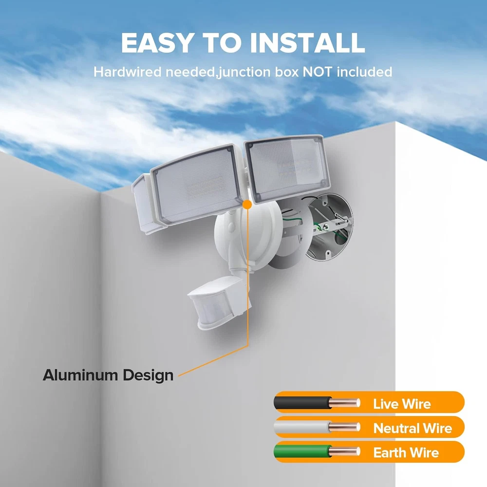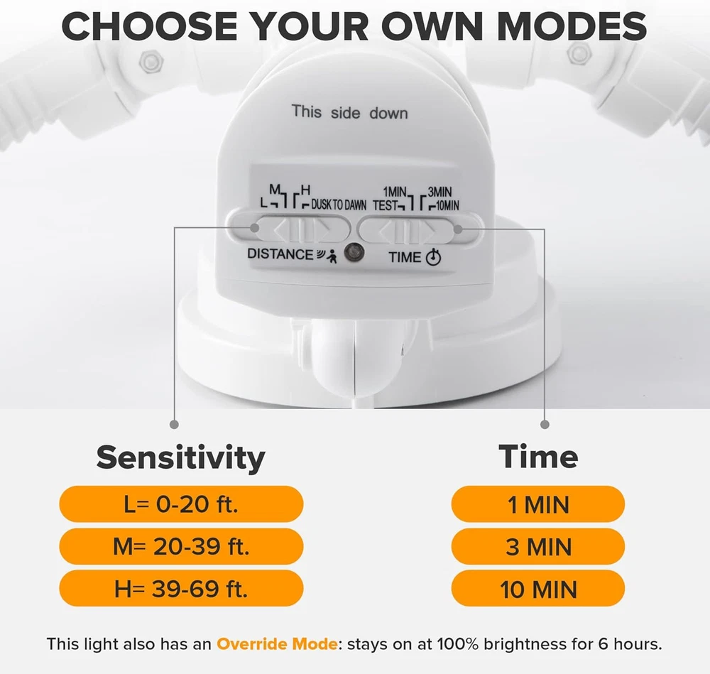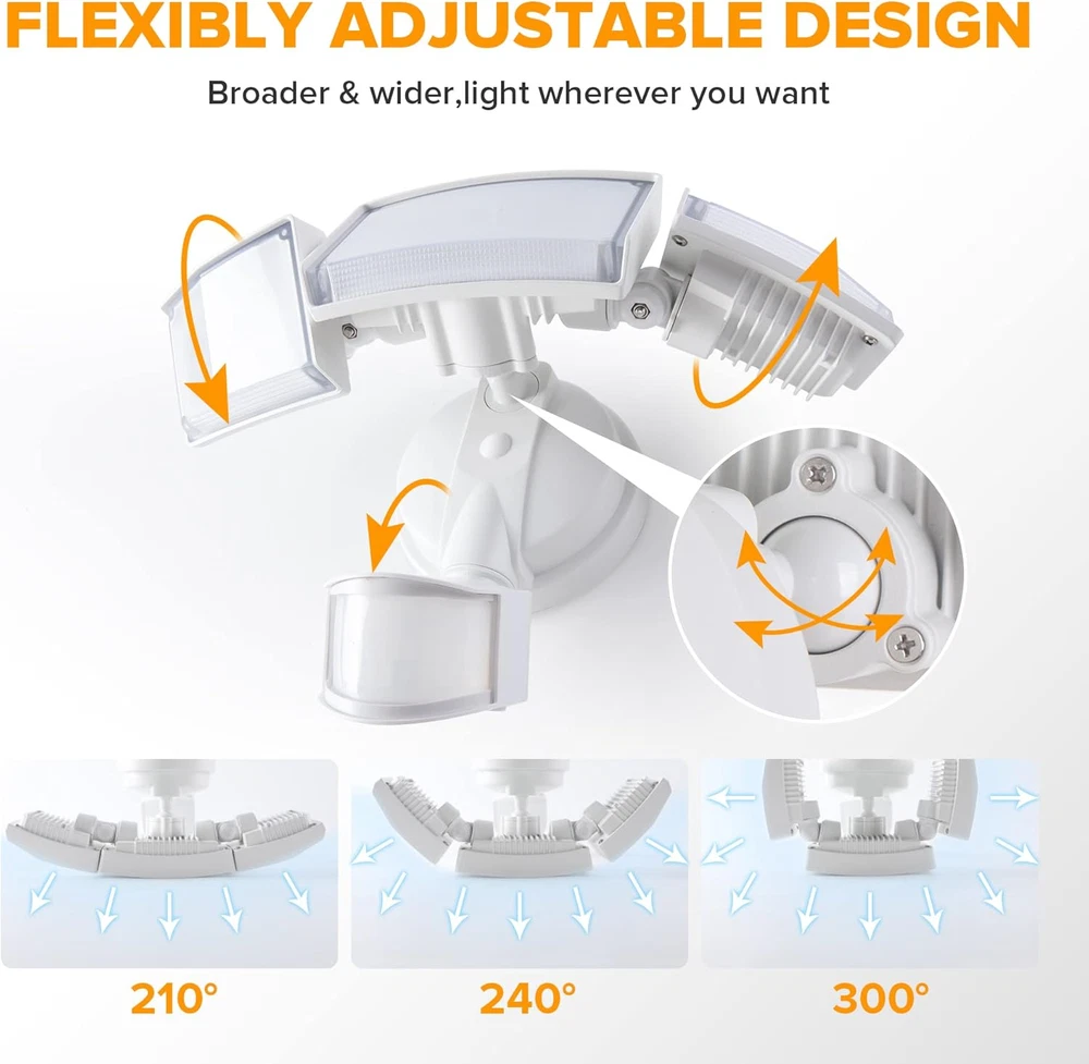 ENERGY SAVING: LED units output 72W, 7500 Lumens, 5000K brightness(daylight white), equivalent to 720W incandescent bulb. Also save your electricity bill by up to 88%. MOTION-ACTIVATED: The wide sensing angle of 180 degrees detects motion up to 0ft-69ft away, detecting motion more accurately with its sensitive motion sensor. The adjustable timer can be set for 1, 3 or 10 minutes. 4 LIGHTING MODES: Test Mode, Security Mode, Dusk to Dawn Mode and Manual Override Mode. Manual override mode allows light to operate constantly for selected period of time. Deactivates during daylight hours. More choices can meet different demands for each customer. Choose the most appropriate mode for your needs. METAL AND ROTATABLE DESIGN: Adjustable heads provide a customizable coverage area. Aluminum material, IP65 waterproof and 50,000hrs lifespan, make this security light pecfect for the porch, back yard, front door, garage, driveway, walkway, step, etc. HIGH-QUALITY SERVICE: We provide 7*24h after-sales service. Contact us if any issue arises. Product Description LUTEC Motion Sensor Outdoor Lights 1 Higher Quality 2 Adjustable Design 3 IP65 Waterproof 1 Easy Installation 2 Two Ways Mounting 1 Garage 2 Backyard 3 Stair 4 Swimming Pool