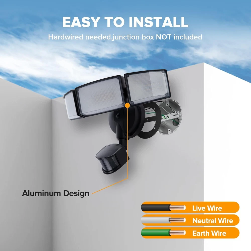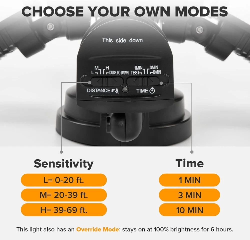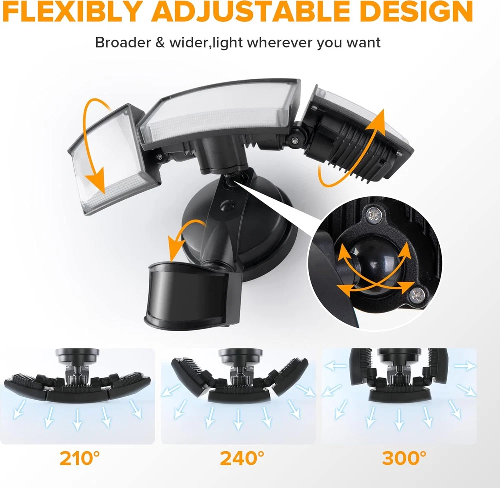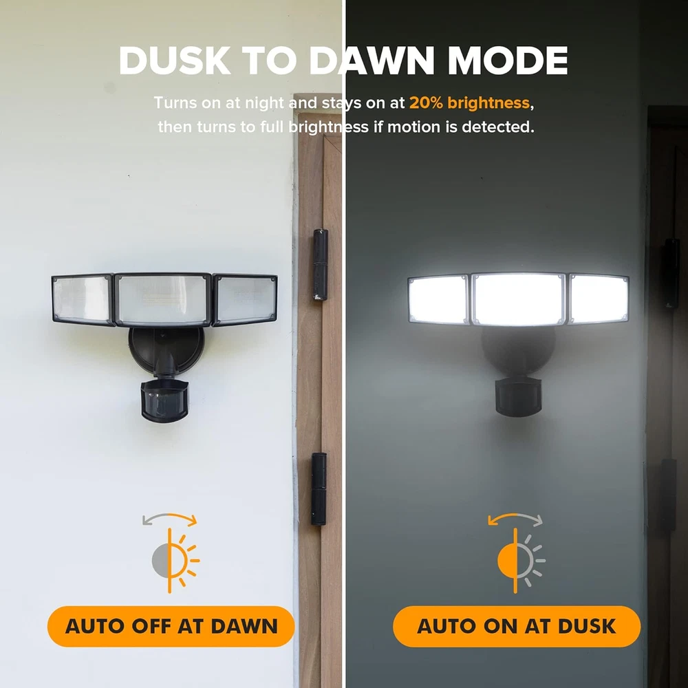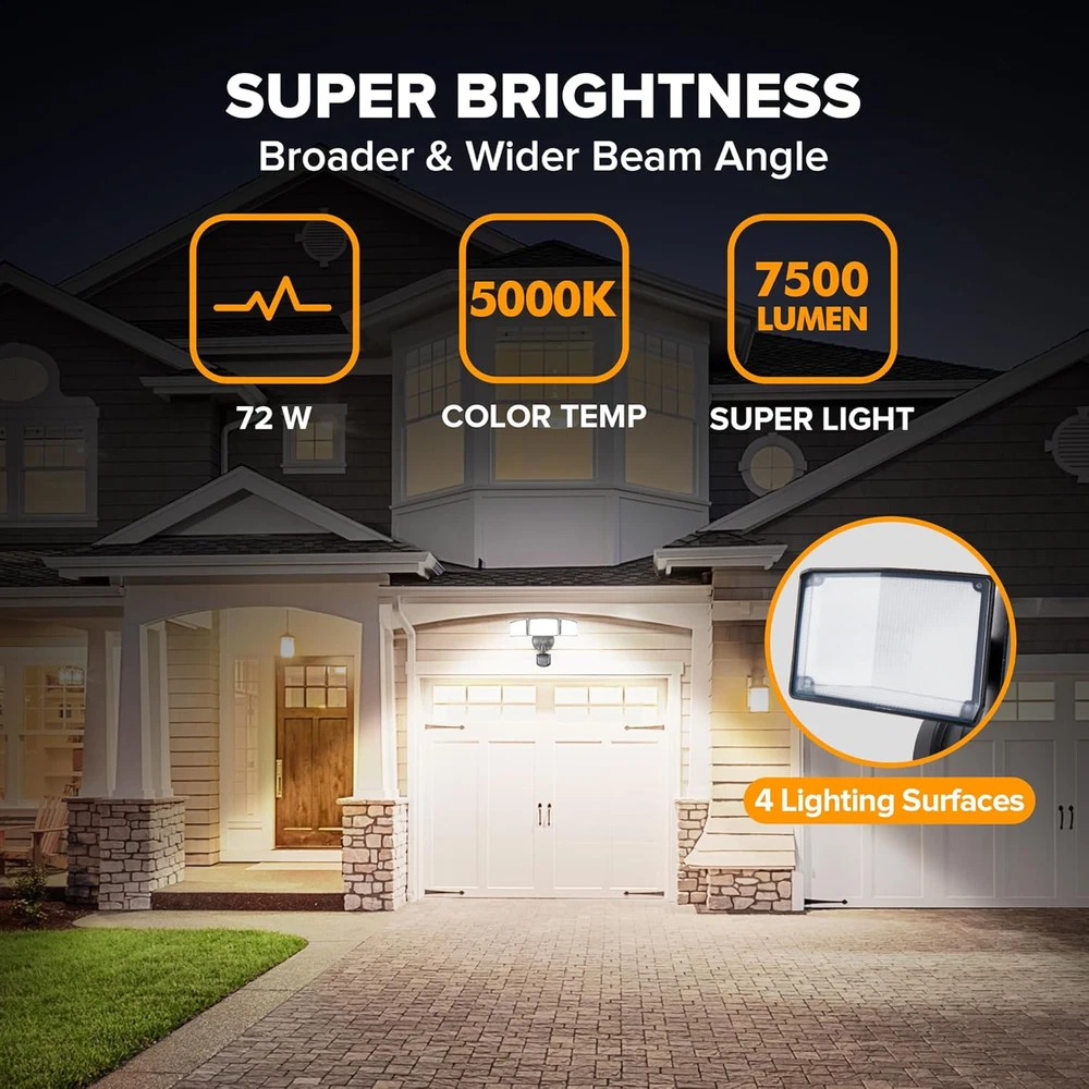 ENERGY SAVING: LED units output 72W, 7500 Lumens, 5000K brightness(daylight white), equivalent to 720W incandescent bulb. Also save your electricity bill by up to 88%. MOTION-ACTIVATED: The wide sensing angle of 180 degrees detects motion up to 0ft-69ft away, detecting motion more accurately with its sensitive motion sensor. The adjustable timer can be set for 1, 3 or 10 minutes. 4 LIGHTING MODES: Test Mode, Security Mode, Dusk to Dawn Mode and Manual Override Mode. Manual override mode allows light to operate constantly for selected period of time. Deactivates during daylight hours. More choices can meet different demands for each customer. Choose the most appropriate mode for your needs. METAL AND ROTATABLE DESIGN: Adjustable heads provide a customizable coverage area. Aluminum material, IP65 waterproof and 50,000hrs lifespan, make this security light pecfect for the porch, back yard, front door, garage, driveway, walkway, step, etc. HIGH-QUALITY SERVICE: We provide 7*24h after-sales service. Contact us if any issue arises. Product Description LUTEC Motion Sensor Outdoor Lights 1 Higher Quality 2 Adjustable Design 3 IP65 Waterproof 1 Easy Installation 2 Two Ways Mounting 1 Garage 2 Backyard 3 Stair 4 Swimming Pool