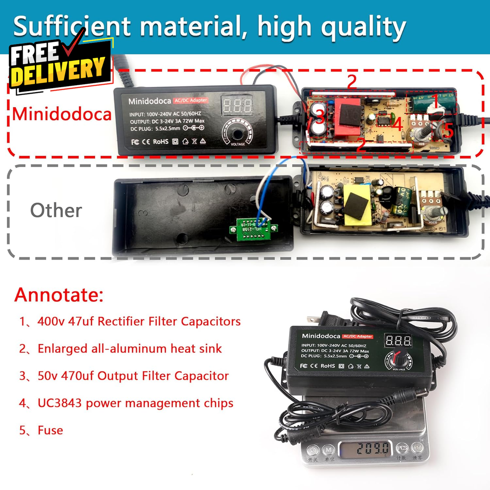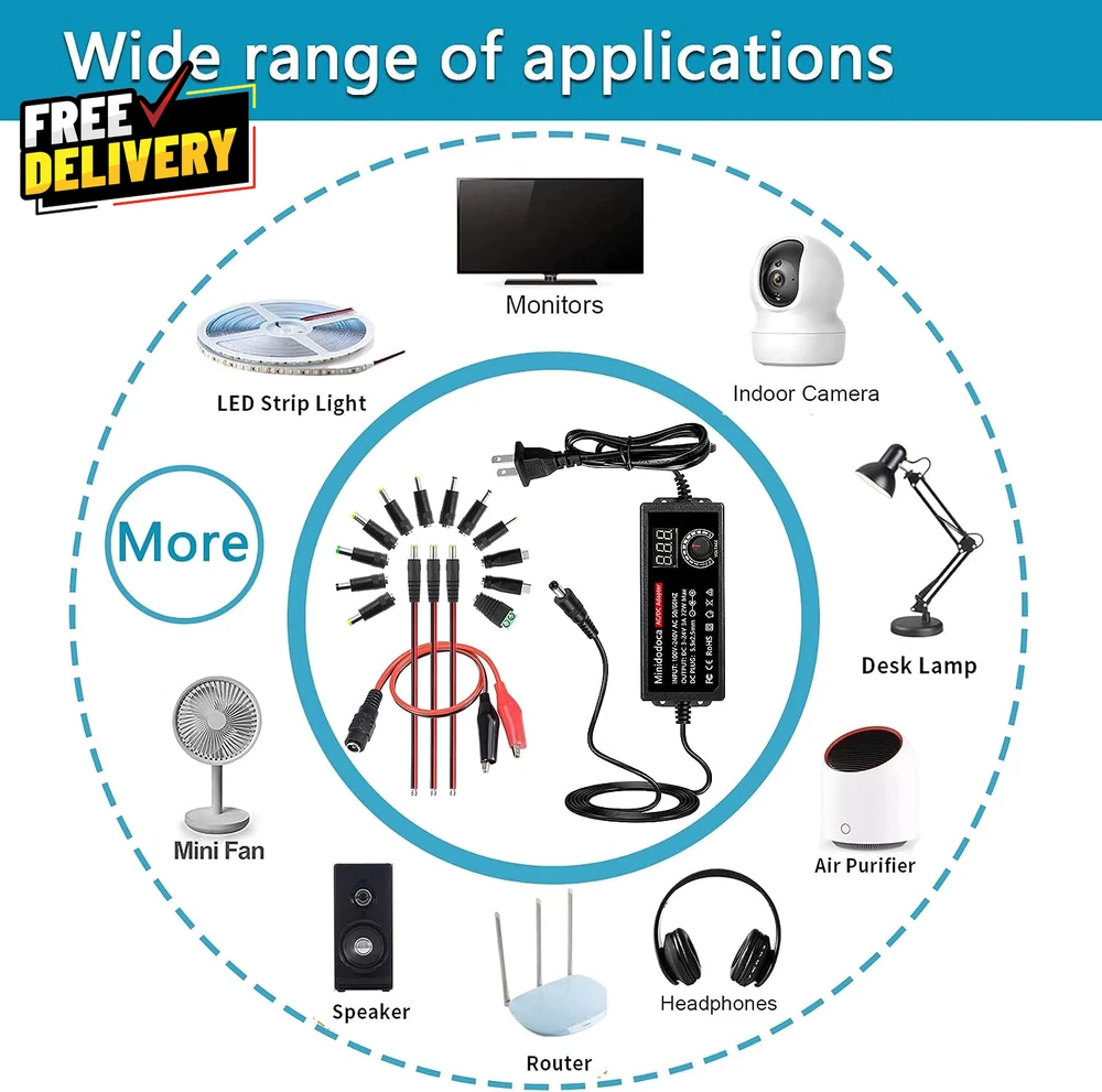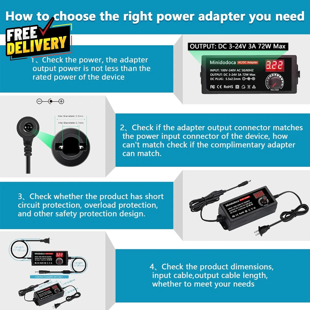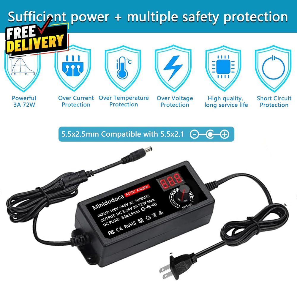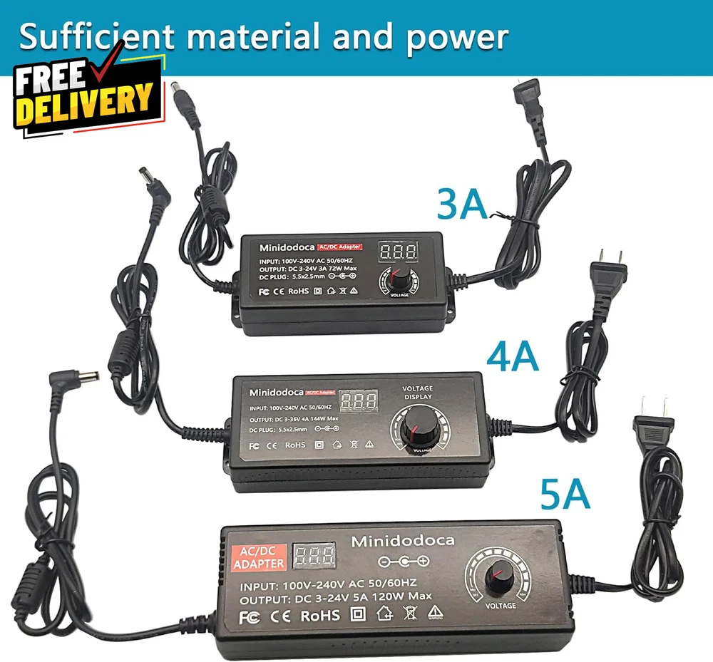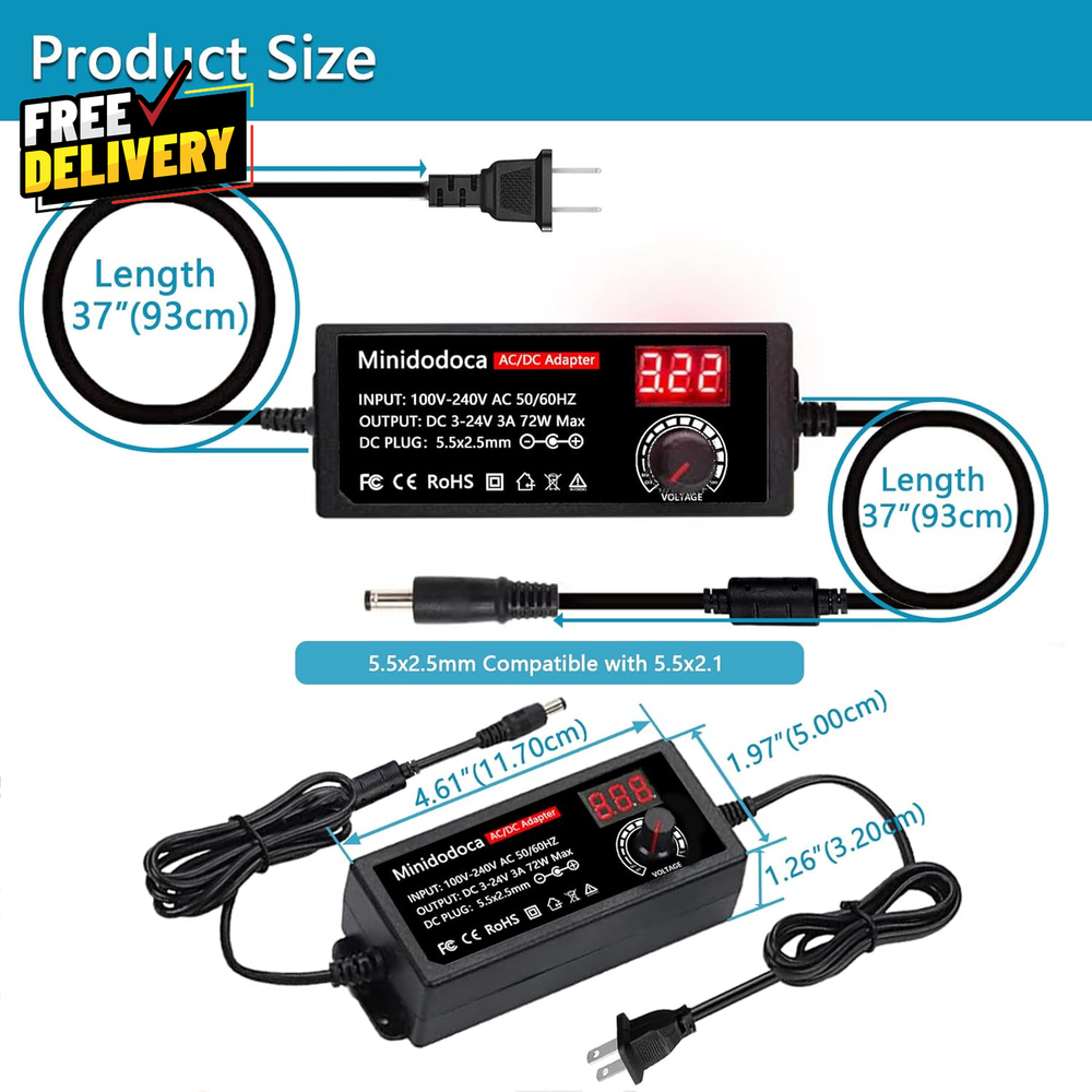 Store New Arrivals Add to Favorite View Feedback Contact 72W Power Supply Adjustable 3V ~ 24V Variable Universal Switching AC/DC Adapter Description 【Adjustable Voltage】Input: AC 100~240V, 50/60Hz, Output Voltage can be adjusted from 3V to 24V DC (such as 3V 4V 4.5V 5V 5.5V 6V 9V 12V 14V 15V 19V 20V 24V). Wattage Max 3A, 72W; It can supply with amps less than 3A, such as 300mA, 500mA,1A, 1.5A, 2A, 2.5A, 3A. 【Upgraded Version Power Supply】Built-in protruding rotatable button for adjusting the voltage suitable for your device ,The LED displays real-time voltage,which helps you control real-time condition of charging. The knob can be adjusted more evenly, and it can reach 13V ~ 14V by rotating 50%. Increase the off gear to turn off the power without pulling the plug. 【Multiple DC Tips】Equipped with 16 frequently used plugs: Micro-USB, Type-C, DC terminal connector, 6.5x4.4mm+Pin,6.3x3.0mm,5.5x1.7mm, 5.5x3.0mm+Pin, 4.8x1.7mm, 4.0x1.7mm, 3.5x1.35mm, 3.0x1.1mm, 2.5x0.7mm,5.5X2.5mm female to alligator clip,3pcs 5.5X2.5mm male connector with cable. 【Safety Protection Design】Built-in protruding rotatable button for adjusting the voltage suitable for your device,the LED displays real-time voltage,which helps you control real-time condition of charging. The power supply built-in multiple safety protection systems:Automatic over voltage cut-off, over current cut-off,over temperature cut-off,short circuit cut-off.No noise, no spontaneous combustion,no explosion,no fire hazard,safe to use 【Widely Used】The 72W all-in-one multipurpose adapter fit for most AC/DC home appliances. Can be perfect for Wireless Router, ADSL Cats, HUB, Security Cameras, WiFi Camera, DVD Player, Audio/ Video device, 3D Printer, CCTV System, LCD Monitor, Bluetooth speaker, Sound bar, digital piano, portable Keyboard, IR illuminator, LED strip light and other household / portable devices. (Check dc jack before buy: 5.5x2.5mm, compatible 5.5x2.1mm) Item model number 243000 Style 72W 3~24V 3A Adjustable Adapter Current Rating 3.02 Amps Power Source Corded Electric Country of Origin China Item Weight 11.3 ounces Maximum Frequency 60 Hz Specification Met CE, FCC, RoHS Package Dimensions 5.98 x 2.68 x 2.36 inches Manufacturer 72W 3~24V 3A Adjustable Adapter ABOUT US Prior to making any purchase from our store, we’d like to introduce ourselves. My name is Shahzad Yaqub , and I am the proud owner of Epic Emporium Deals , located in the great state of Illinois, USA. I have been an active and trusted eBay seller since Jan 14, 2025 . At Epic Emporium Deals , we are committed to offering competitive prices and top-quality products . Our extensive collection features a wide variety of items, including media such as books, movies, music, and games , as well as electronics, toys, sporting apparel, clothing, tools , and general home and garden essentials —and much more! If you have any questions or require assistance, please don’t hesitate to reach out. Your satisfaction is our priority, and we look forward to providing you with an exceptional shopping experience. SHIPPING We are always working hard to ensure your package arrives as soon as possible. Please understand that some factors like weather, high postal traffic, and the performance of shipping companies are outside of our control. We offer free shipping to the lower 48 states and ship within 2 business days of payment, usually sooner. We do not accept P.O. Boxes. Please provide a physical address. For shipping outside of the continental USA, we only use eBay's Global Shipping Program. The item is shipped to IL and then sent to the rest of the world. International customers are responsible for all duties and taxes. Continue to 'check out' to calculate costs for shipping the item to your country. Messages regarding eBay's Global Shipping Program MUST be directed at eBay EXCLUSIVELY. RETURNS We do not accept returns under normal circumstances. However, we will gladly consider a return if the item is received broken or if the wrong size is sent to you. In all other cases, returns will not be accepted. CUSTOMER SATISFACTION We try our very best to make sure every customer is completely satisfied. If there's a problem, message us! We're happy to help.