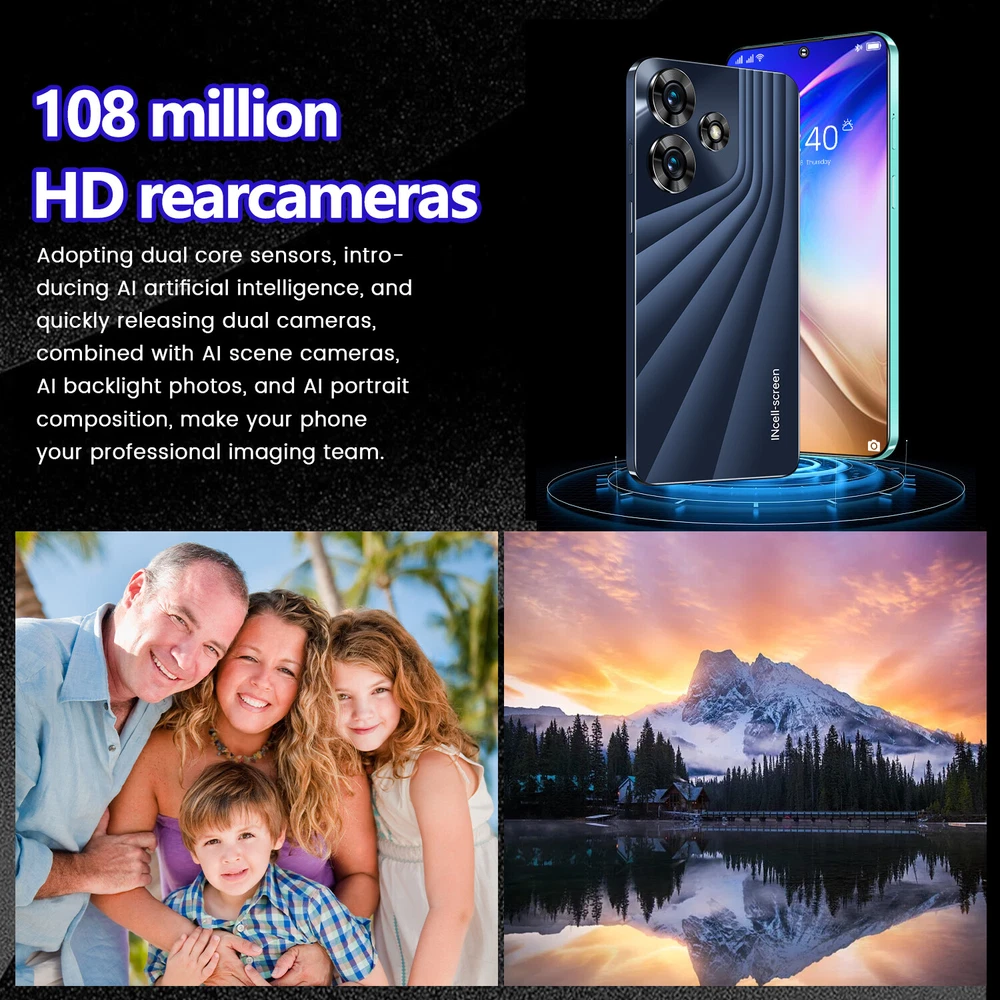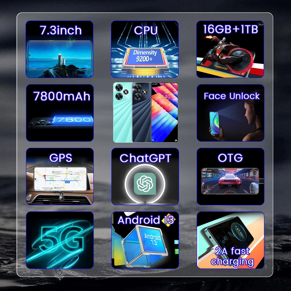 7.3" Factory Unlocked Smartphone Android Mobile Phone 16GB+1TB 4G 5G Cellphones Factory direct sales, better quality but lower price is our target and mission! Features: - 7.3 inch Full Display The Hot 30 delivers the viewingexperience you always wanted, With a massive 93%screen-to-body ratio on a 7.3"inch screen - 48MP Front CameraClear and Stylish Selfies The world-leading 50MP front camera turnsyour every selfe into a work of art Experience greaterbrightness, color vibrancy, clarity and dynamic range.even in the dimmest light, Whenever you needit. your Hot 30 is right there with you, capturing everymoment with crystal-clear precision, Turn your selfiesinto masterpieces and shine in every photo - Rear HD camera The Hot 30 features a 108MP camera combination. The main camera sportsa large f/1.8 aperture and 1.28um pixels, This strong combination boosts photosensitibityin backlight or low light, Just point and shoot, and Hot 30 will makesure your pictures remain clear and bright - Face Access The Hot 30 also supports facial recognitionUpon activation, Hot 30 scans your facial features and unlocks instaneouslyAccessing your phone has never been so easy, or so fun - Powerful Performance The Dimensity 9200+ Deca Cores mobile platform with 10mm process technology makesyoung people who love the young and stiand other popular games.The game ison and lower - Android 13.0 The new interactive design makes the operation simple and simple, the use of themobile phone is so simple and straightforward, everything is handy - Dual SIM card supports TF card Dual card dual standby, card slot does notdistinguish between the main and the deputy, supporting the worlds 50 major communication carrier networks Specification: 1.Model No.:Hot 30 2.Platform : Dimensity 9200+ 3.Standby: Dual sim dual standby(A slot support SIM card, another slot support SIM card or TF card) 4.Screen: 7.3 HD+ Full Display 2400*3200 5.Speaker: 1511 Box Speaker 6.Frequency: GSM850, 3G: WCDMA2100MHz,5G LTE 5G7.Vibration: Support 8.Colors: Black/Tuhao Gold/Dark Purple/white 9.Memory: 16GB RAM+1TB ROM 10.Multi Media: MP3/MP4/3GP/FM Radio/Bluetooth 11.Camera: 50MP+108MP 12.Multi Function: Full screen, Face recognition, Dual SIM, Wifi, GPS, Gravity Sensor, Alarm ,Calendar ,Calculator ,Audio recorder ,Video recorder, WAP/MMS/GPR, Image viewer,E-Book,World clock,Tasks card rear flash IML rear cover 13.Languages: Multi-language support 14.Others: Android OS 13.0 System 15.Battery:7800Mah Lithium-ion battery 16.Type-C plug 17.Ultra unibody Package Included: 1 x Smartphone, 1 x Charger Adapter 1 x Headphones 1 x User Manual 1 x Phone Case 1 x Protection Film